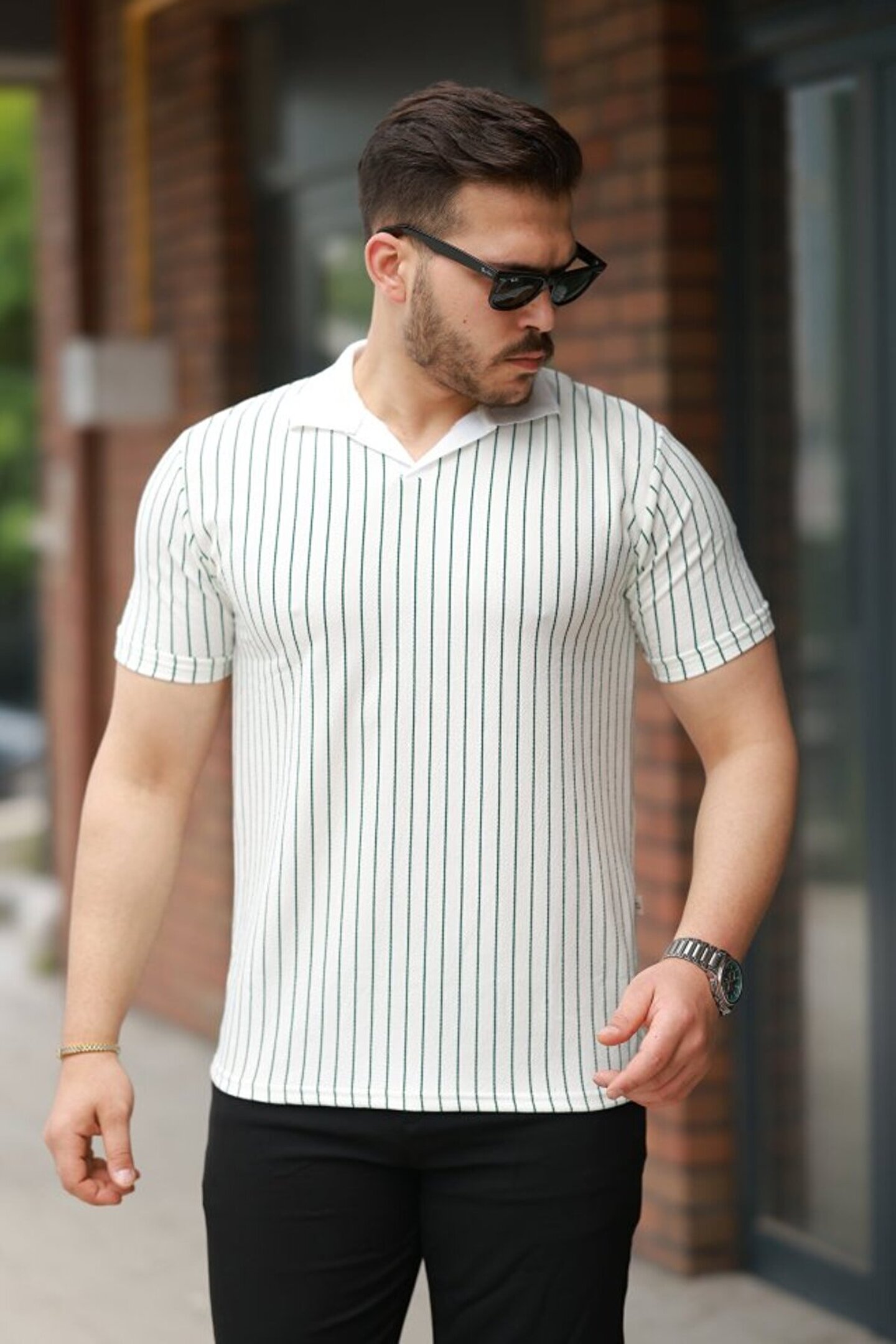 Erkek Yakalı çizgi Desenli Kısa Kollu Tişört