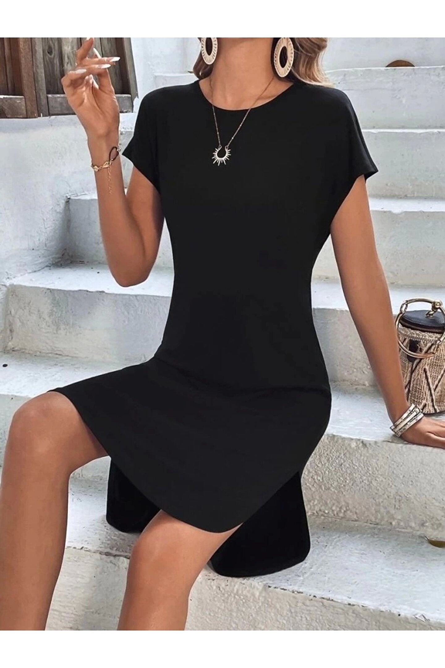 Kadın Kısa Kollu Bisiklet Yaka Viskon Iki Iplik Elbise