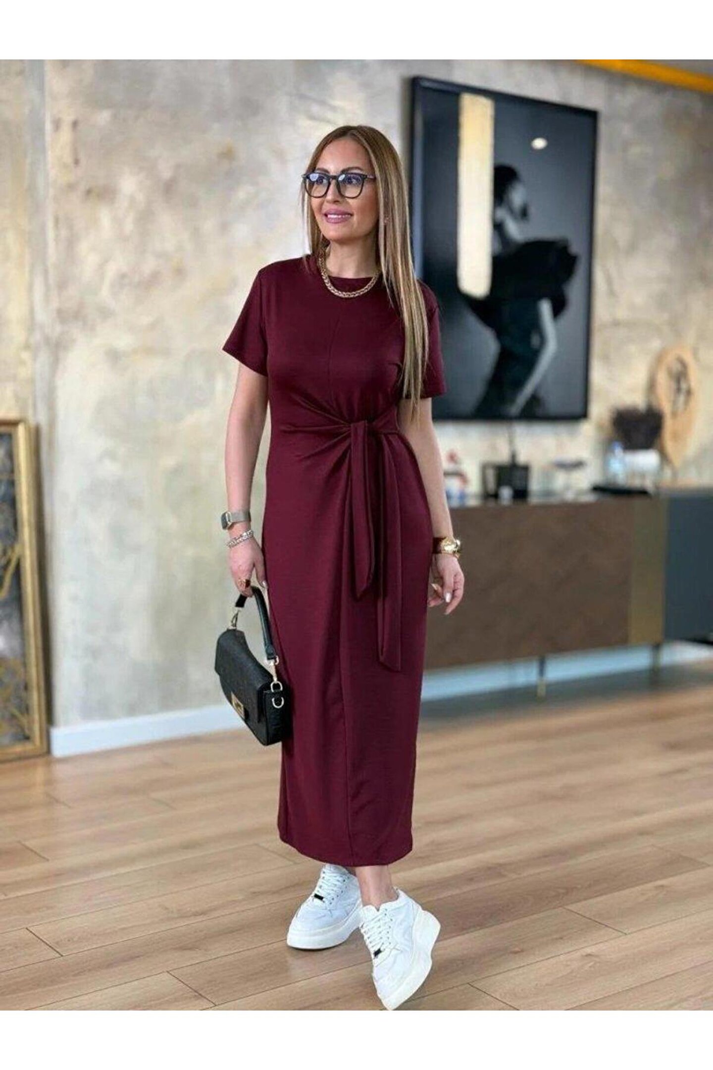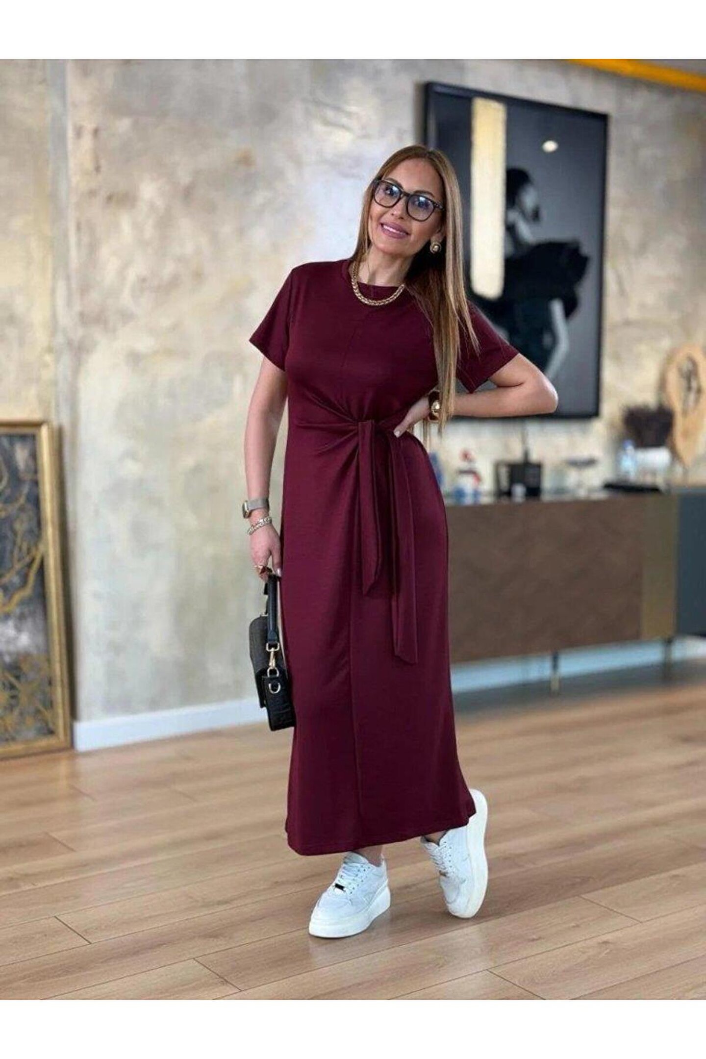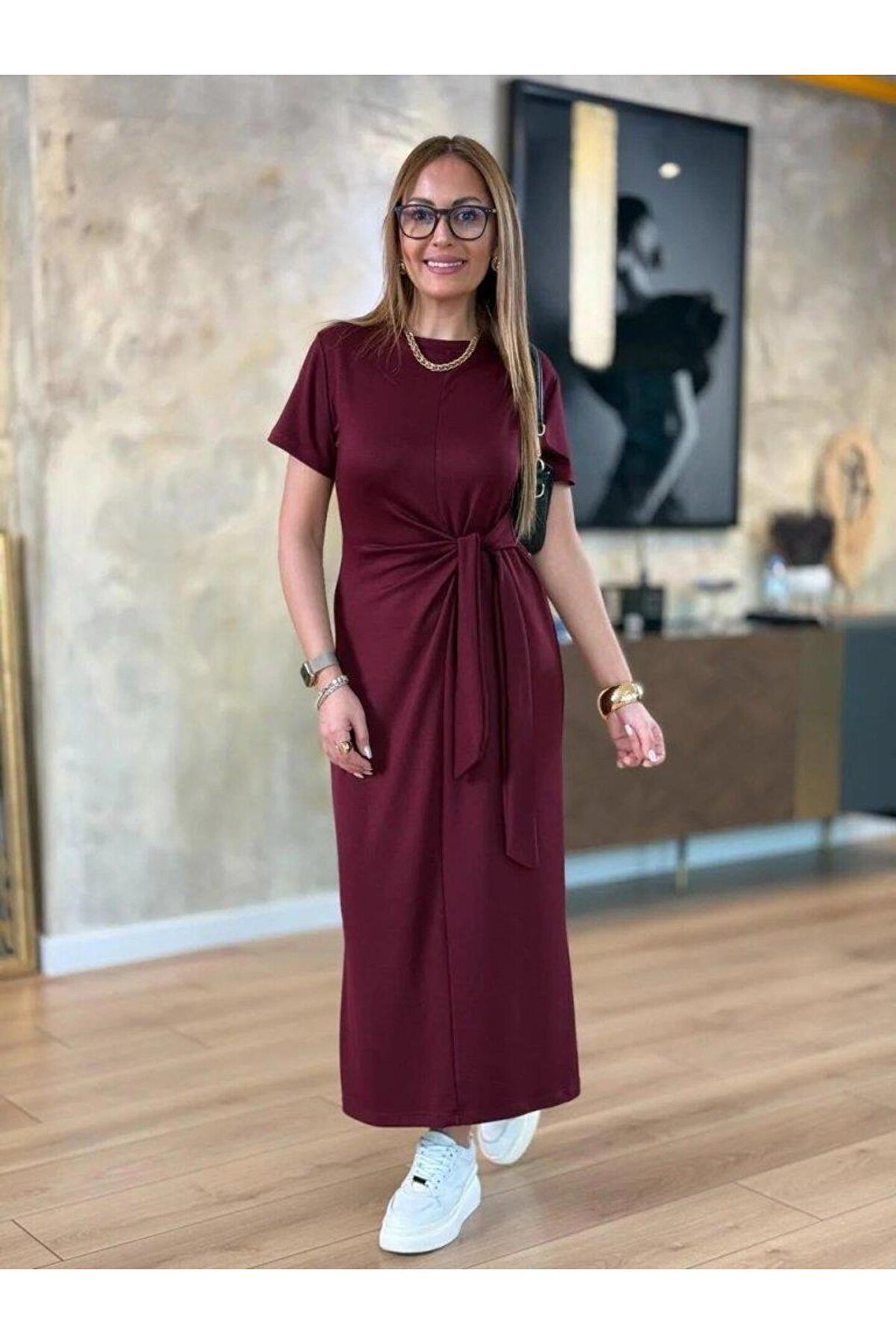 Kadın Kısa Kollu Bisiklet Yaka Yandan Bağlamalı Viskon Iki Iplik Elbise