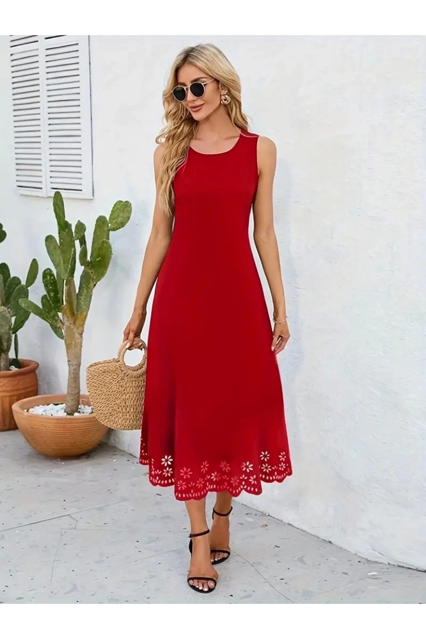 Kadın Kolsuz Etek Ucu Lazer Kesim çiçek Desenli Midi Boy Ithal Krep Elbise