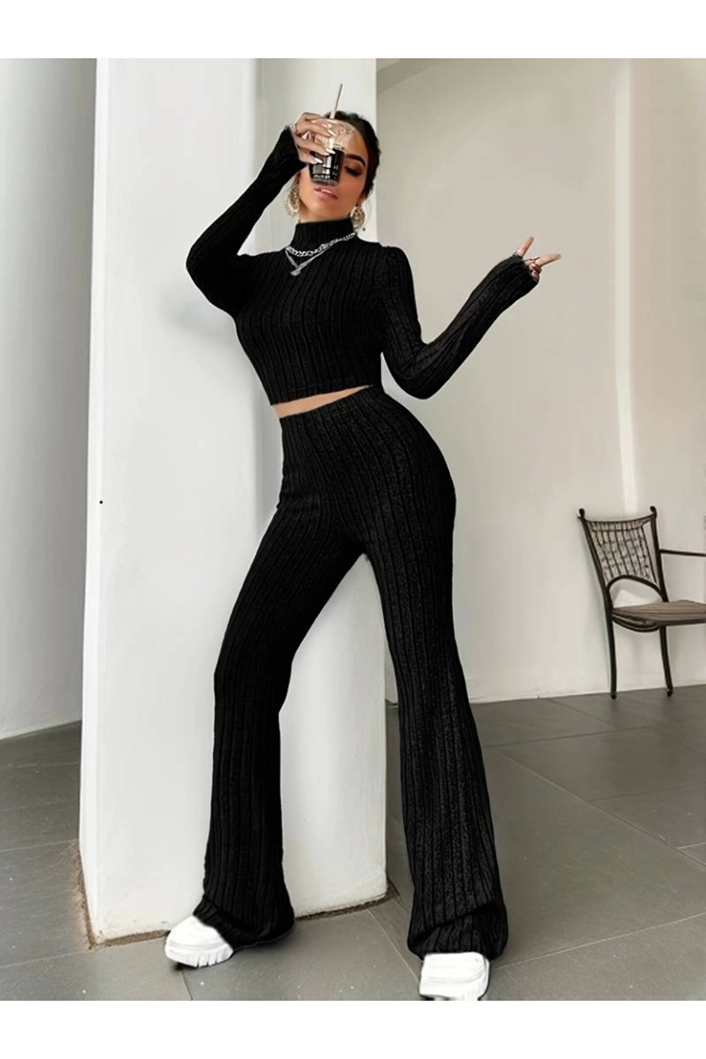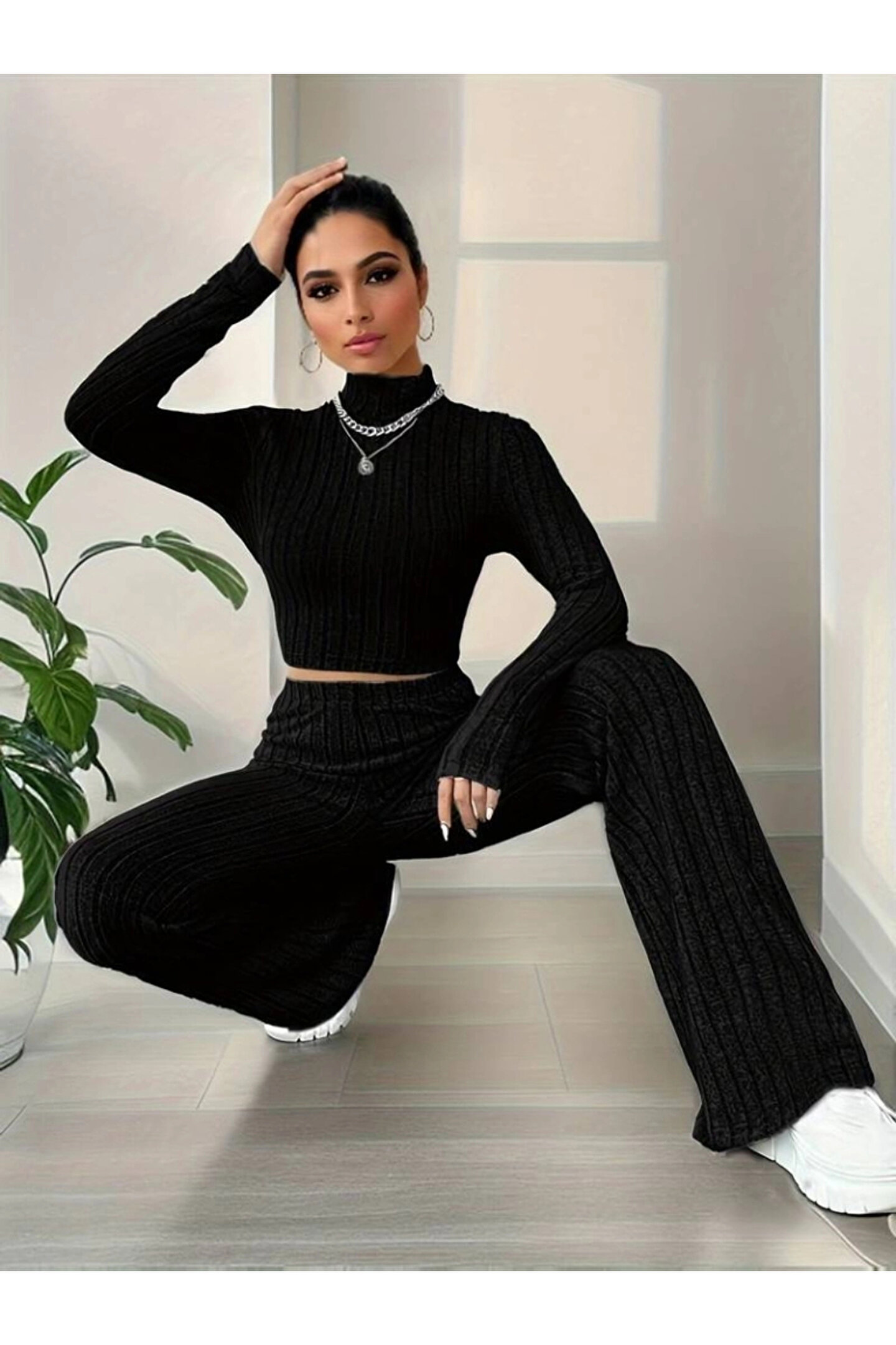 HAZEGO Kadın Uzun Kollu Balıkçı Yaka Krop Ve Pantolon şardonlu Kaşkorse Ikili Takım