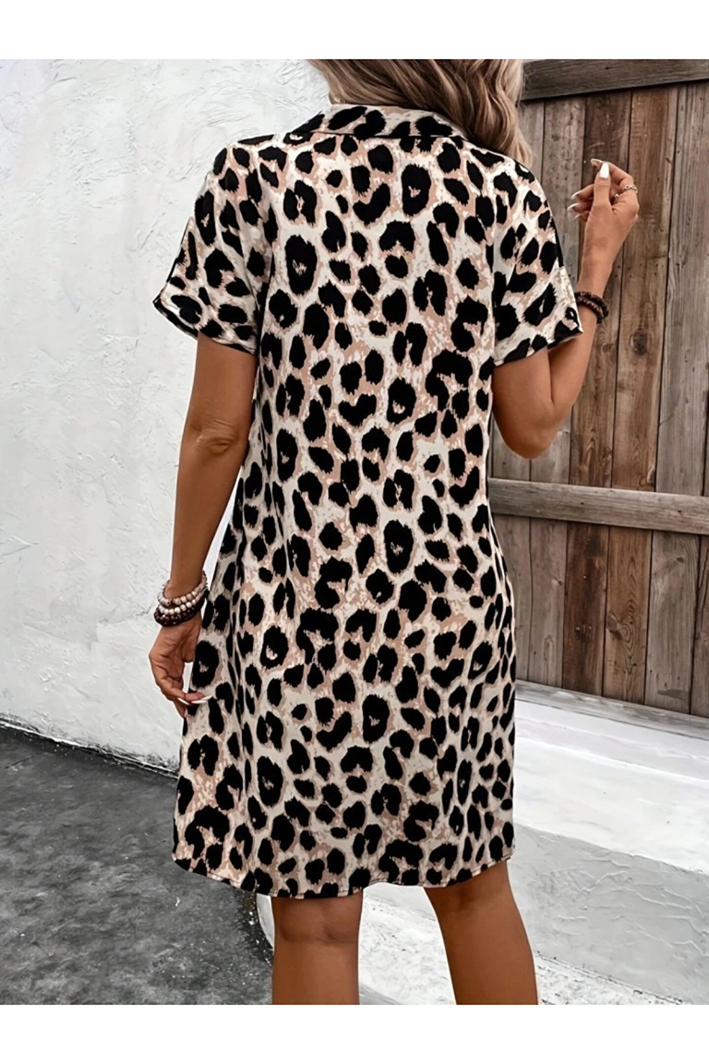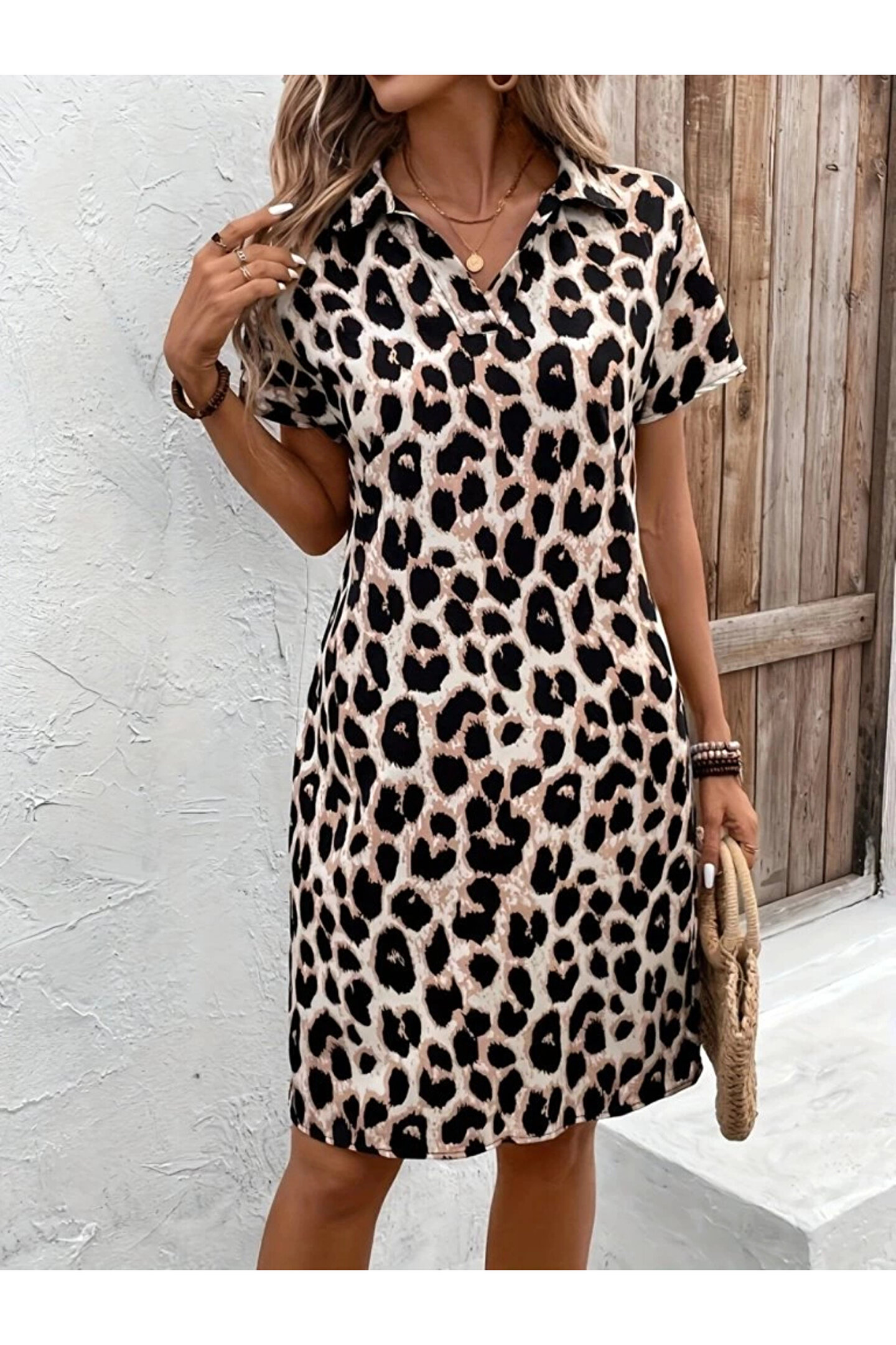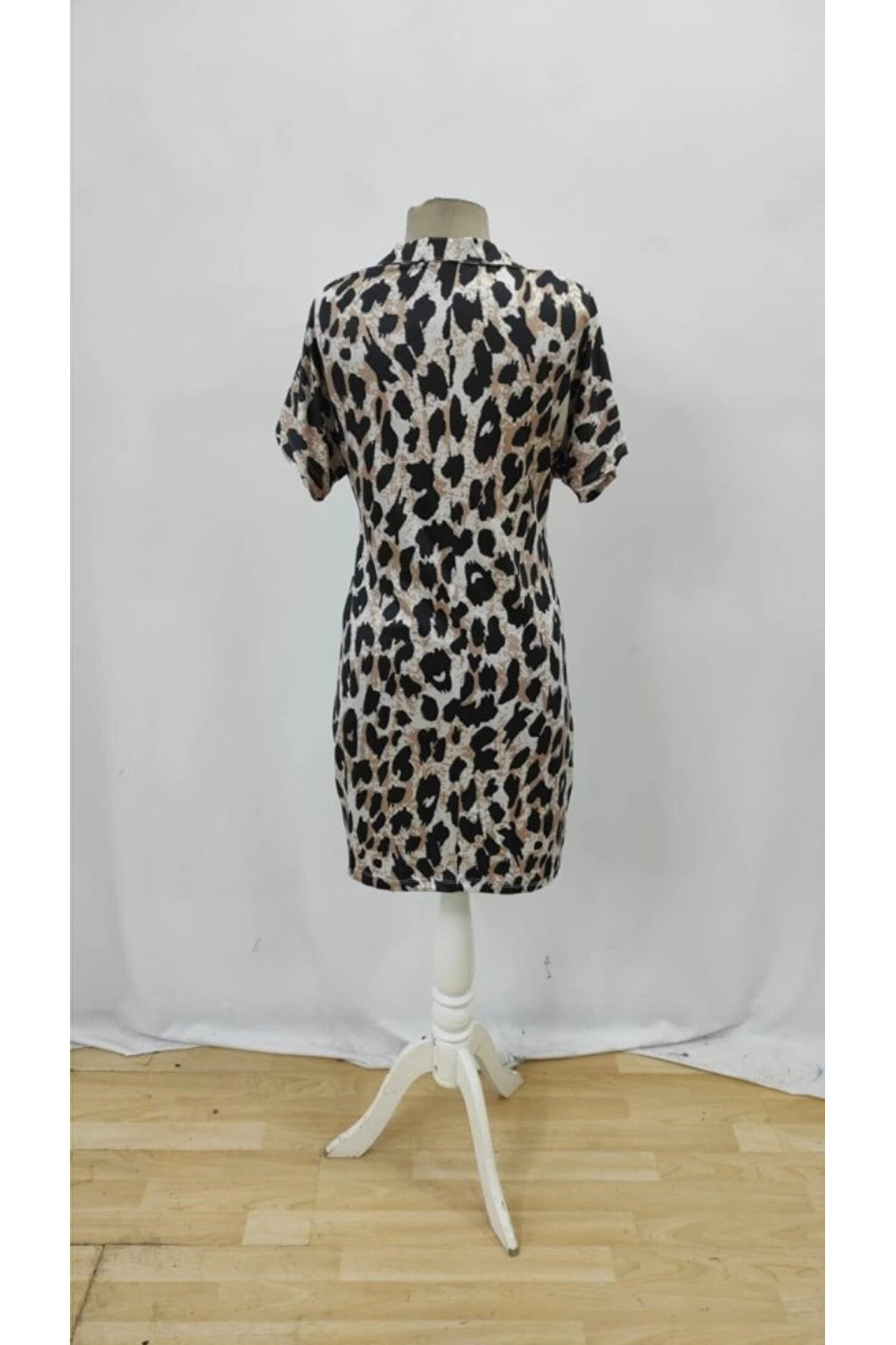 Kadın Kısa Kollu Yakalı Leopar Desenli Süprem Elbise