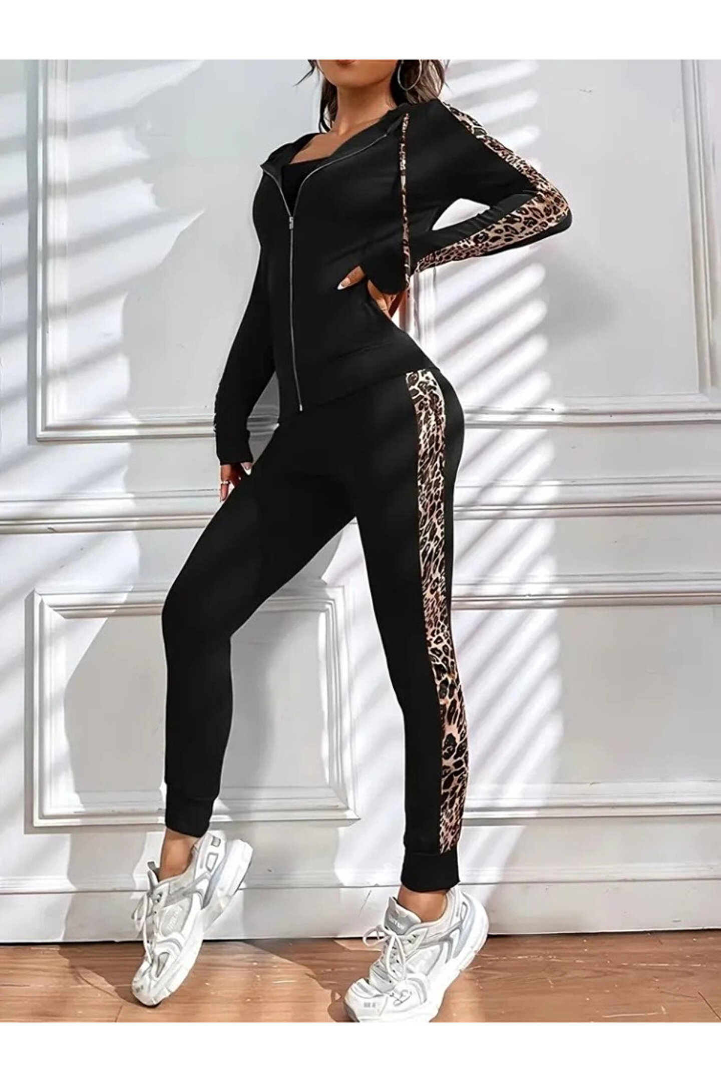 HAZEGO MDB Kadın Uzun Kollu Kapşonlu Fermuarlı Bağcıklı Viskon Iki Iplik Bluz Ve Pantolon Tayt