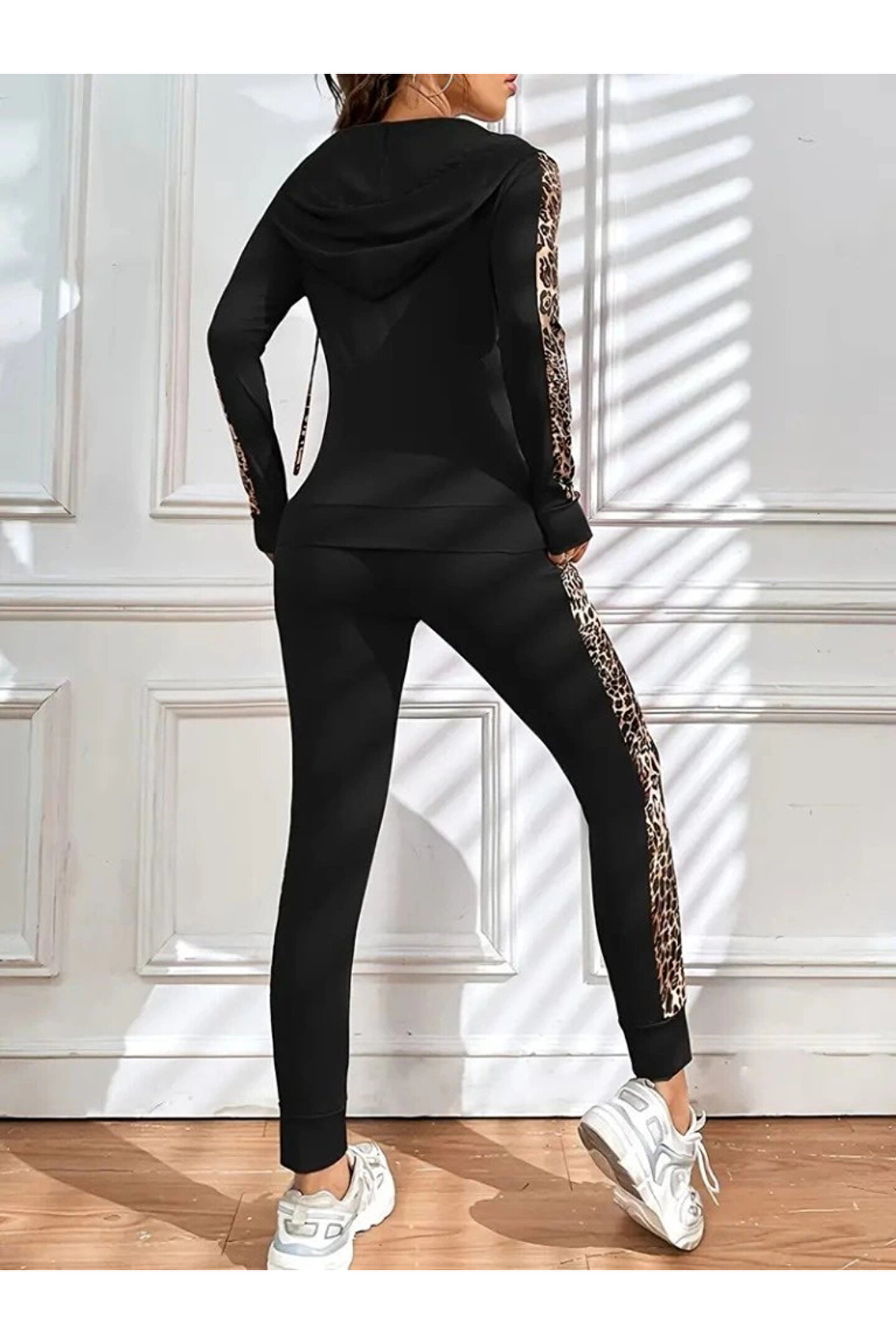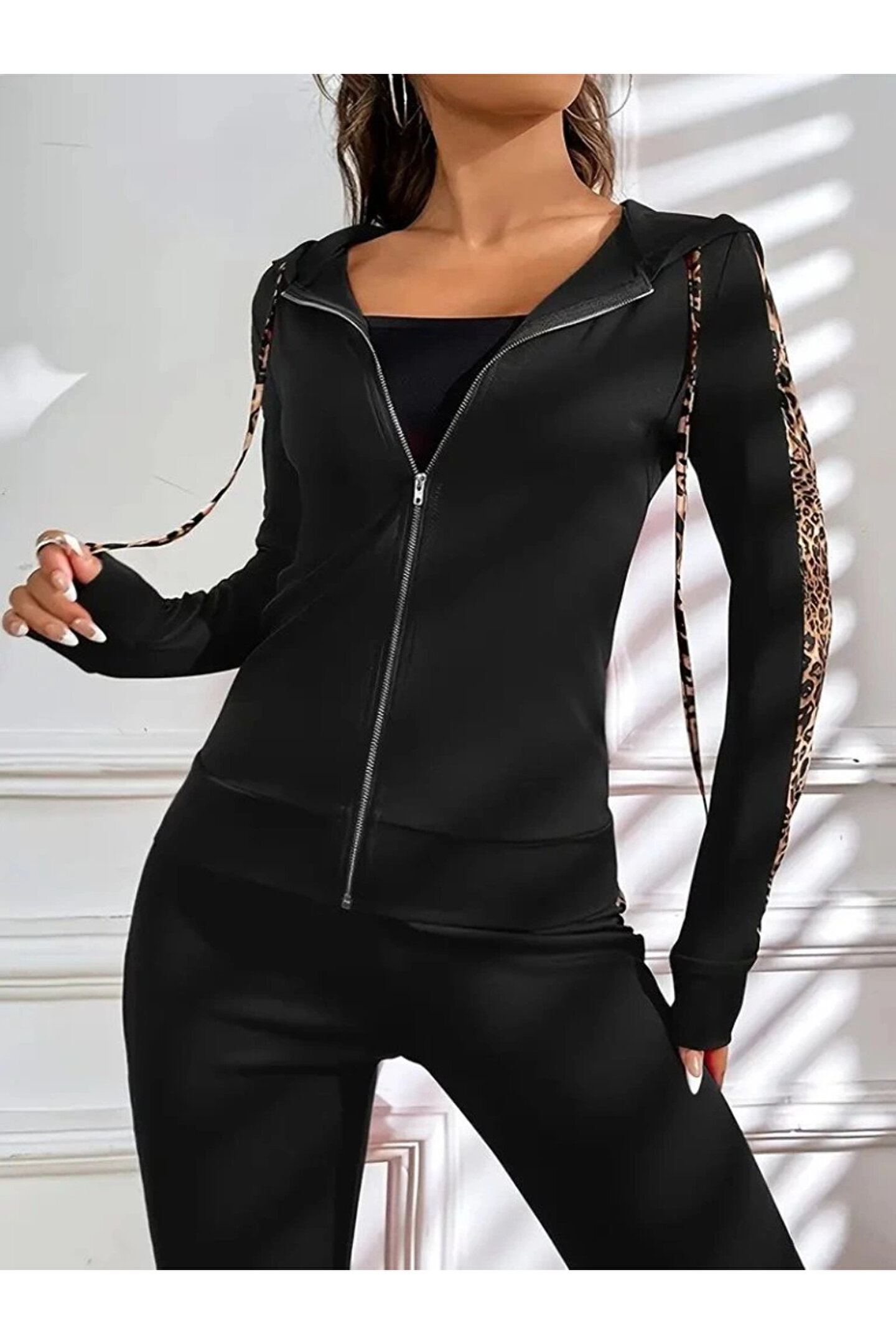HAZEGO MDB Kadın Uzun Kollu Kapşonlu Fermuarlı Bağcıklı Viskon Iki Iplik Bluz Ve Pantolon Tayt