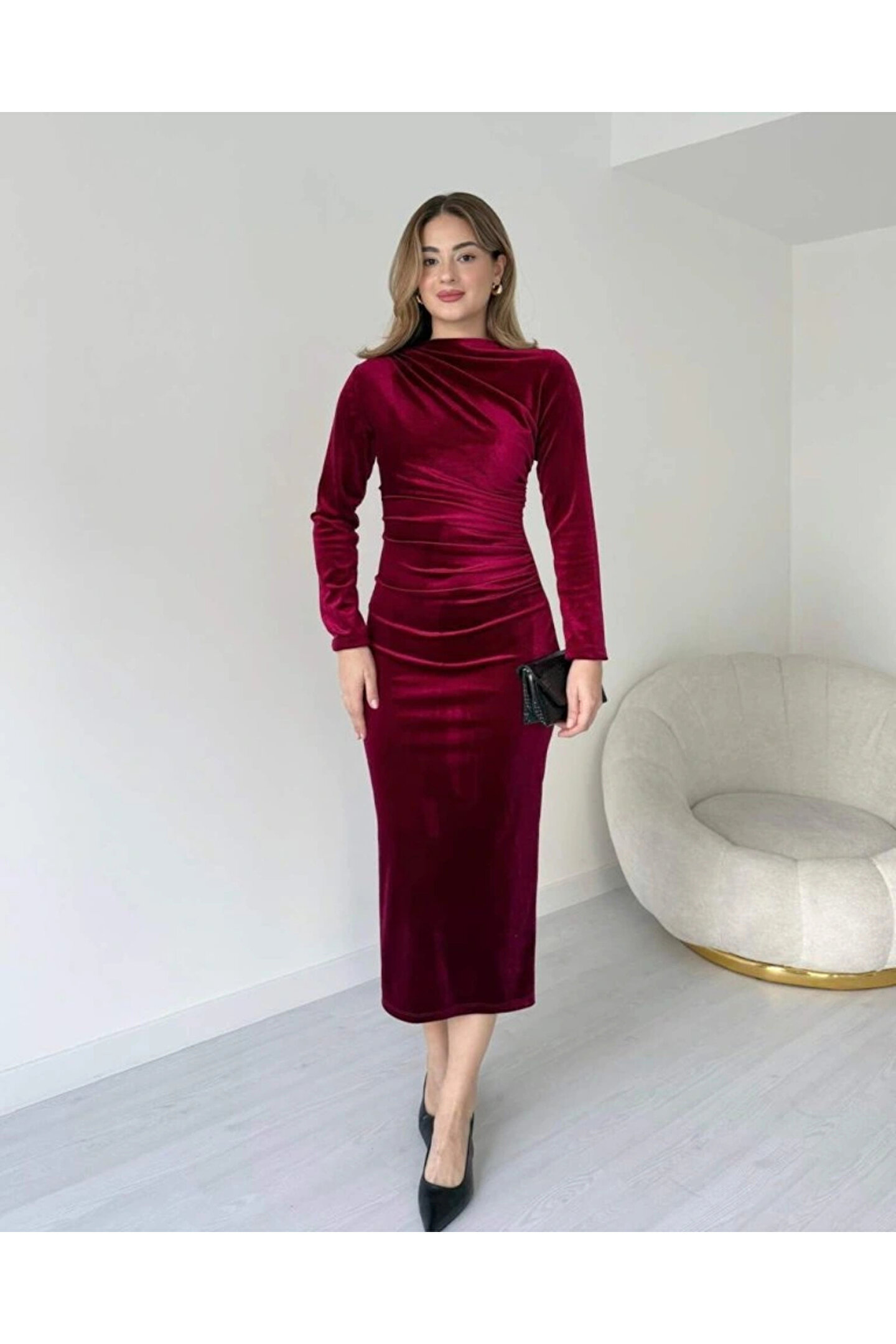 Siyah Uzun Kollu Büzgü Detay Kadife Kumaş Midi Boy Elbise