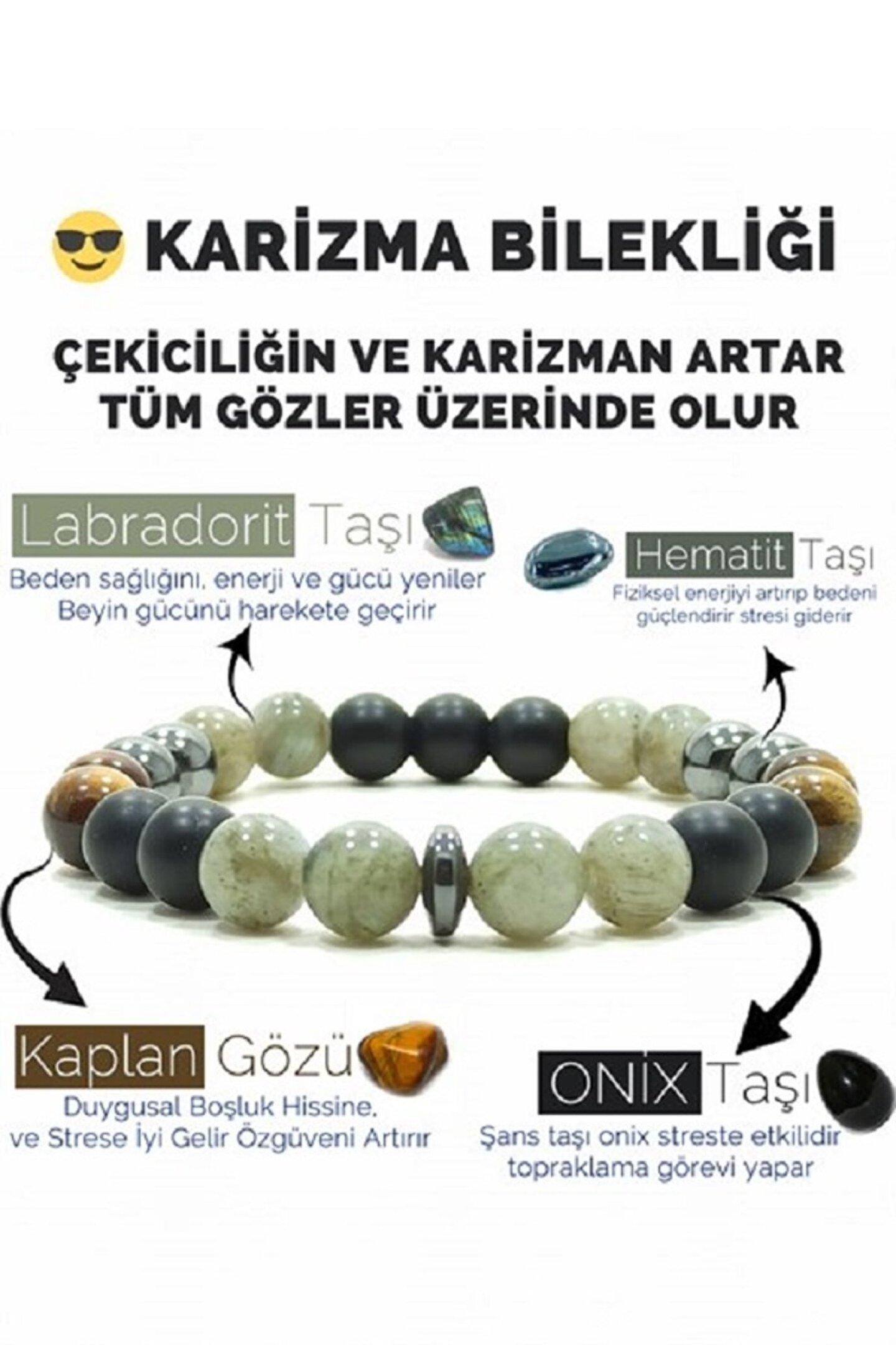 Gençlerin enerjisini ve stilini yansıtan tasarımıyla, her yaştan kullanıcıya hitap eden bir aksesuar; Doğal taş kullanımı sayesinde, her bileklik benzersiz ve otantik bir görünüm sunar; Karizma bilekliği, hem günlük kullanım hem de özel günlerde şıklığınızı tamamlar;