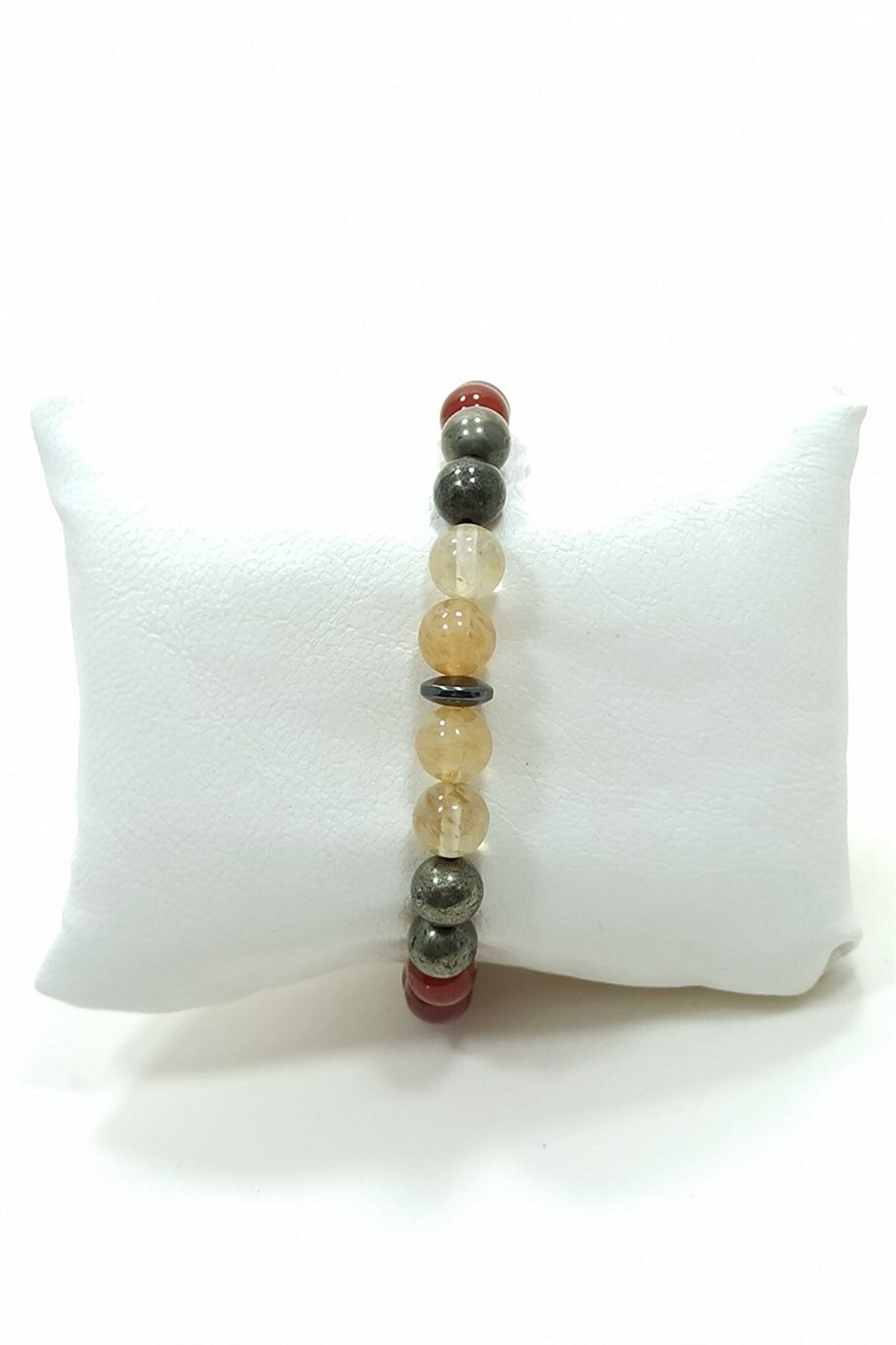 Doğal taş kullanımı sayesinde her bileklik benzersiz ve otantik bir görünüm sunar; Sitrin ve pirit akik taşı kombinasyonu, bilekliğe zarif bir parlaklık ve renk uyumu katar; Doğal taş materyali ile hem şıklığı hem de doğallığı bir arada yaşatır; Bileklik, günlük kullanım için idealdir ve her türlü kıyafetle kolayca uyum sağlar;
