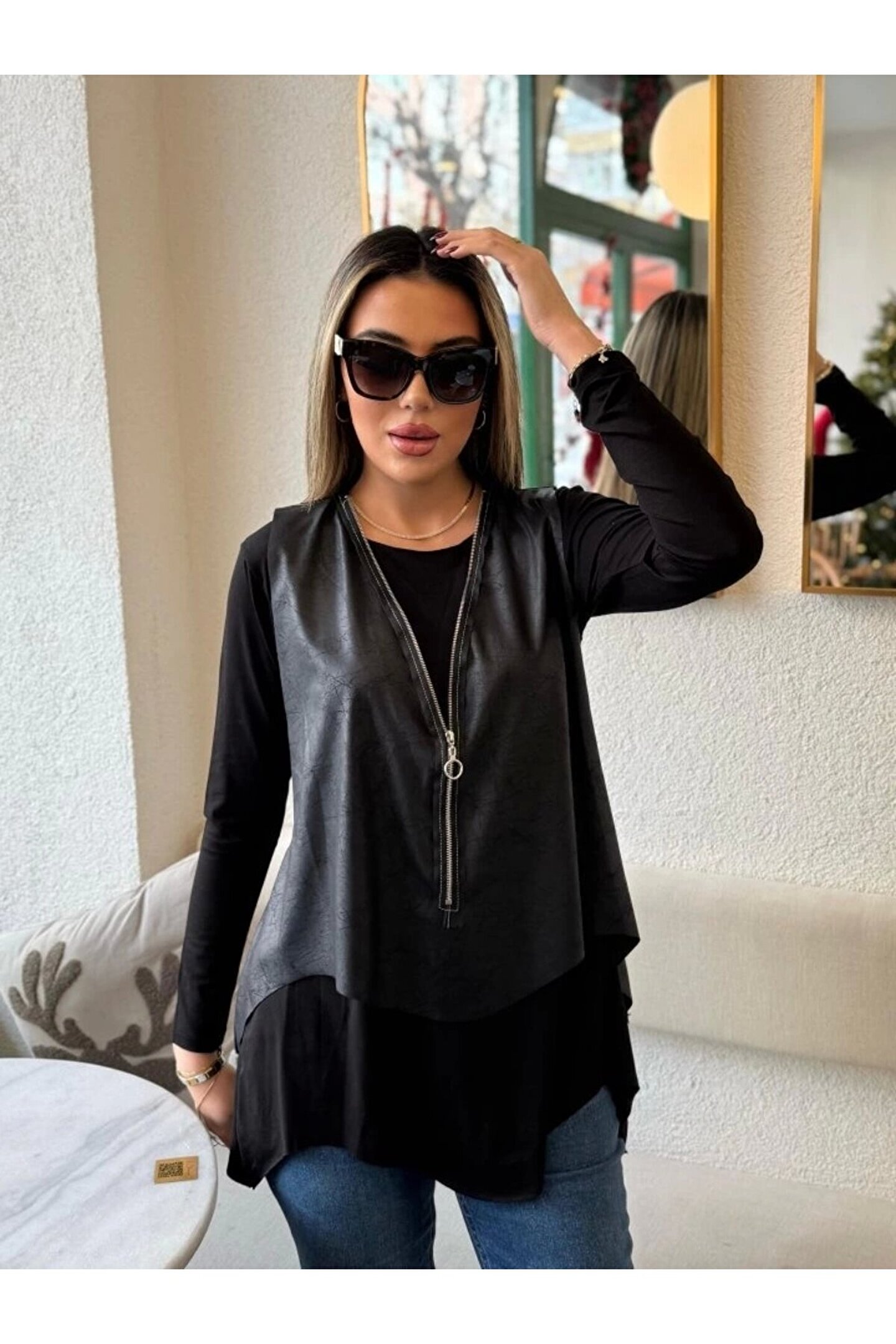 Kadın Uzun Kol Asimetrik Kesim Viskon Bluz Ve çatlak Deri Görünümlü Fermuar Detaylı Yelek Ikili Takı