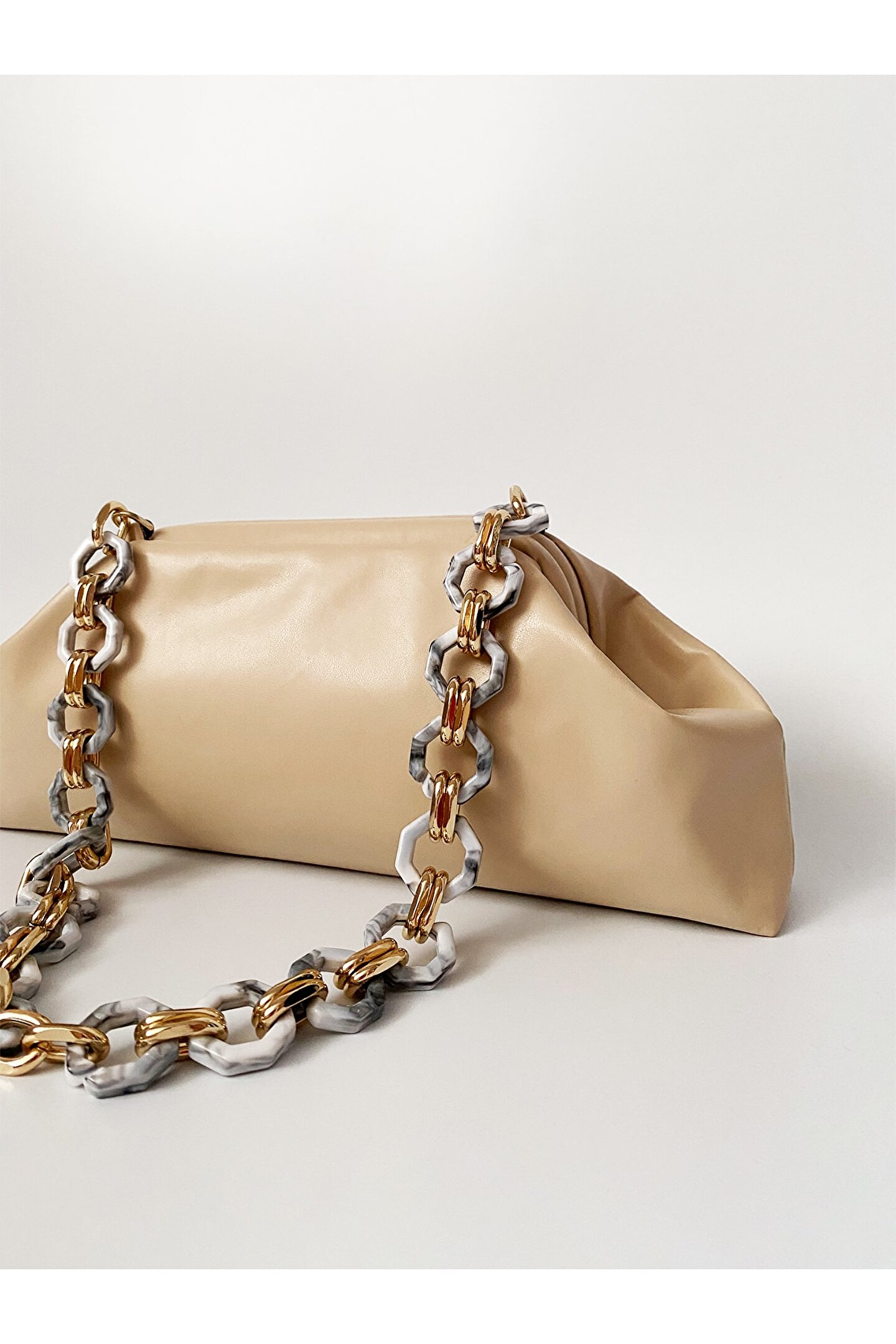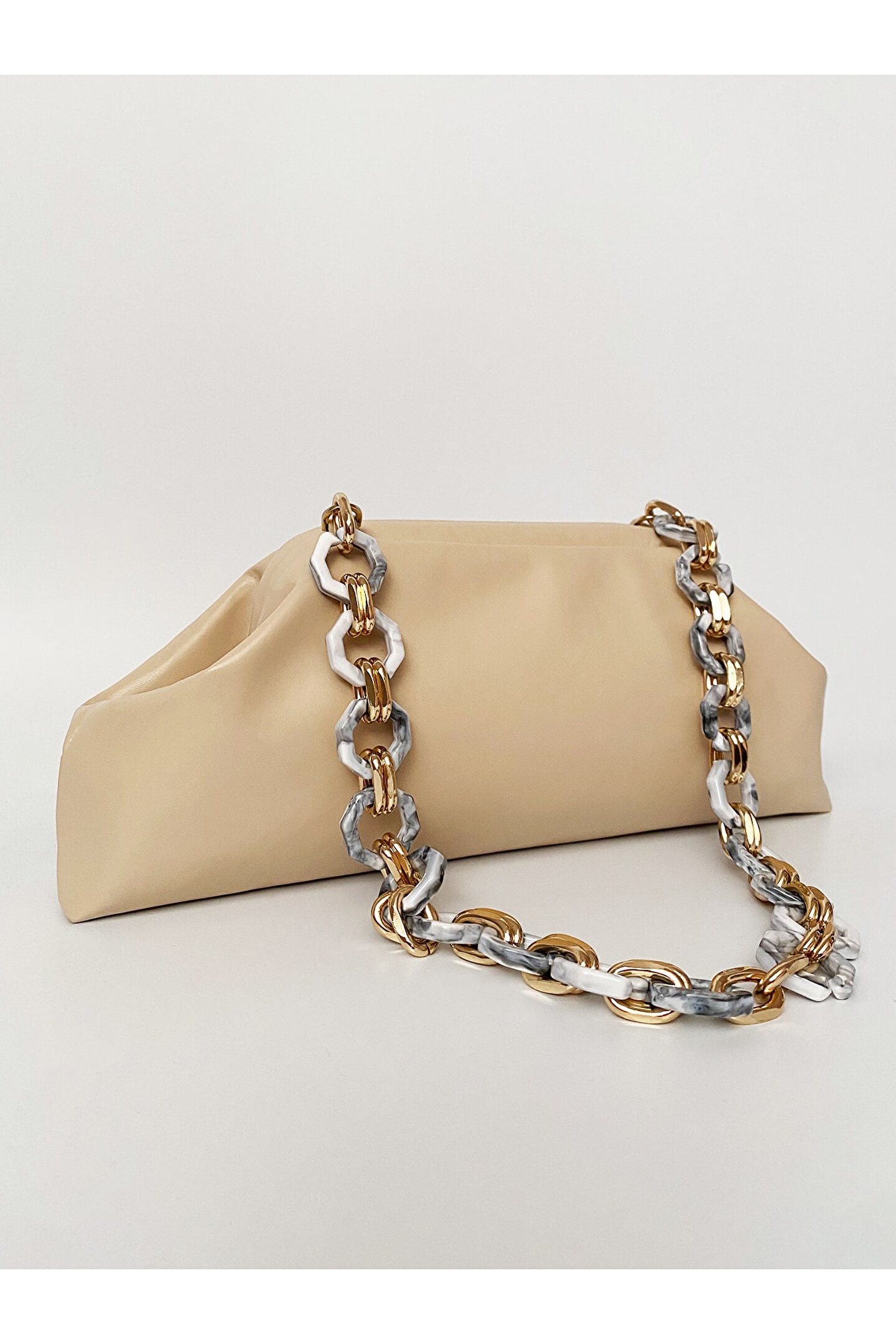 - Zarif tasarımıyla dikkat çeken bej renkli zincirli baget omuz çantası, şıklığınızı tamamlar; - Günlük kullanım için ideal boyutlarda olan bu çanta, hem işlevsel hem de estetik bir aksesuar olarak öne çıkar; - Dayanıklı yapısı sayesinde uzun süreli kullanım imkanı sunar ve günlük aktivitelerinizde yanınızda; - Çantanın iç kısmında yer alan bölümler, eşyalarınızı düzenli bir şekilde saklamanız için tasarlanmıştır; - Omuz askısı sayesinde rahat bir taşıma deneyimi sağlar ve omuzlarınızda ekstra ağırlık yapmaz;