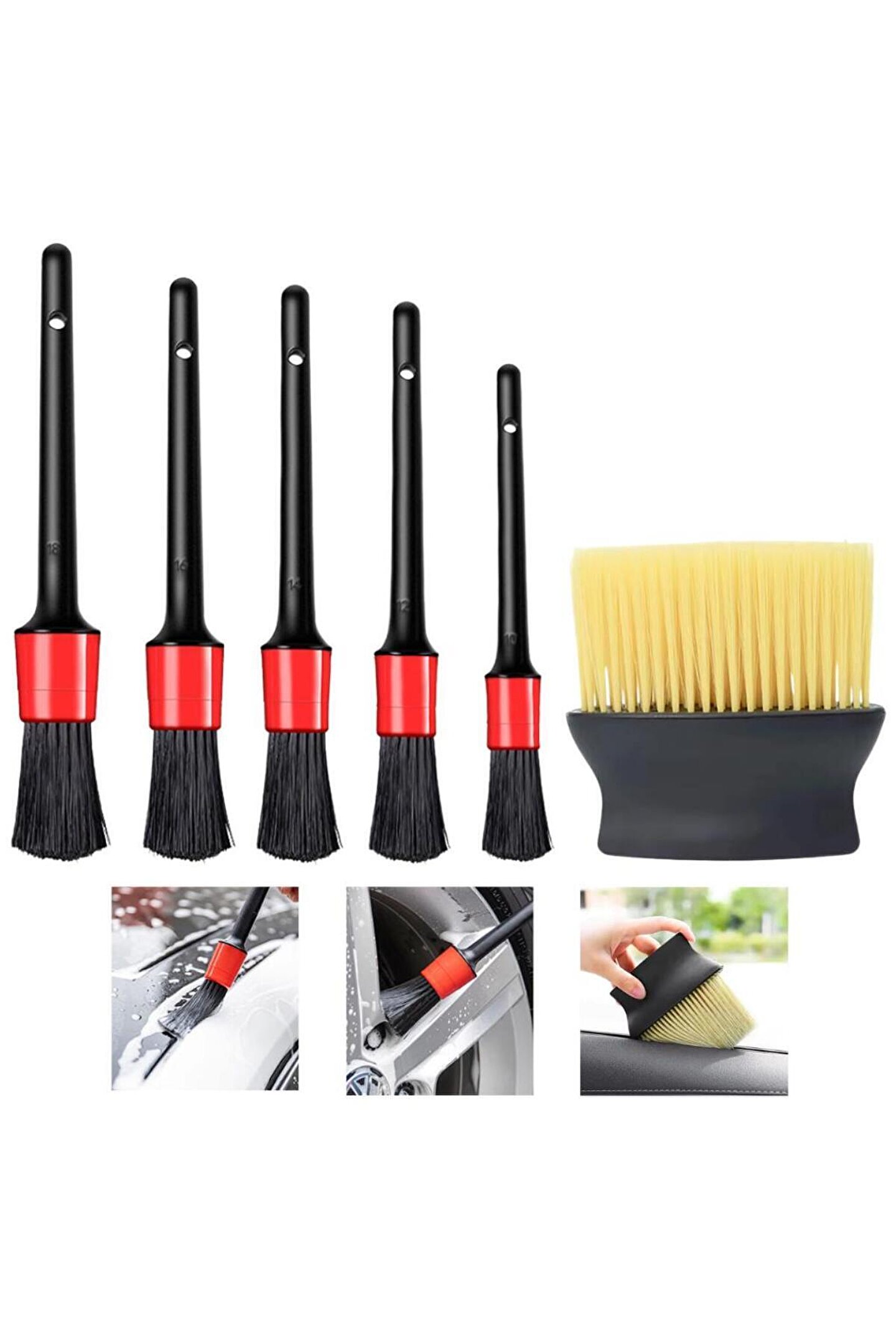 6 Parça Araç Oto İç Dış Konsol Torpido Detay Temizlik Fırça Seti Aracınızda temizlemekte zorlandığınız yerleri temizlemenizde yardımcı settir.; Koltuk araları, klima boşlukları, jant araları, ızgaralar, iç düğmeleri , konsol ve torpido gibi bölümleri detaylı bir şekilde ıslak veya kuru şekilde temizleyebileceksiniz.; Uzun kalem şeklindeki fırçalar 10,12,14,16,18 no şeklinde boyutlarına göre ayrılmıştır.; At kılı fırçası ile de konsol torpido gibi geniş alanları temizleyebilirsiniz.; Boyutları hakkında detaylı bilgiler görselde paylaşılmıştır.