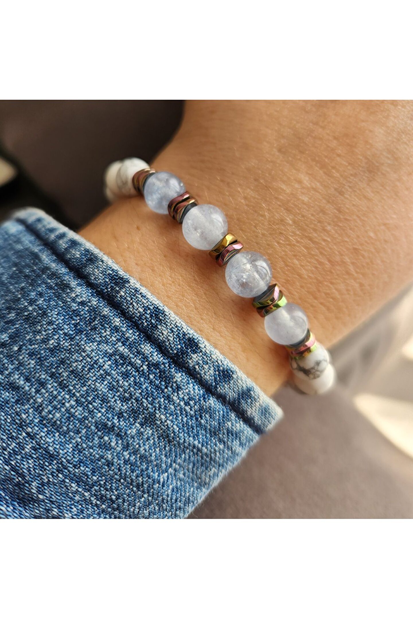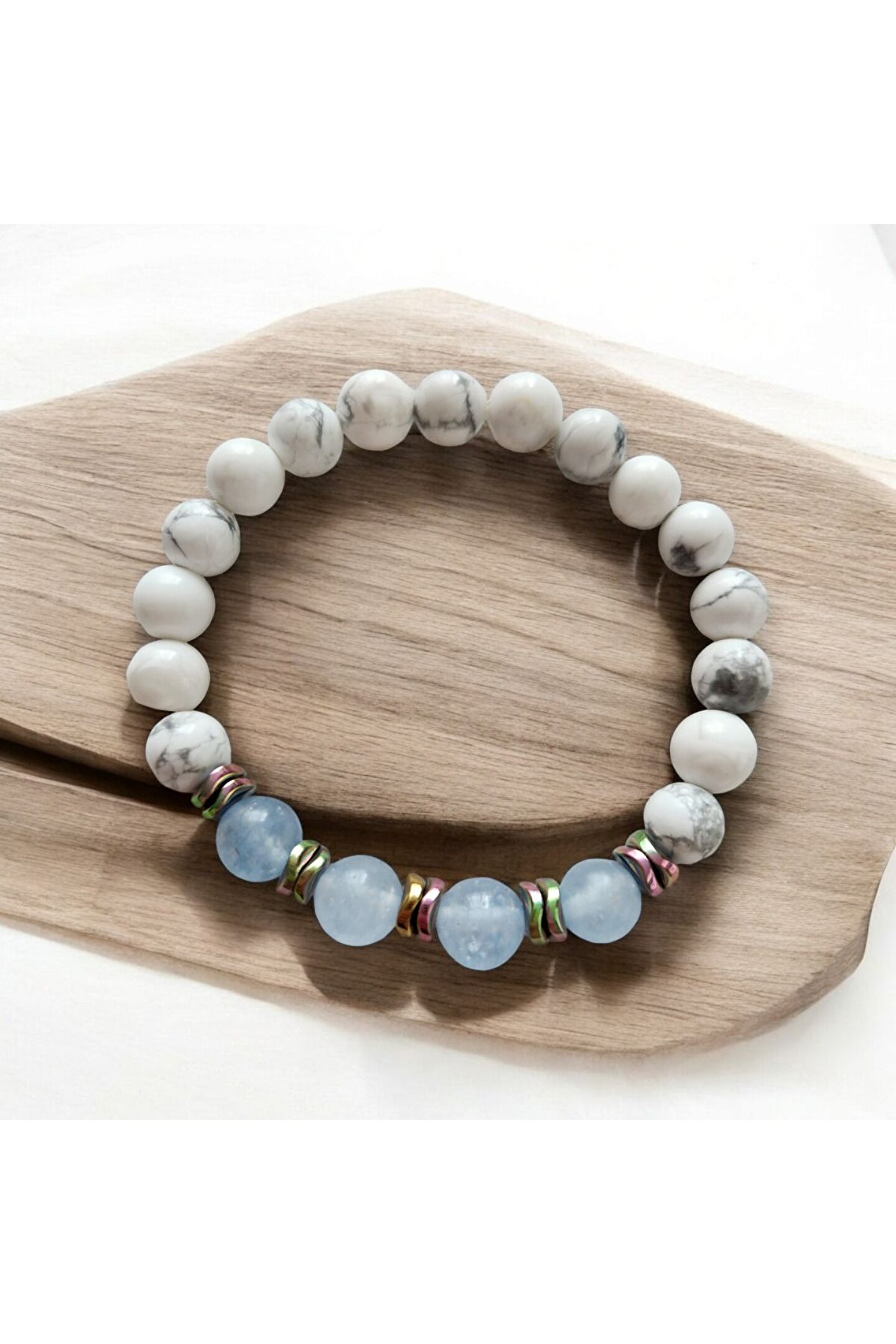 Doğal taş kullanımı sayesinde her bileklik benzersiz ve özgün bir görünüm sunar; Akuamarin ve havlit taşı kombinasyonu, şıklığı ve zarafeti bir arada barındırır; Doğal taşların renk ve desen çeşitliliği, her türlü kıyafetle uyum sağlar ve kişisel tarzınıza eşsiz bir dokunuş katar; Doğal taşların sağladığı enerji ve pozitif titreşimler, günlük yaşamınızda pozitif bir etki yaratır; El yapımı olması, her bir bilekliğin kendine özgü bir hikayesi ve geçmişi olduğunu hissettirir;