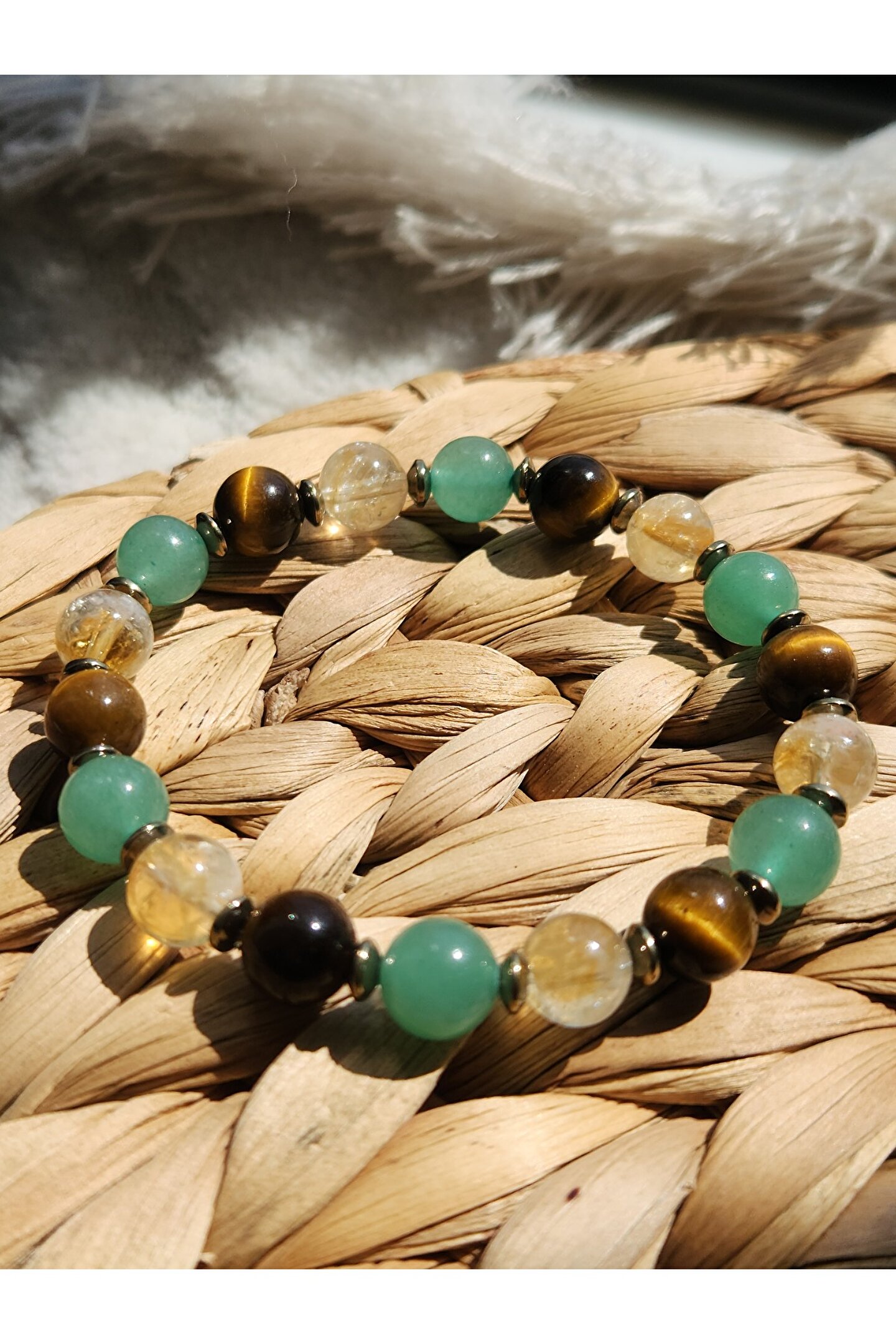- Doğal taş kullanımı sayesinde, her bileklik benzersiz ve otantik bir görünüm sunar; - Kaplangözü, sitrin ve aventurin gibi değerli taşların birleşimiyle zenginleştirilmiş tasarım, şıklığı ve zarafeti bir arada sunar; - Bolluk, bereket ve şans sembolü olarak bilinen bu bileklik, enerjik ve pozitif bir etki yaratır; - Doğal taş materyalinin sağladığı dayanıklılık ve estetik görünüm, uzun süreli kullanım için idealdir;