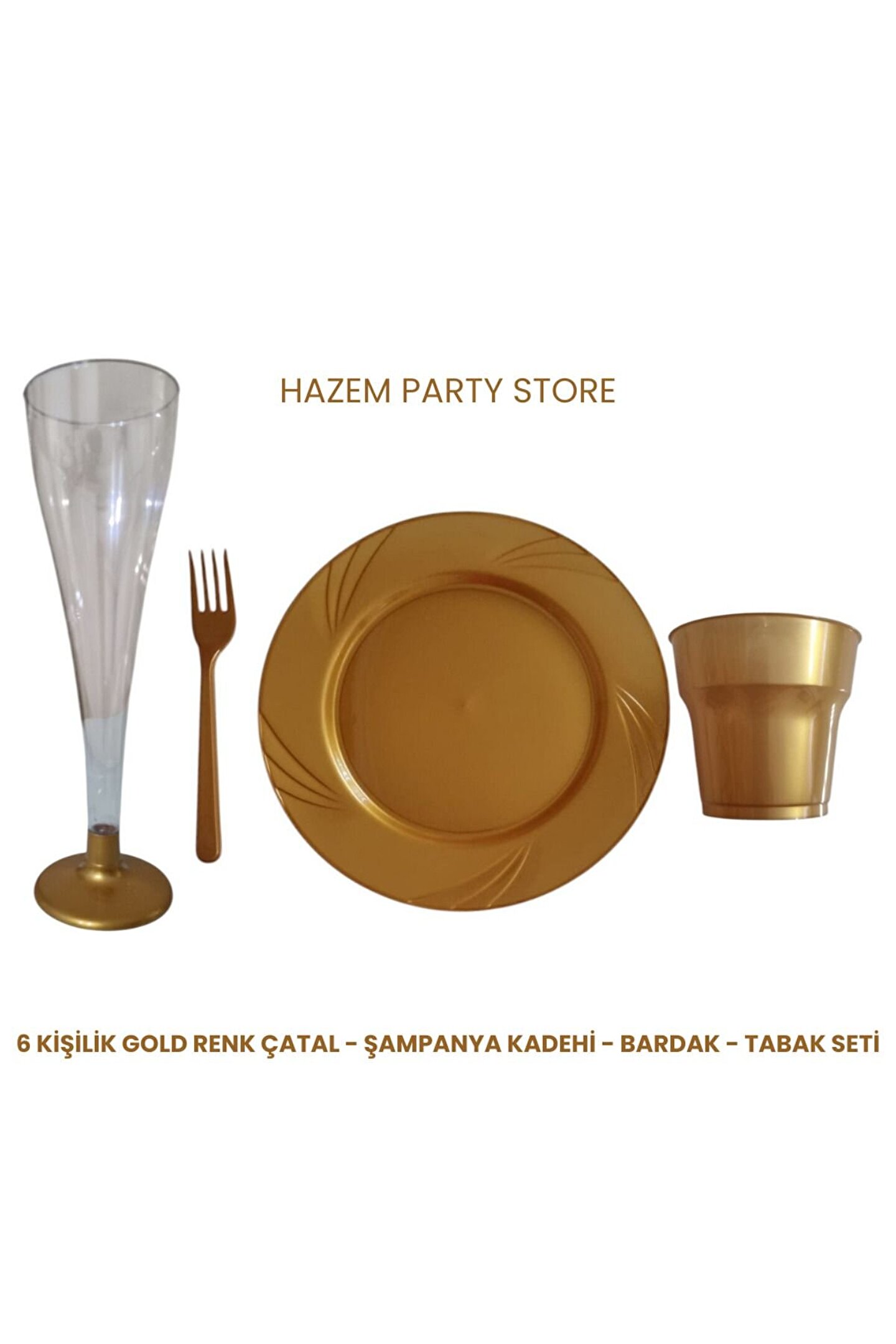 PLASTİK ÇATAL - BARDAK- ŞAMPANYA KADEHİ - TABAK SETİ SERT PLASTİK 6 KİŞİLİK SET GOLD RENK 24 ADET