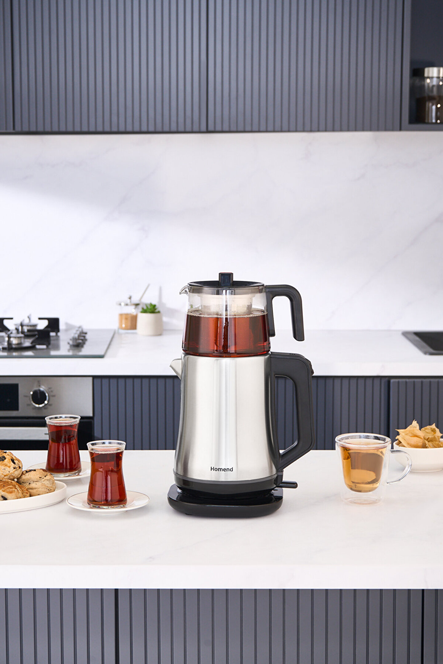1800W Çelik Hazneli Çaycı – 1.8L Su Isıtıcı + 0.8L Demlik, Süzgeçli Elektrikli Kettle