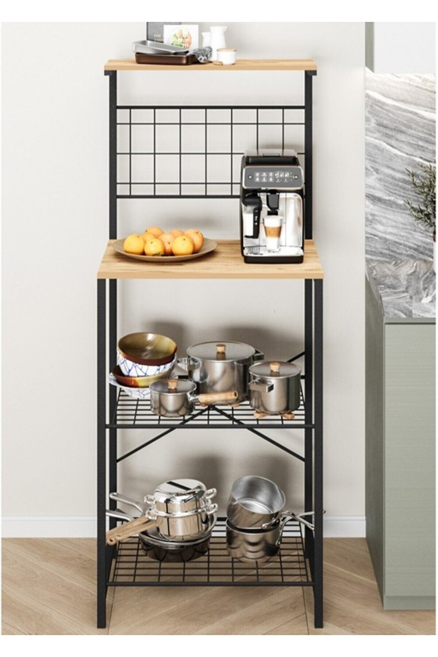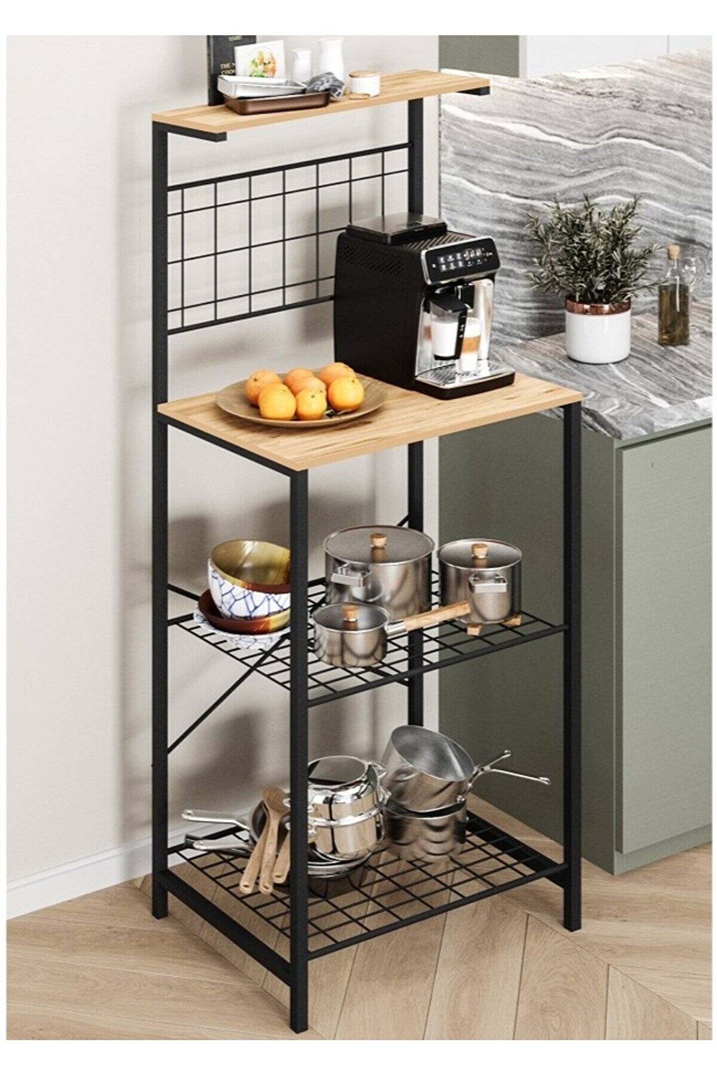 Çok Amaçlı Dolap Mutfak Bangosu Genel Boyut: 140 Cm yükseklik, 38 Cm derinlik, 55 cm eniyle geniş depolama alanı sağlar.; ; Çok Raflı Yapısı ile ekmek kızartma makinesi, baharat, tabaklar ve istediğiniz diğer şeyleri saklayabilirsiniz.; ; Dokulu bir yüzeye sahip, temizlenmesi kolay, çizilmez ve kaymayı önleyen yüksek kaliteli mdflam malzemeden üretilmiştir.; ; 20*20 profilden üretilen iskeleti elektrostatik kaplama yapılmış olup +100 kg taşıma kapasitesine sahiptir.; ; Modern sade moda, tüm farklı iç mekan ortamlarına uyar.; ; Çok amaçlı dolap; mikro dalga fırın, tost makinesi, kahve makinesi vs.; bir çok kullanım alanı sunmaktadır.; ;