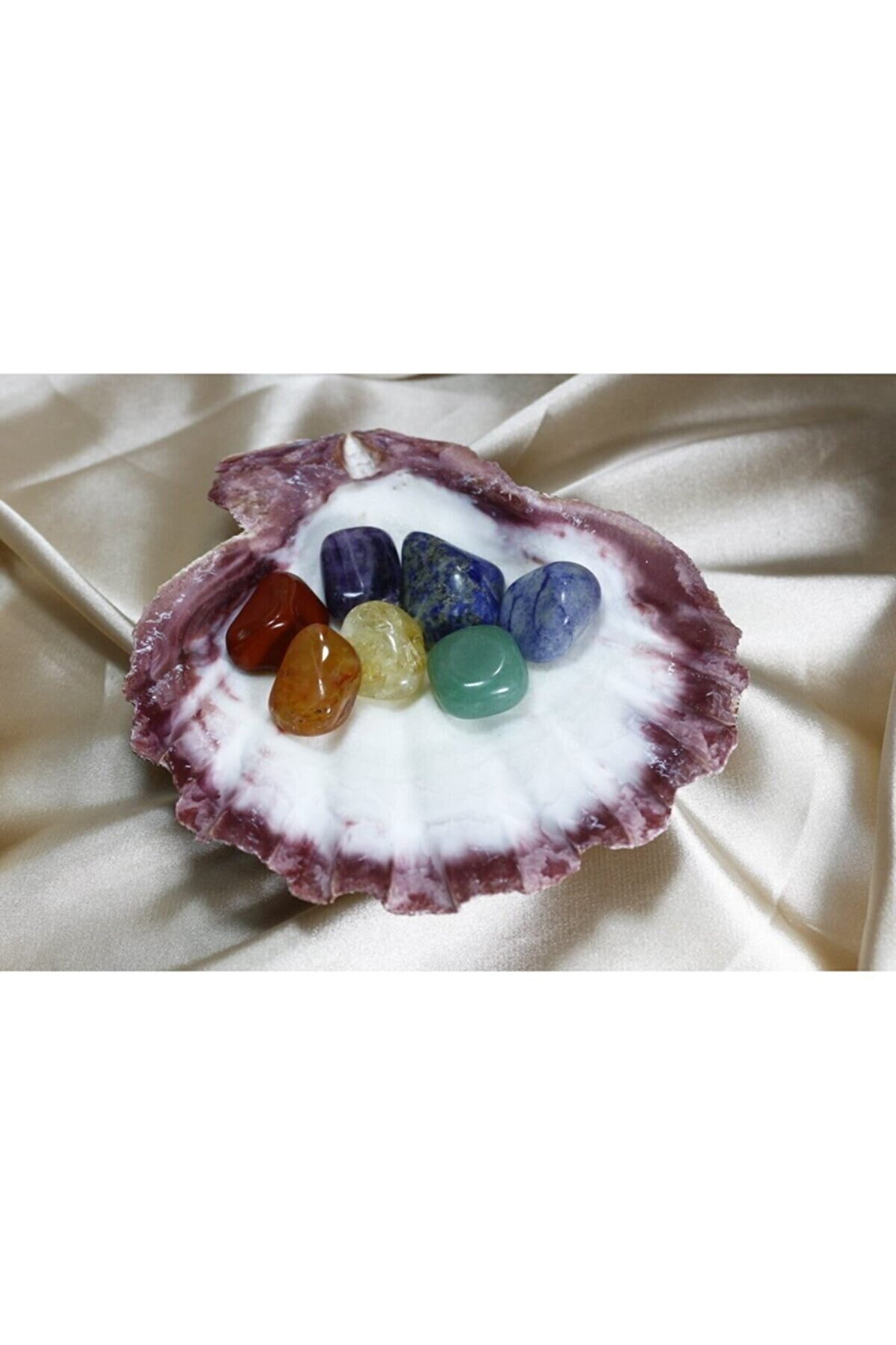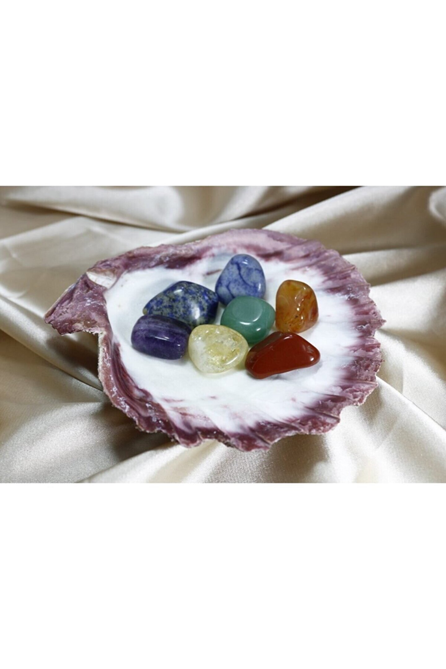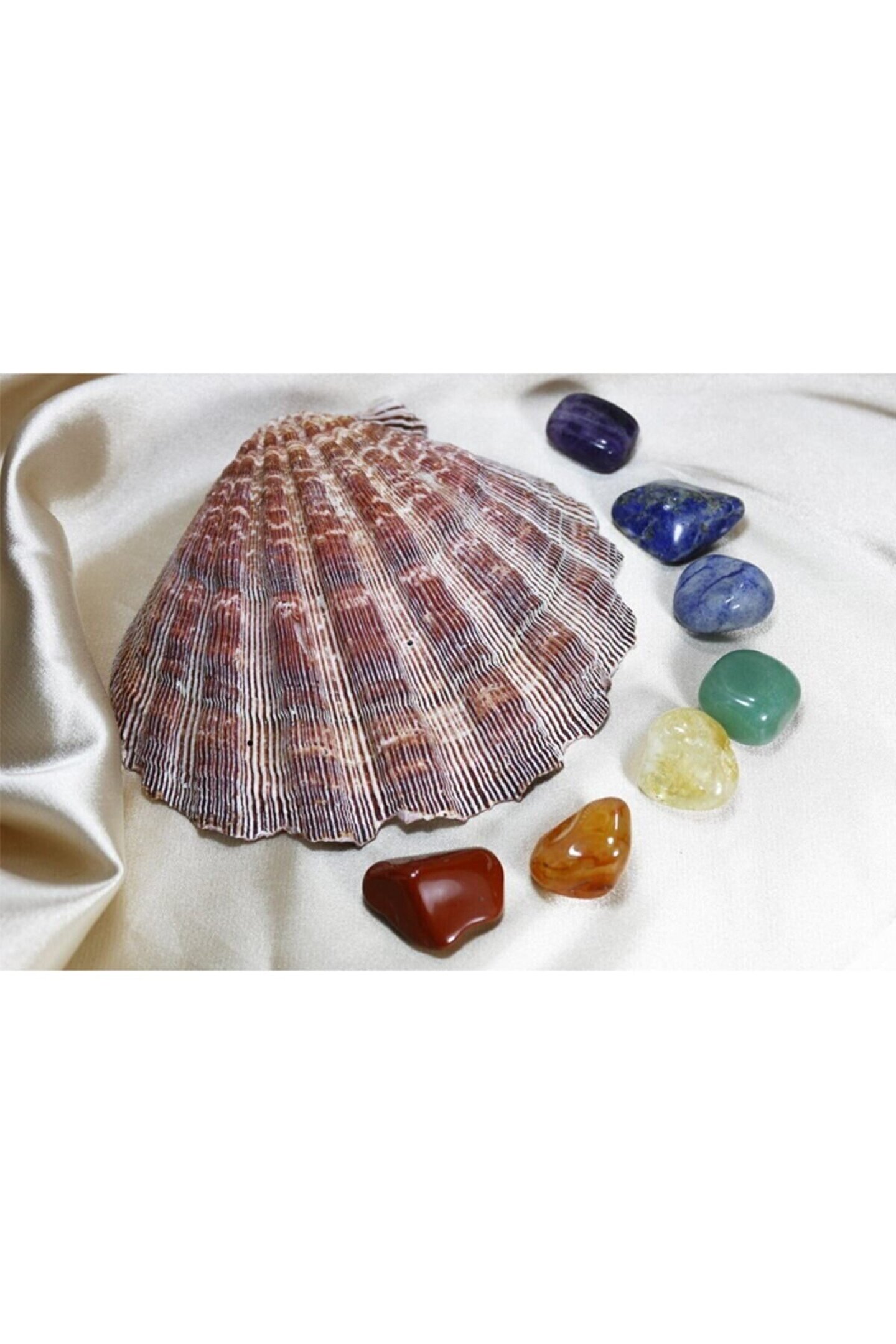 Doğal istiridye deniz kabuğu yatağında 7 çakra - 7 renk doğal taş Özelliğini taşıması amacıyla yapılmış çakra doğal taş hediye seti 7 farklı doğal taş içerir. (kırmızı jasper, turuncu akik taşı, sitrin taşı, aventurin taşı, sodalit taşı, lapis taşı, ametist taşı) Taç çakra - Mor - Ametist ; Göz çakrası - Lacivert - Lapis lazuli ; Boğaz çakrası - Mavi - Sodalit ; Kalp çakrası - Yeşil - Aventurin ; Sinir ağı çakrası - Sarı - Sitrin ; Mide çakra - Turuncu - Orijinal yemen akik ; Kök çakra - Kırmızı - Jasper ; Taşların ve istiridye kabuğunun renkleri, desenleri ve ağırlıkları ufak farklılıklar gösterebilir. Tamamen işlenmmemiş ve doğal olan parçalar için bu doğal bir durumdur. Çakra taşları ölçüleri yaklaşık - 2 x 2,5 x 1,5 Istiridye kabuğu ölçüleri yaklaşık - 13 x13 x 3 cm Kabuk ağırlık yaklaşık - 170 gr Toplam ağırlık yaklaşık - 257 gr