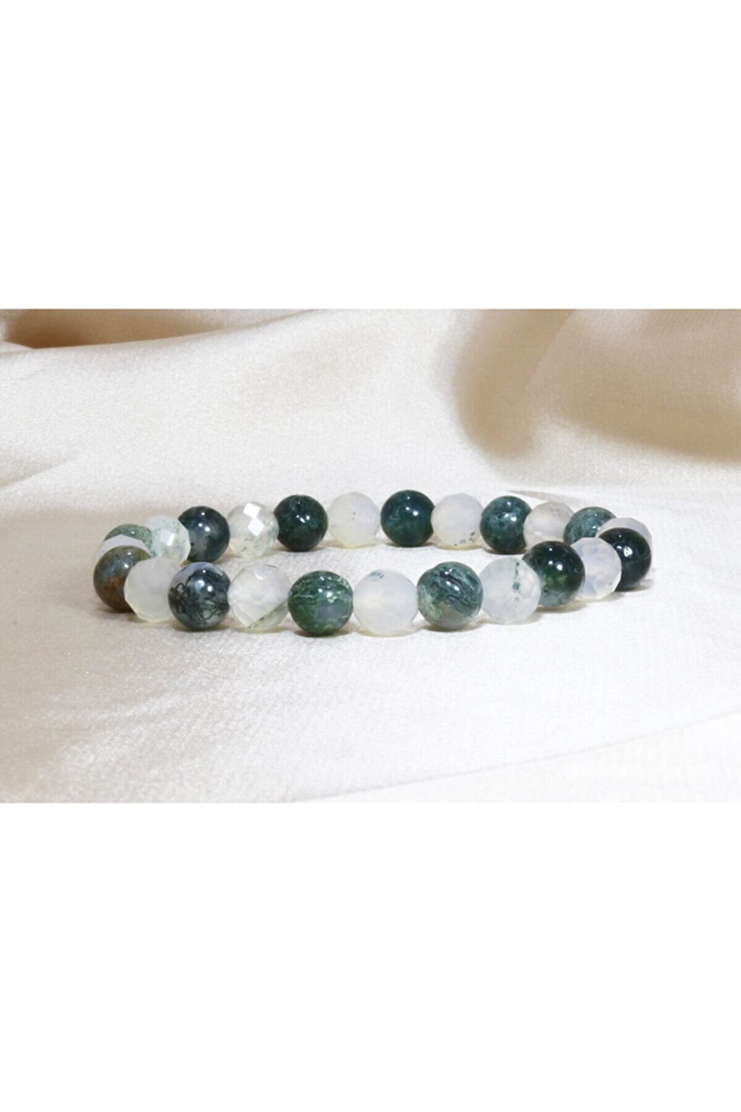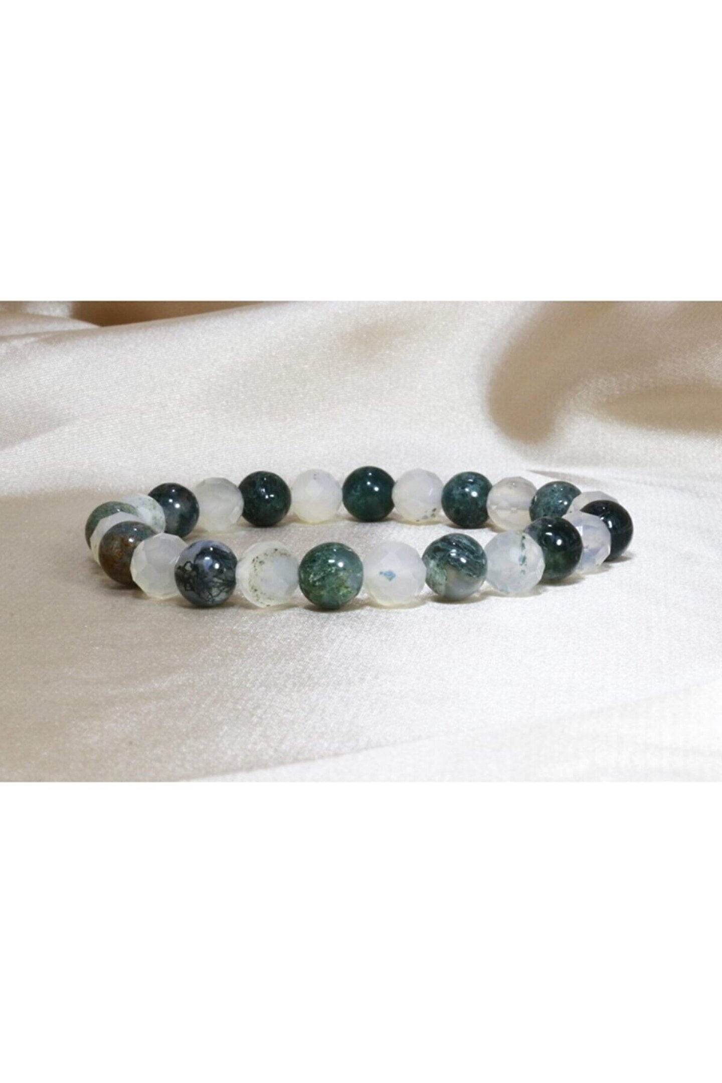 Karma Akik Özel Tasarım Bileklik Tasarımcısının bile hayran kaldığı bir tasarım bileklik kadar taşıyana haz veren bir başka aksesuar yoktur. ; Bir yanda her biri parmak izi misali eşsiz yosun dokusuyla kendine hayran bırakan Yosunlu Akik taşı, diğer yanda ise faset kesim ışıltısını berraklığı, saflığı ve içindeki bitki fosilleri ile süslemiş olan akik taşının özel bir temsilcisi. ; Fosilli Akik ve Yosunlu Akik Doğal Taş Bileklik ile Akik taşının ender bulunan muhteşem bir kombinasyonuna sahip olabilirsiniz. ; Akik taşının faydaları ve özelliklerinin tadını çıkartırken, görsel bir şölene de ev sahipliği yapacak olan zarif bileklerinize ve ruhunuza ne mutlu... ; Bileklik tane ebatları 8 mm / Bitki Fosilli Akik taşı faset kesimlidir.;