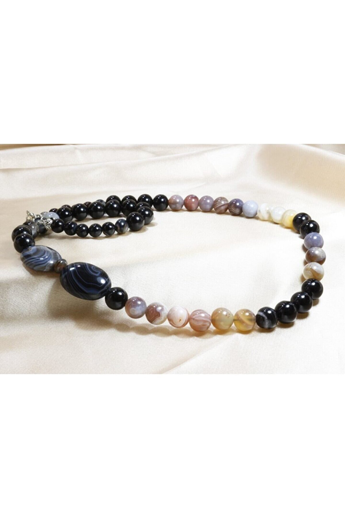Özel Tasarım Doğal Taş / Siyah Akik ve Botswana Akik Akik taşının muhteşem harika çeşitleri sizin için özel tasarımıyla bir araya geldi. ; Muhteşem renk uyumu ve özel tasarım tarzı ile karma akik kolye, şık sade ve iddaalı tarzını yansıtmak isteyen kadınlar için harika bir tercih. ; Akik taşının dokusu ve desenleri de tasarımı gibi görenleri kendine hayran bıracak. ; Akik tane ebatları 6 - 8 mm / Akik Oval ölçüleri 2 x 1,5 cm / Kolye toplam uzunluk 50 cm;