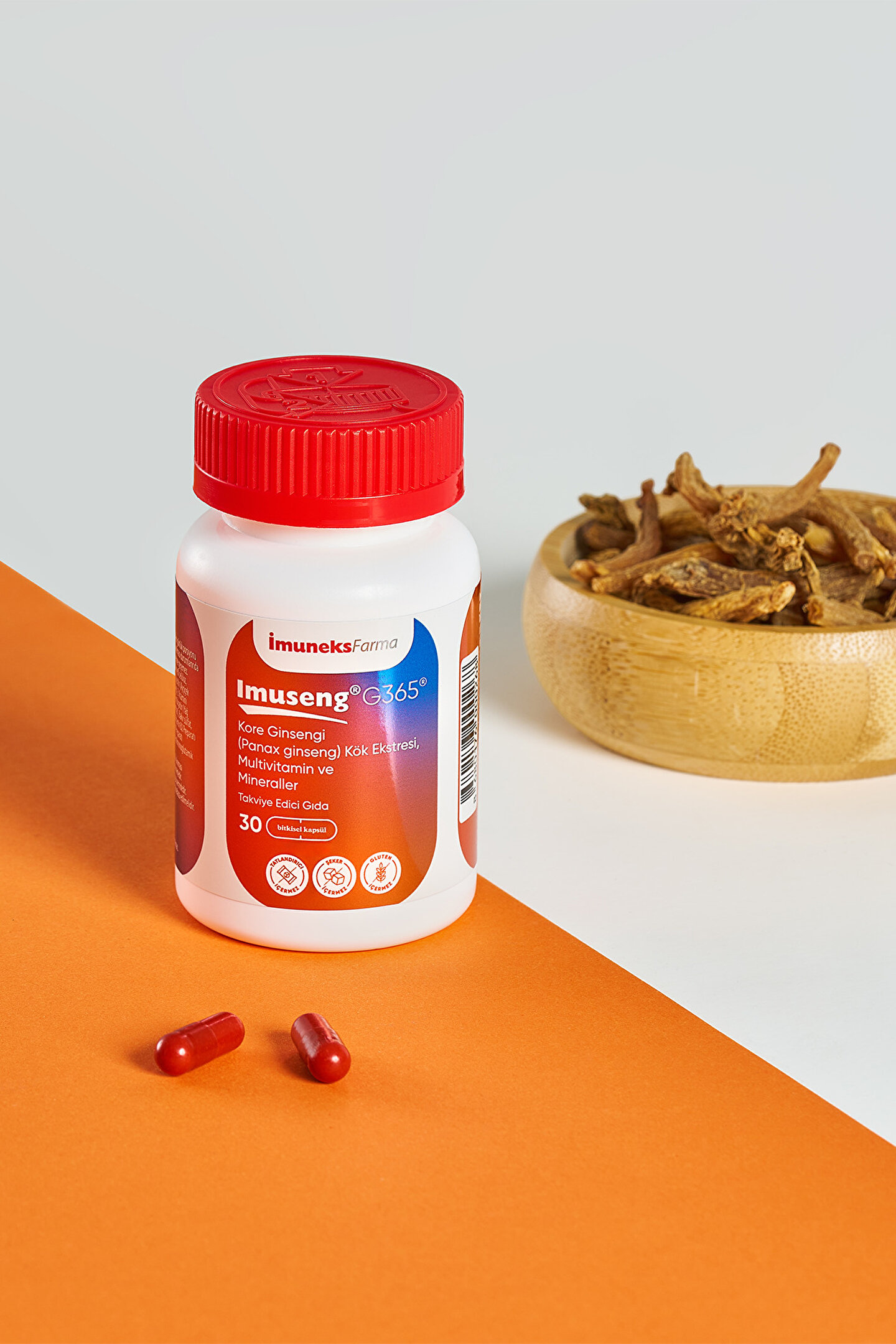 İmuneks Farma İmuseng G365 30 KapsülKore Ginsengi (Panax ginseng) Kök Ekstresi, Multivitamin ve Mineraller içeren takviye edici gıda.11 vitamin ve 5 mineral içeriğine sahiptir ve Kore ginsengi (panax) ile desteklenmiş bir multivitamindir.; Panax ginseng olarak bilinen Kore ginsengi, Asya tıbbında geleneksel olarak yüzyıllardır kullanılmaktadır.; İçeriğinde bulunan C vitamini, biotin, kalsiyum, bakır ve demir normal enerji oluşum metabolizmasına katkıda bulunur.; B12 vitamini, B6 vitamini , A vitamini, C vitamini, D vitamini, demir, selenyum ve çinkobağışıklık sisteminin normal fonksiyonuna katkıda bulunur.; Ürün İçeriği: Günlük Doz (1 Kapsül) Miktar (1 Kapsül) BRD* Kalsiyum 125 mg %15,6 Lesitin (Soya Lesitini) 100 mg - Vitamin C 60 mg %75 Kore Ginsengi (Panax ginseng) Kök Ekstresi 50 mg - Vitamin B3 18 mg NE %112,5 Vitamin E 10 mg ?-TE %83,3 Demir 10 mg %71,4 Vitamin B6 2 mg %142,8 Bakır 2000 µg %200 Çinko 1,75 mg %17,5 Vitamin B2 1,6 mg %114,2 Vitamin B1 1,4 mg %127,2 Vitamin A 800 µg (2667 IU) %100 Biotin 150 µg %300 Folik Asit 100 µg %50 Selenyum 50 µg %90,9 Vitamin D3 5 µg %100 Vitamin B12 1 µg %40 BRD*: Beslenme Referans Değeri Kullanım Şekli:Sadece yetişkinler içindir.; Günde 1 kapsül alınması önerilmektedir.; Tercihen gıdalar ile birlikte, sabah alınması önerilmektedir.; Uyarıcı Bilgiler:Tavsiye edilen günlük porsiyonu aşmayınız.; Takviye edici gıdalar normal beslenmenin yerine geçmez.; Çocukların ulaşamayacağı yerde saklayınız.; Hastalıkların önlenmesi veya tedavi edilmesi amacı ile kullanılamaz.; Hamilelik ve emzirme dönemi ile hastalık veya ilaç kullanılması durumlarında doktorunuza danışınız.
