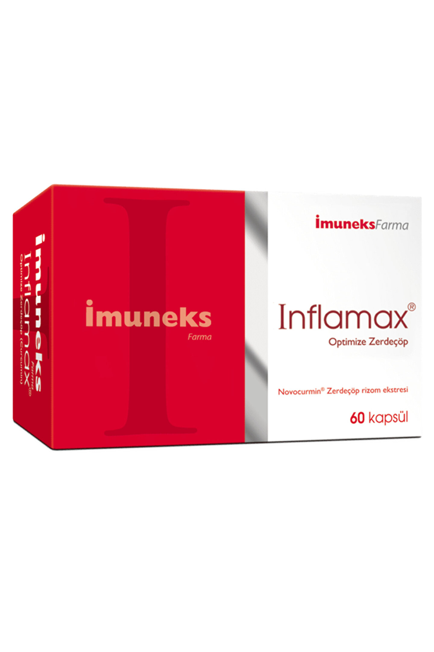 Ürün Açıklaması İmuneks Farma Inflamax Optimize Zerdeçöp Takviye Edici Gıda Novocurmin® Zerdeçöp rizom ekstresiNovocurmin® Zerdeçöp rizom ekstresiZerdeçöp Rizom ekstresi Novocurmin® İmuneksFarma’nın yeni geliştirdiği patentli tescilli bileşenidir.; 60 kapsül Etken Maddeler Miktar (2 kapsül) Miktar (4 kapsül) Zerdeçöp Rizom ekstresi (Curcuma longa) 93,34 mg 186,68 mg Emülgatör (Polisorbat 80), Kapsül (Hidroksipropilmetil selüloz, Renklendiriciler (Demir oksit,kırmızı, Titanyum dioksit)), Topaklanmayı önleyici (Silikon dioksit), Novocurmin® Zerdeçöp Rizom Ekstresi, Maltodekstrin, Stabilizör (Yağ asitleri).; Tatlandırıcı, şeker, gluten içermez.; Kullanım Bilgisi İlk hafta sabah 2 (iki) kapsül akşam 2 (iki kapsül) toplam 4 (dört) kapsül, ilerleyen haftalarda sadece sabah 2 (iki) kapsül su ile birlikte tüketilmesi önerilir.; Yetişkinler içindir.; Uyarılar: Çocukların ulaşamayacağı yerde saklayın.; Tavsiye edilen günlük porsiyonu aşmayın.; Hamilelik ve emzirme dönemi ile hastalık veya ilaç kullanılması durumlarında doktorunuza danışın.; Takviye edici gıdalar normal beslenmenin yerine geçemez.; İlaç Değildir.; Hastalıkların önlenmesi veya tedavi edilmesi amacıyla kullanılmaz.25°C’nin altında kuru ve serin yerde muhafaza edilmelidir.