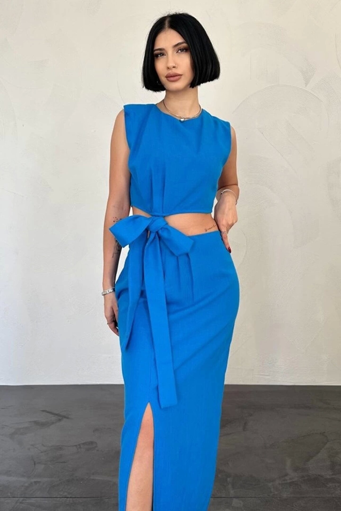 Turkuaz Kuşaklı Crop Ve Etek Takım