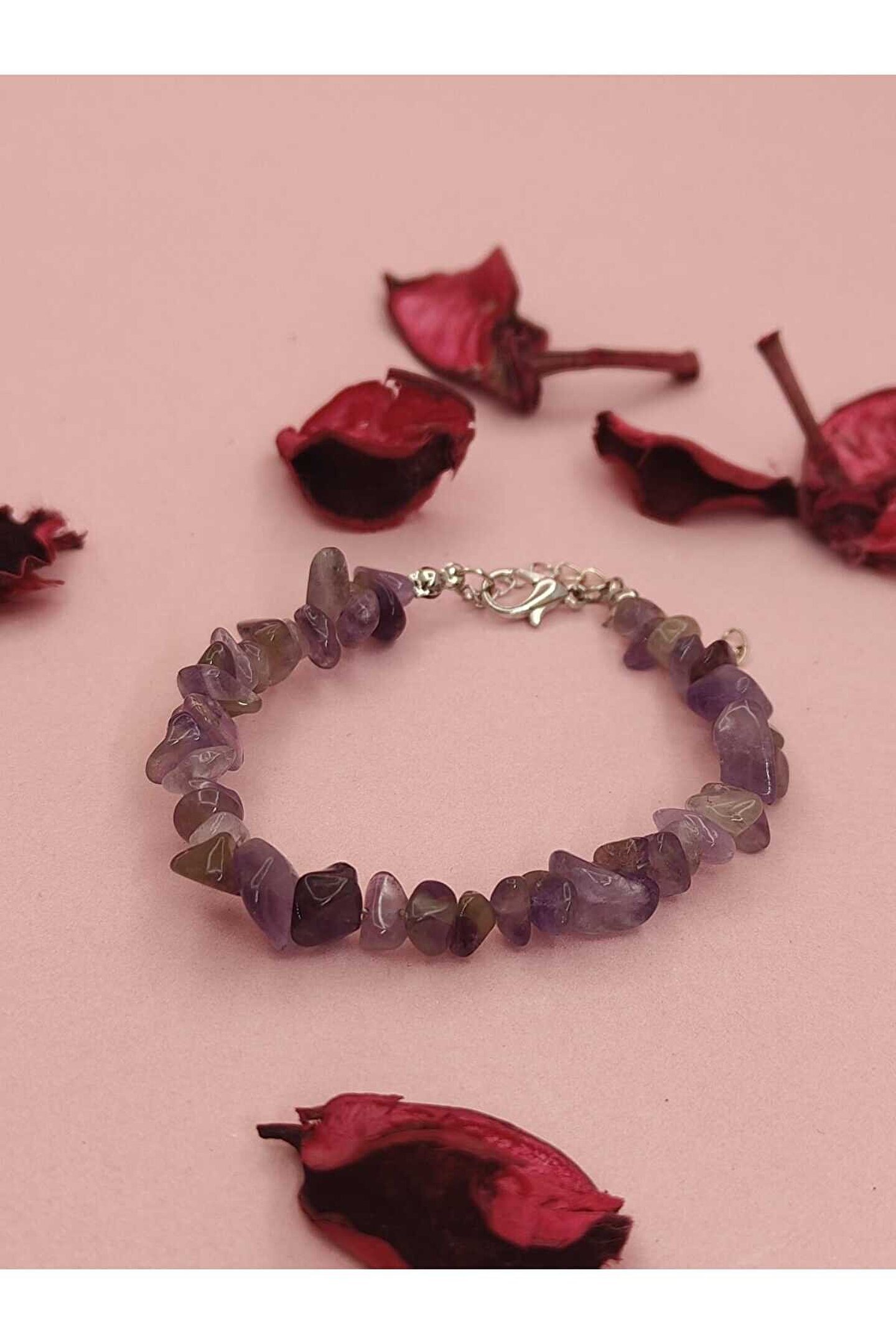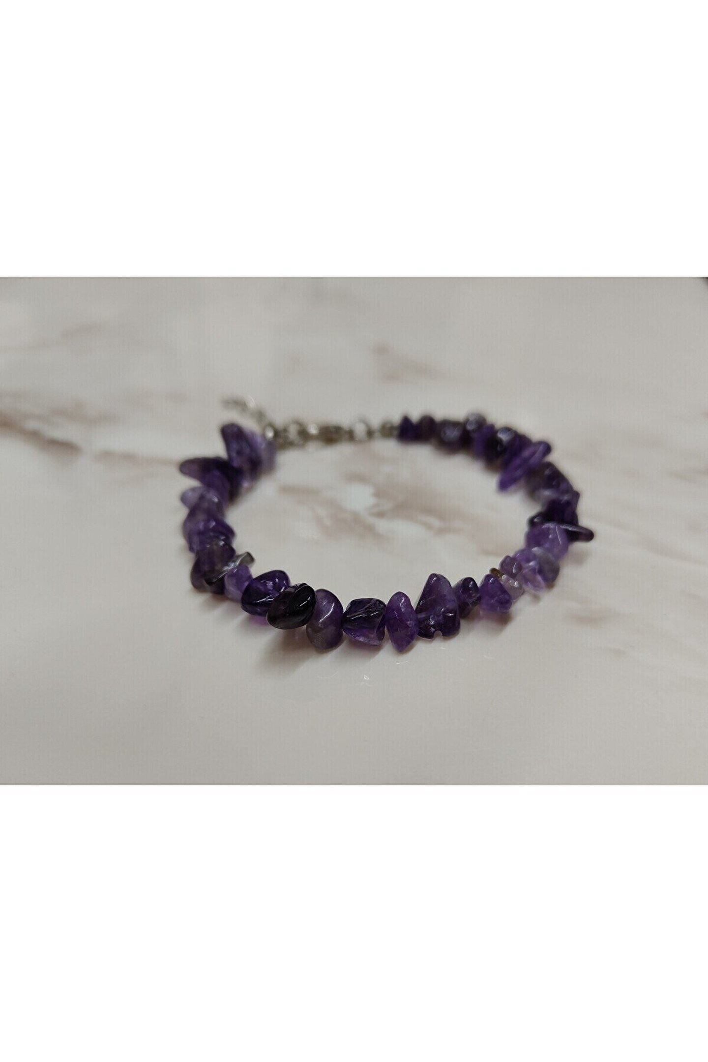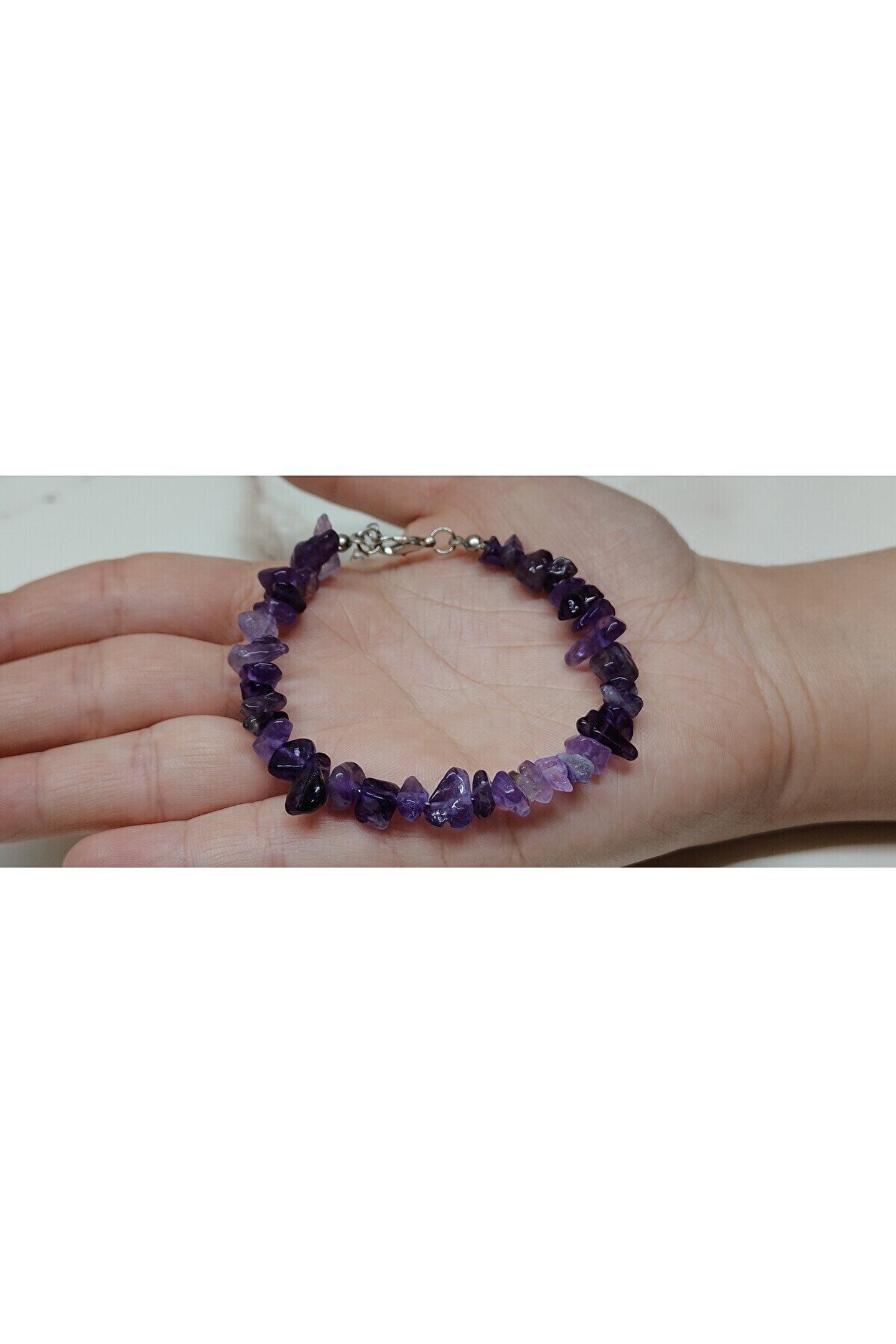 - Ametist kırık taş bileklik, doğal taşların eşsiz güzelliğini yansıtarak şıklığınızı tamamlar.; - Nemli bir bez ile kolayca temizlenebilir; böylece her zaman parlaklığını korur.; - Kadın ve kız kullanıcılar için idealdir; zarif tasarımıyla günlük kombinlerinizde fark yaratır.; - Türkiye'de üretilmiş olup, yerel kaynaklardan temin edilen malzemelerle el işçiliğiyle hazırlanmıştır.; - Metal materyali sayesinde dayanıklılık ve uzun süreli kullanım sunar.; - Doğal taş yapısıyla benzersiz bir dokunuş katarken, her bileklikteki kırık taşların eşsiz deseniyle kişisel tarzınızı ön plana çıkarır.