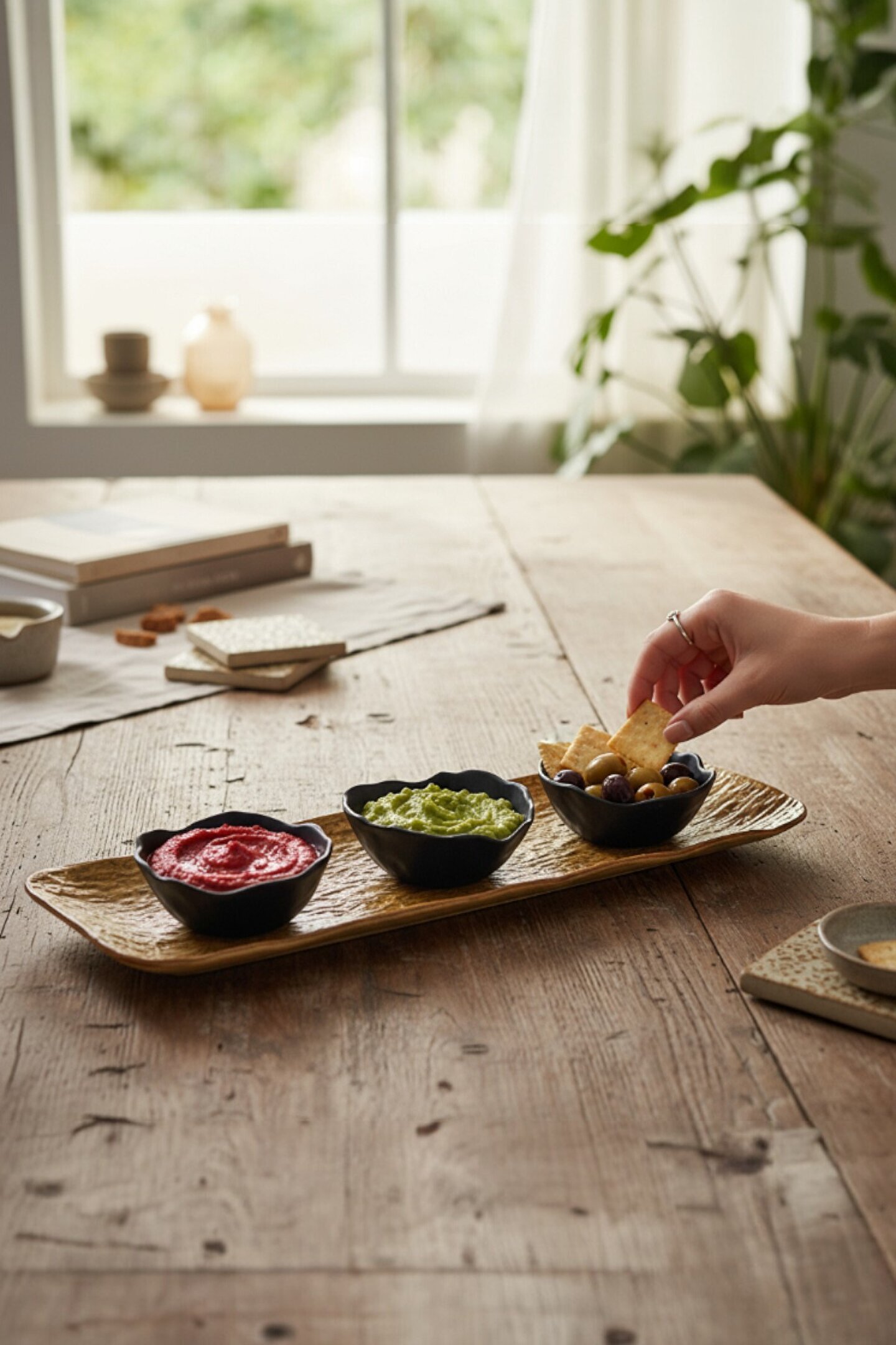 Wood 41 cm Porselen Kayık Sunum Tabağı 1 Adet / Porselen Sosluk Kase 9cm 3 Adet