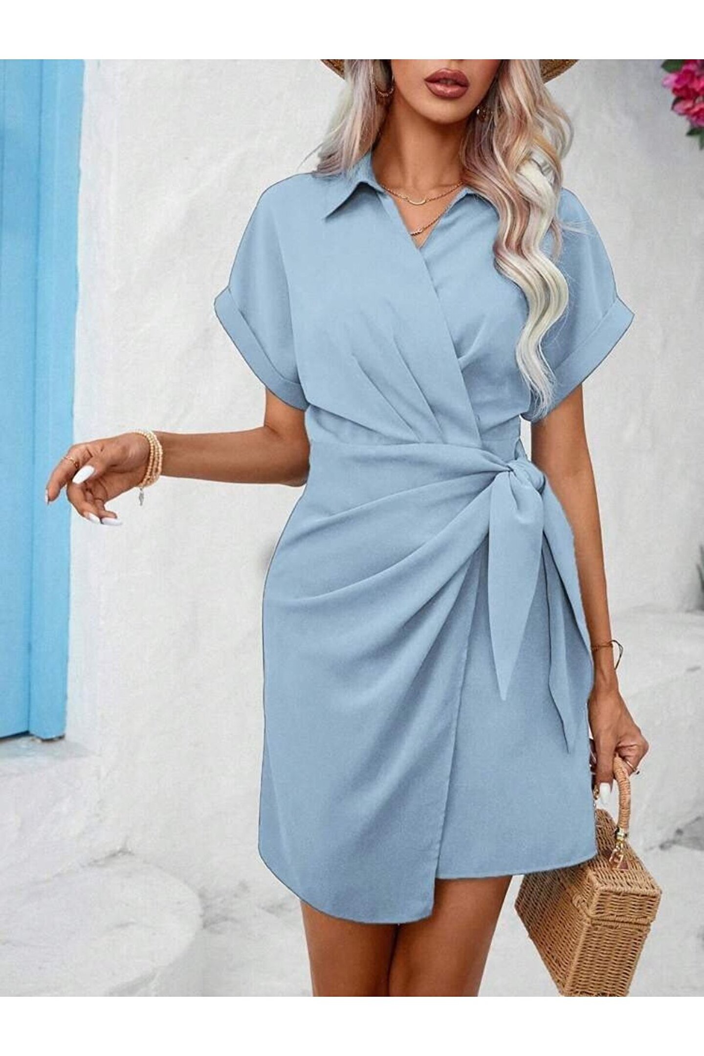 isez EQURİ Kadın Kısa Kollu Yakalı Yandan Bağlamalı Dokuma Elbise