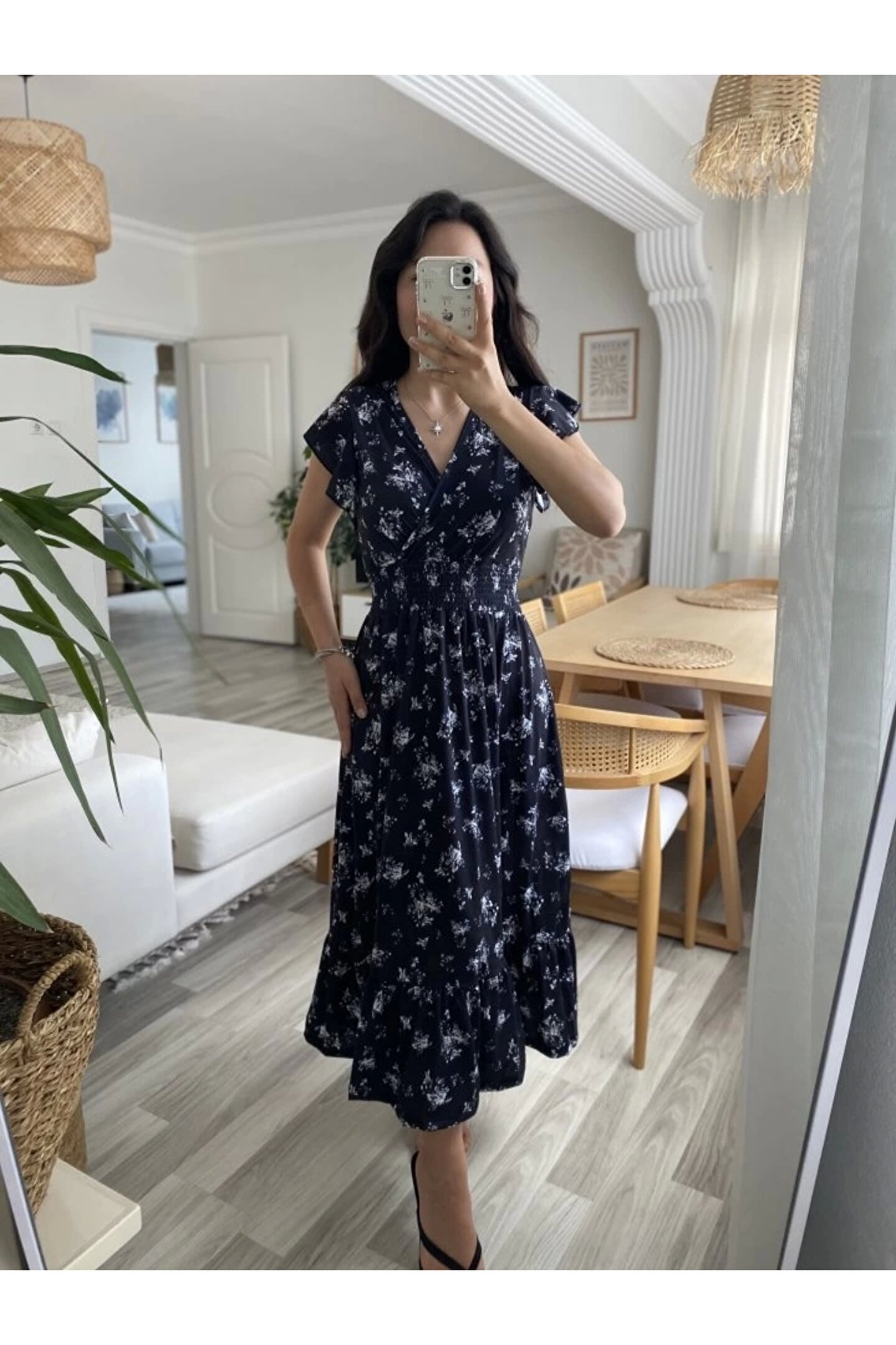 Kadın Kısa Kollu Kruvaze Yakalı Beli Lastikli çiçek Desenli Elbise