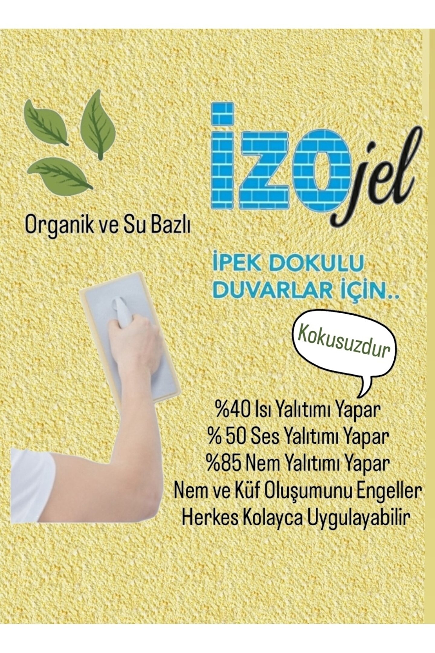 Izojel ipek sıva dekoratif duvar sıvası özellikleri ; %100 organik ve doğaldır, dekoratiftir; duvardaki kusur ve çatlakları yok eder. - %40 ısı yalıtımı - % 50 ses yalıtımı - %85 nem yalıtımı sağlar. - her türlü yüzeye uygulanabilir. - renk seçeneği çok fazladır. - uygulanması kolay ve hızlıdır. Tamir edilebilir. - kokusuzdur. Rengi zamanla değişmez. - alev almaz. Yangına karşı dayanıklıdır. - darbelere karşı dayanıklıdır. - duvarın nefes almasını engellemez. - böcek barındırmaz. - antistatiktir. Organik yapıdaki izojel dekoratif yalıtım ipek sıvası her türlü yüzeye uygulanabilir: Seramik , beton, cam, sıva, tuğla, ahşap, gaz beton, boyalı yüzeyler. Yüzeydeki boşlukları doldurur, çatlamaz. Silinebilir ve tamir edilebilir özelliktedir. Kendinden yapışkanlıdır. Örtücülüğü yüksektir. Yeni teknoloji organik dekoratif yalıtım sıvası doğa dostudur. Insan sağlığına kesinlikle zararı yoktur. Uygulanacak yüzeylere önceden herhangi bir işlem yapılması gerekmez. Eski boyaların sökülmesi, yüzeylerin kazınması, macun veya sıva çekilmesi gerekmez. Uygulanacak yüzeyin sadece kuru olması yeterlidir. Uygulama esnasında ekstra bir malzemeye gerek yoktur. Her sıcaklıkta uygulama yapılabilir. Sarfiyat: Yüzeye tek kat uygulama yapılması yeterlidir. Ürünün yüzeye uygulama kalınlığı 1,6 mm ile 2 mm arasında olmalıdır. Depolama: Oda sıcaklığı depolama için uygundur. Özel bir ortamda depolama gerektirmez. Izojel ipek sıva dekoratif duvar sıvası nasıl hazırlanır? Bir kabın içerisine 7 lt su konulur. 1 paket ürün suyun içerisine boşaltılır. Yaklaşık 10 dk karıştırılır. Daha sonra 30 dk kadar dinlendirilip duvara plastik mala ile uygulanır. Uygulama esnasında malayı 5 derece açı ile tutmanız işinizi kolaylaştıracaktır. 1 paket ipek sıva ile yaklaşık 5 m2 alan kaplanabilir. Yüzeye uygulanan ürün 12 ile 24 saat arasında kurur.
