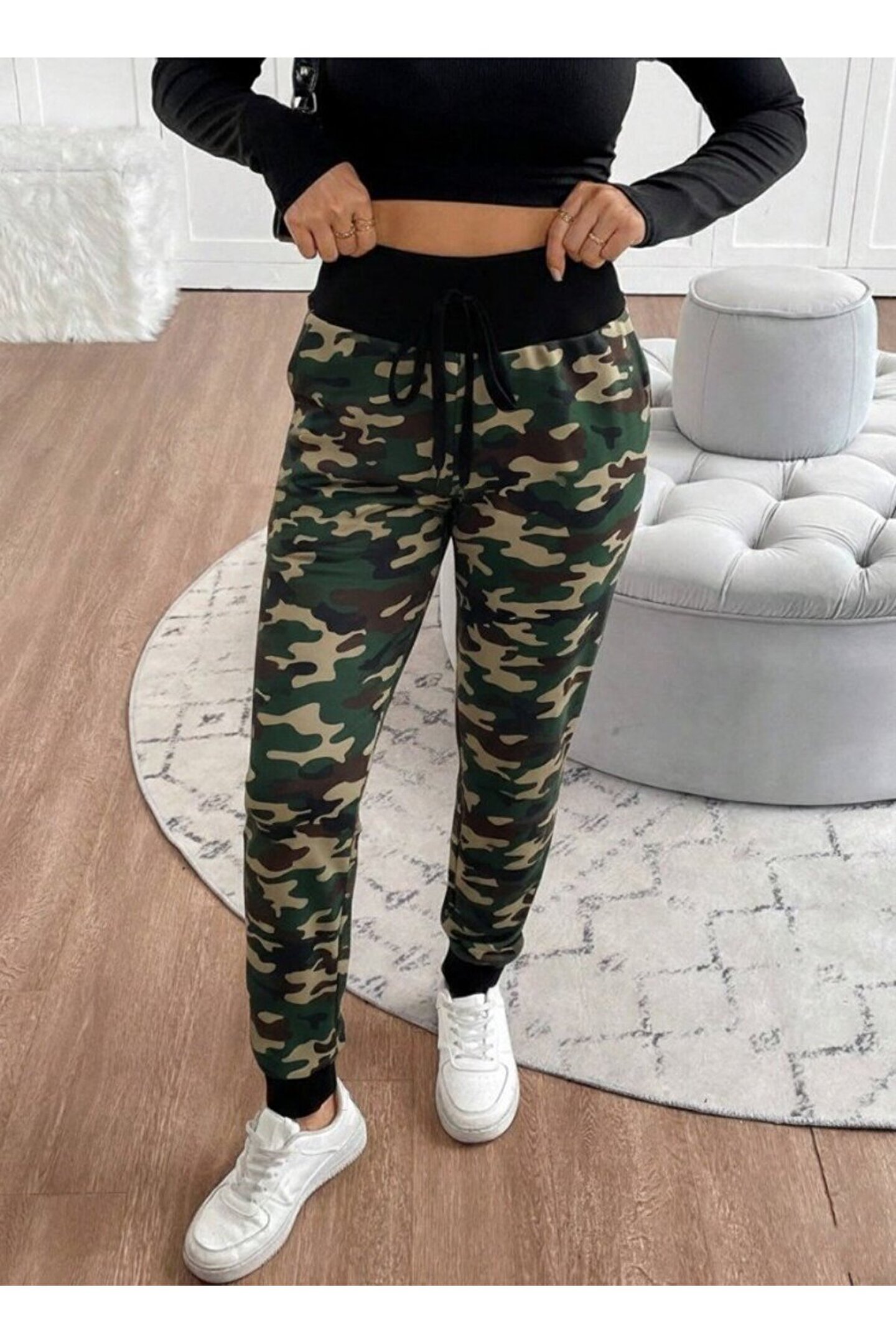 Kadın Yüksek Bel Bağcıklı Desenli Iki Iplik Pantolon