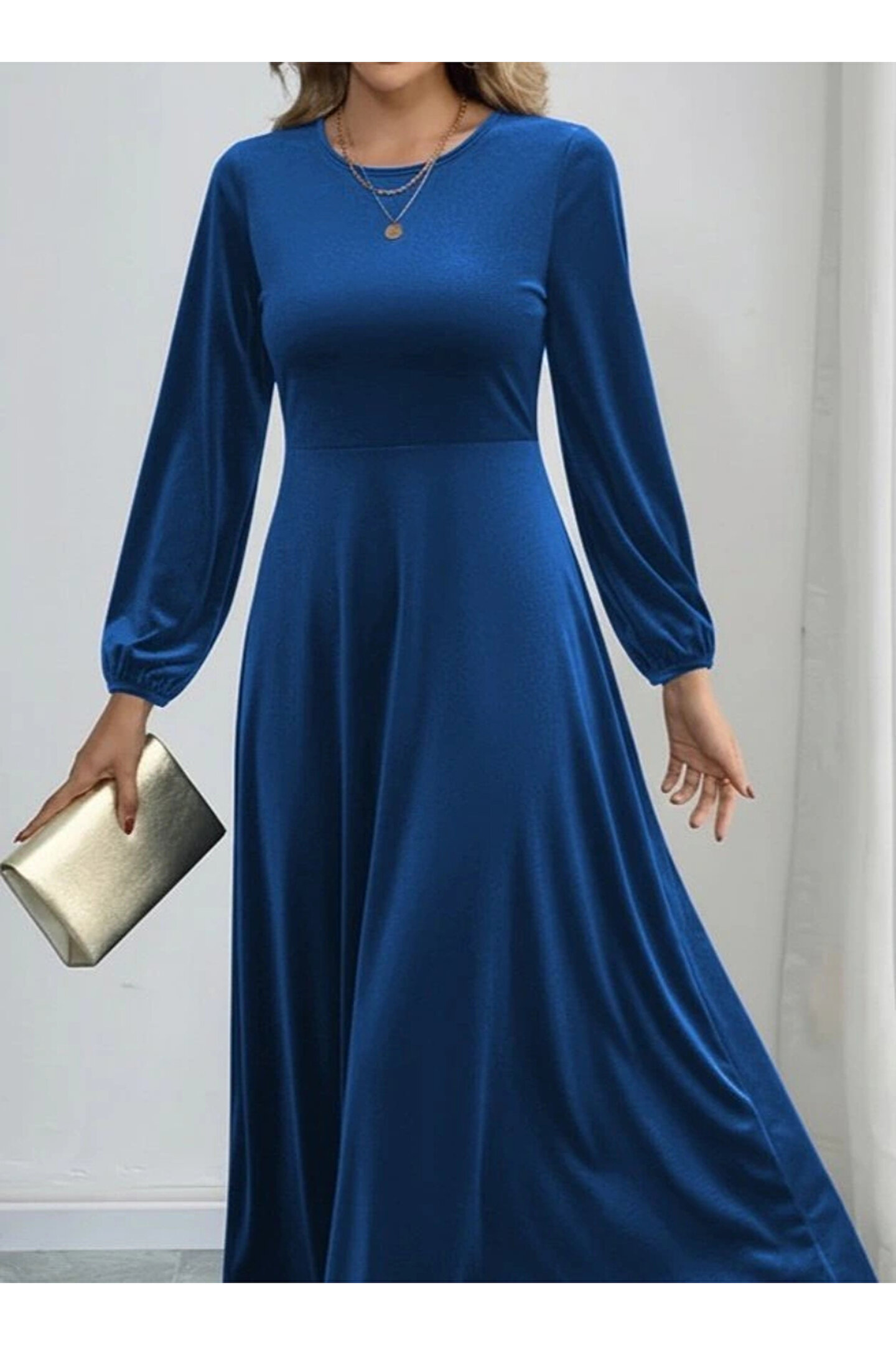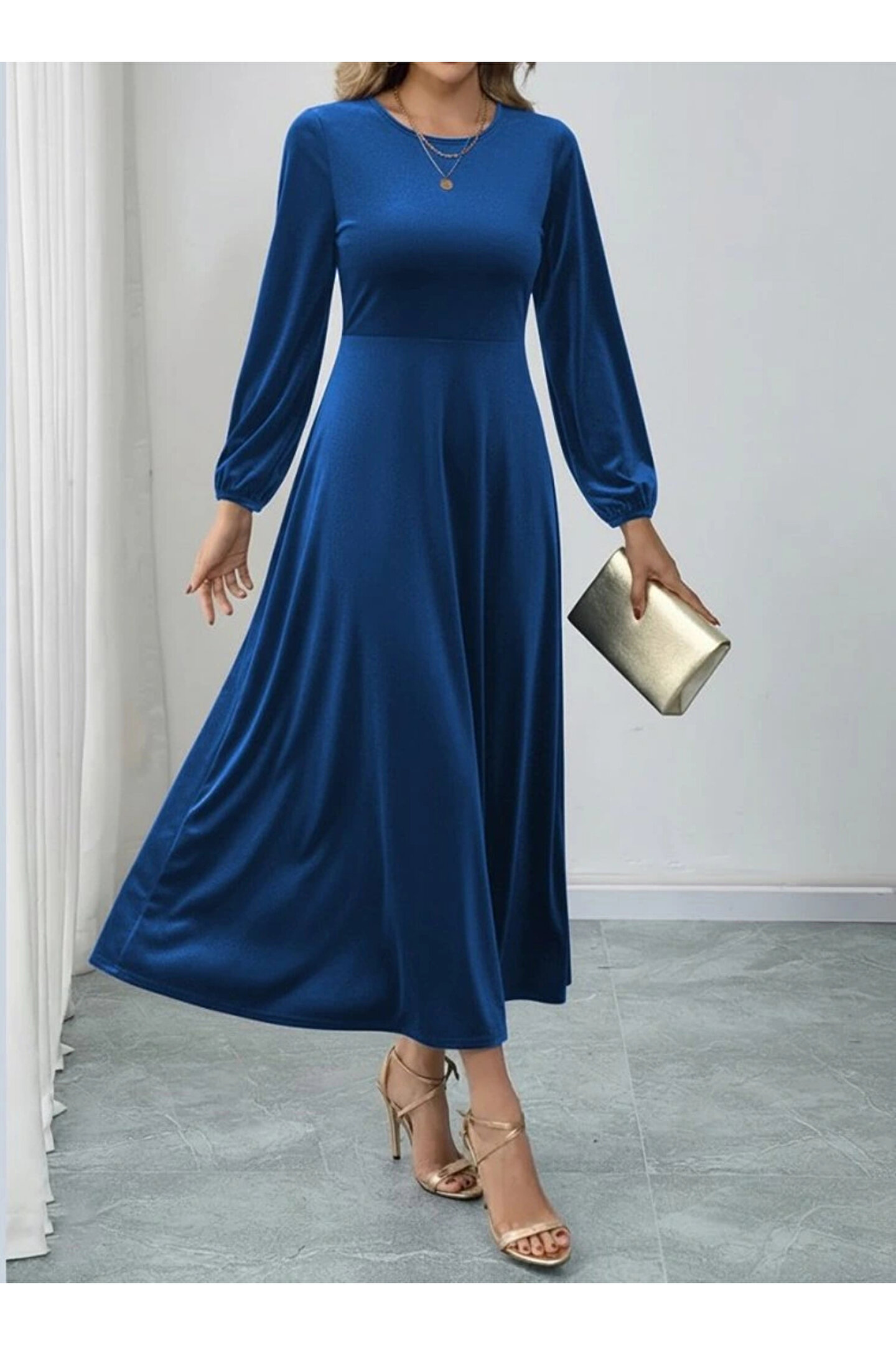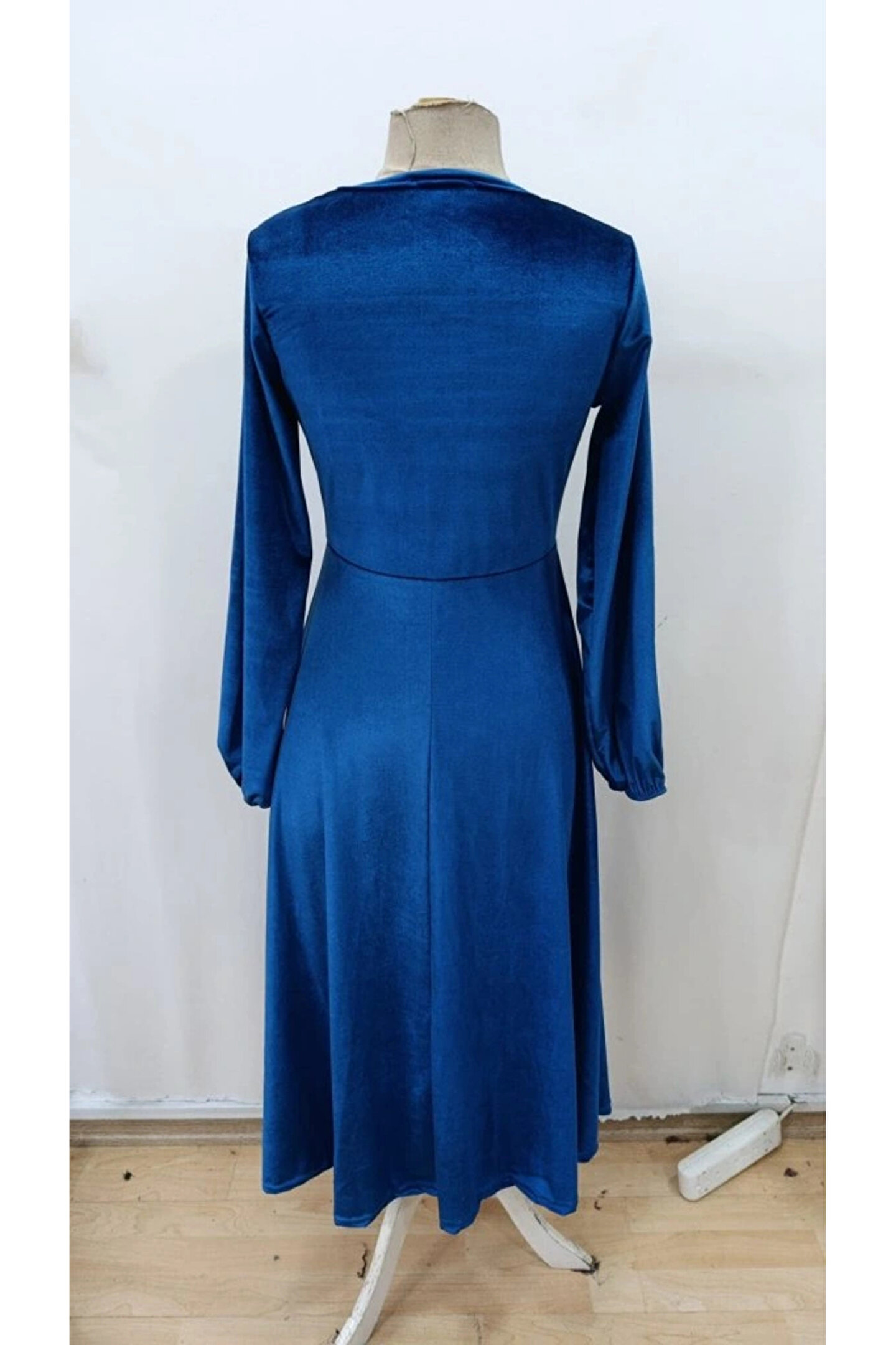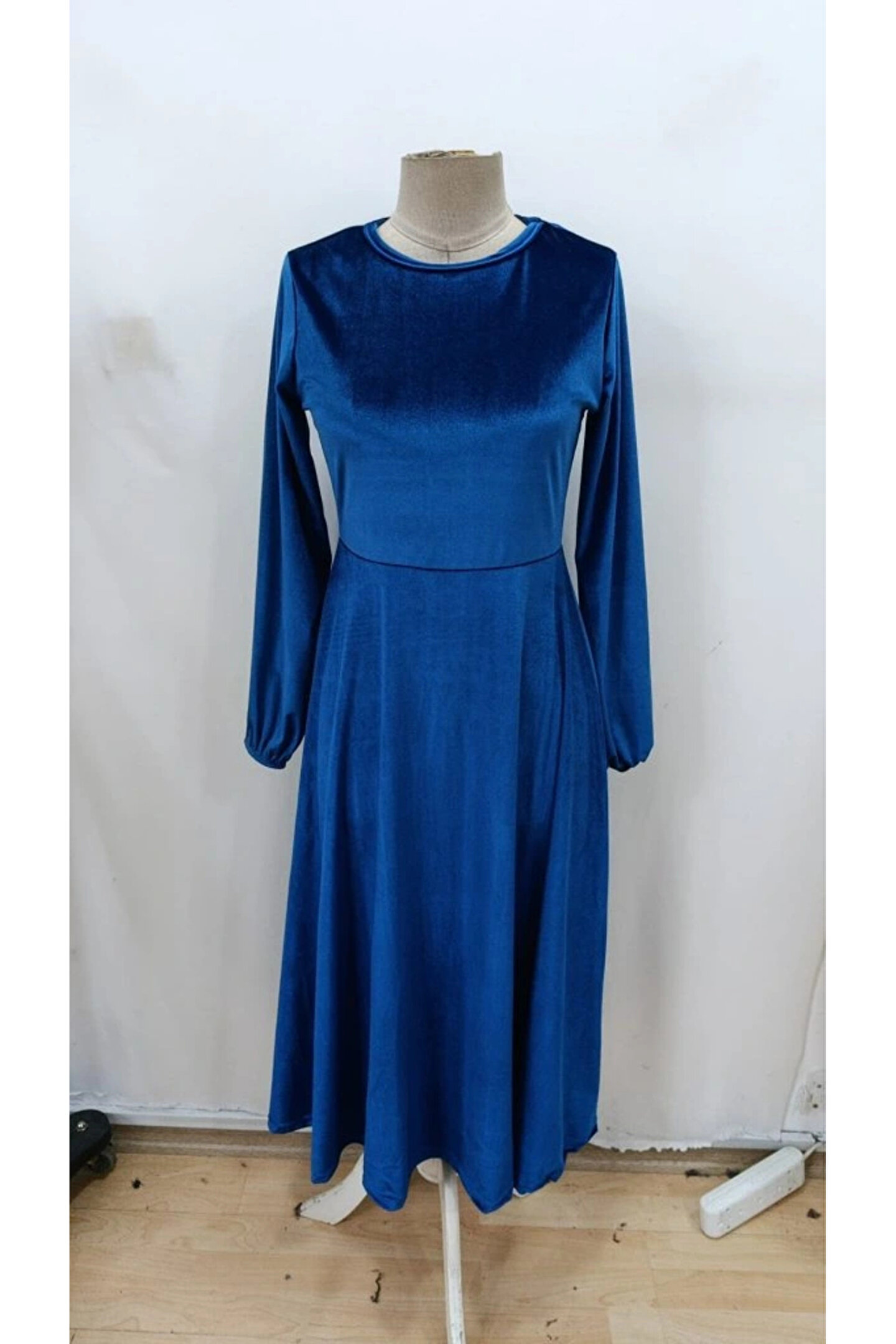 Kadın Uzun Kollu Bisiklet Yaka Midi Kadife Mavi Elbise
