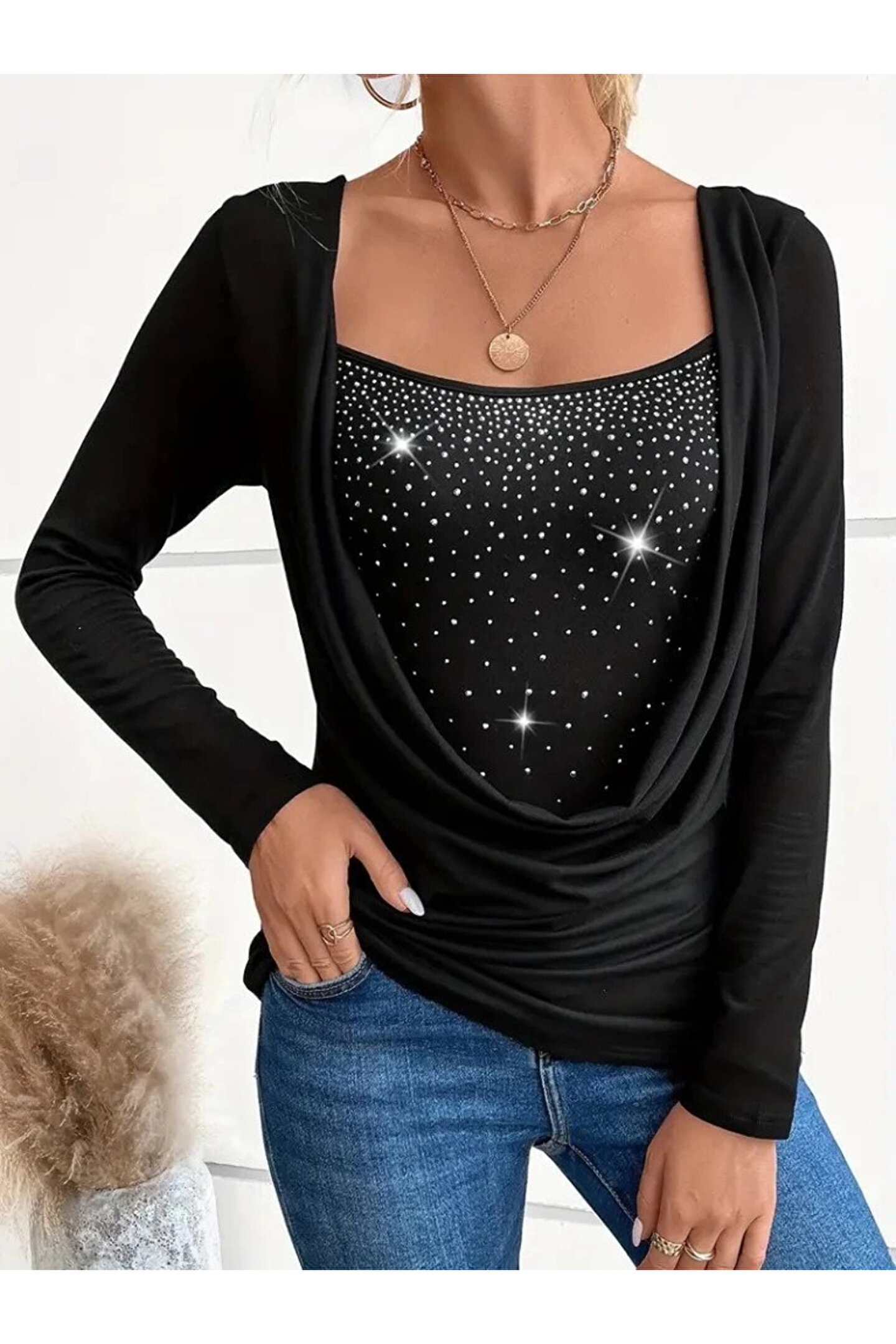 Kadın Uzun Kollu Derin Degaje Yakalı Taşlı Sandy Bluz