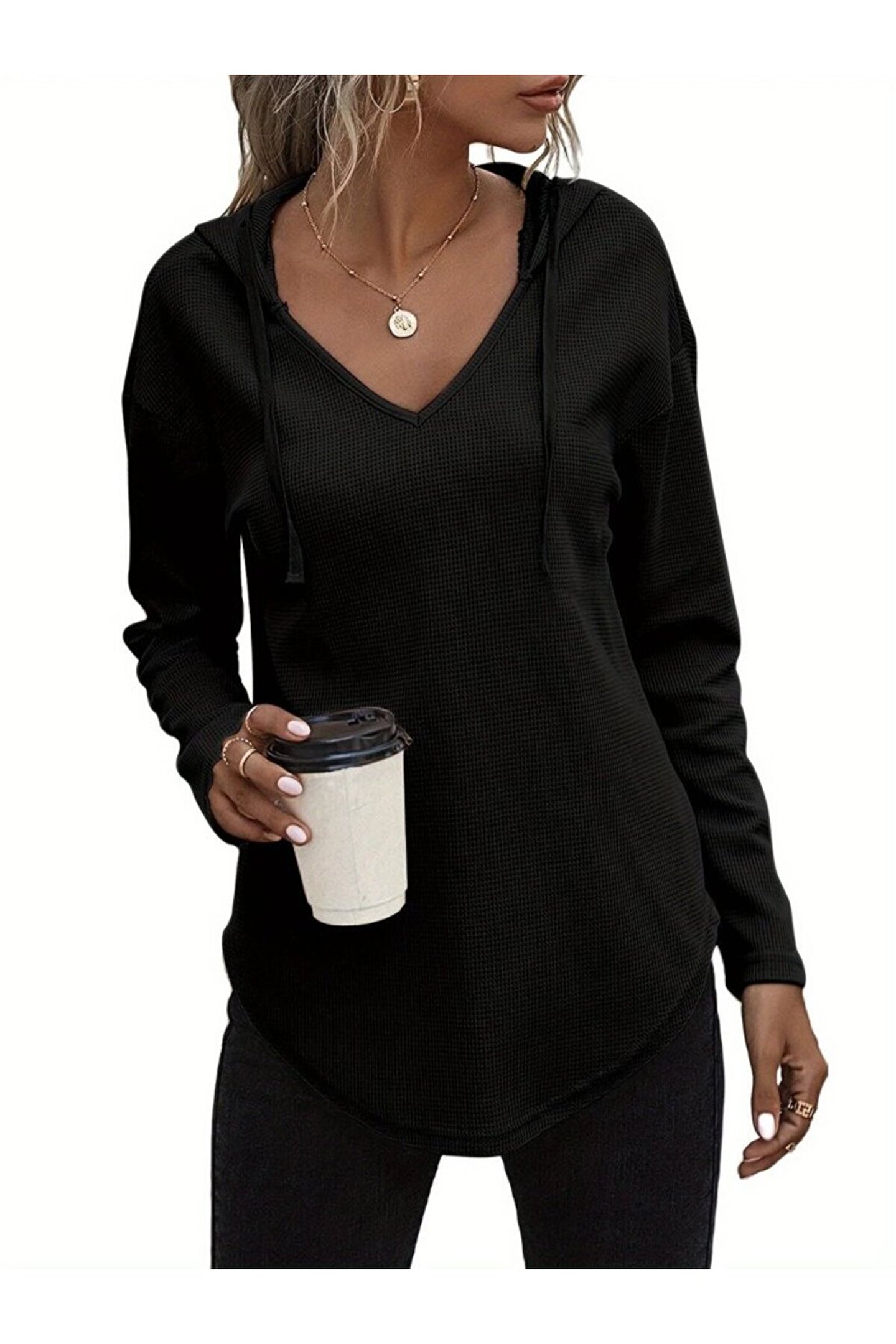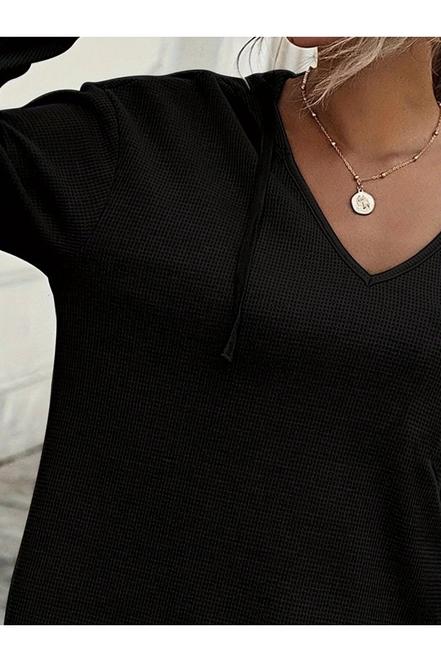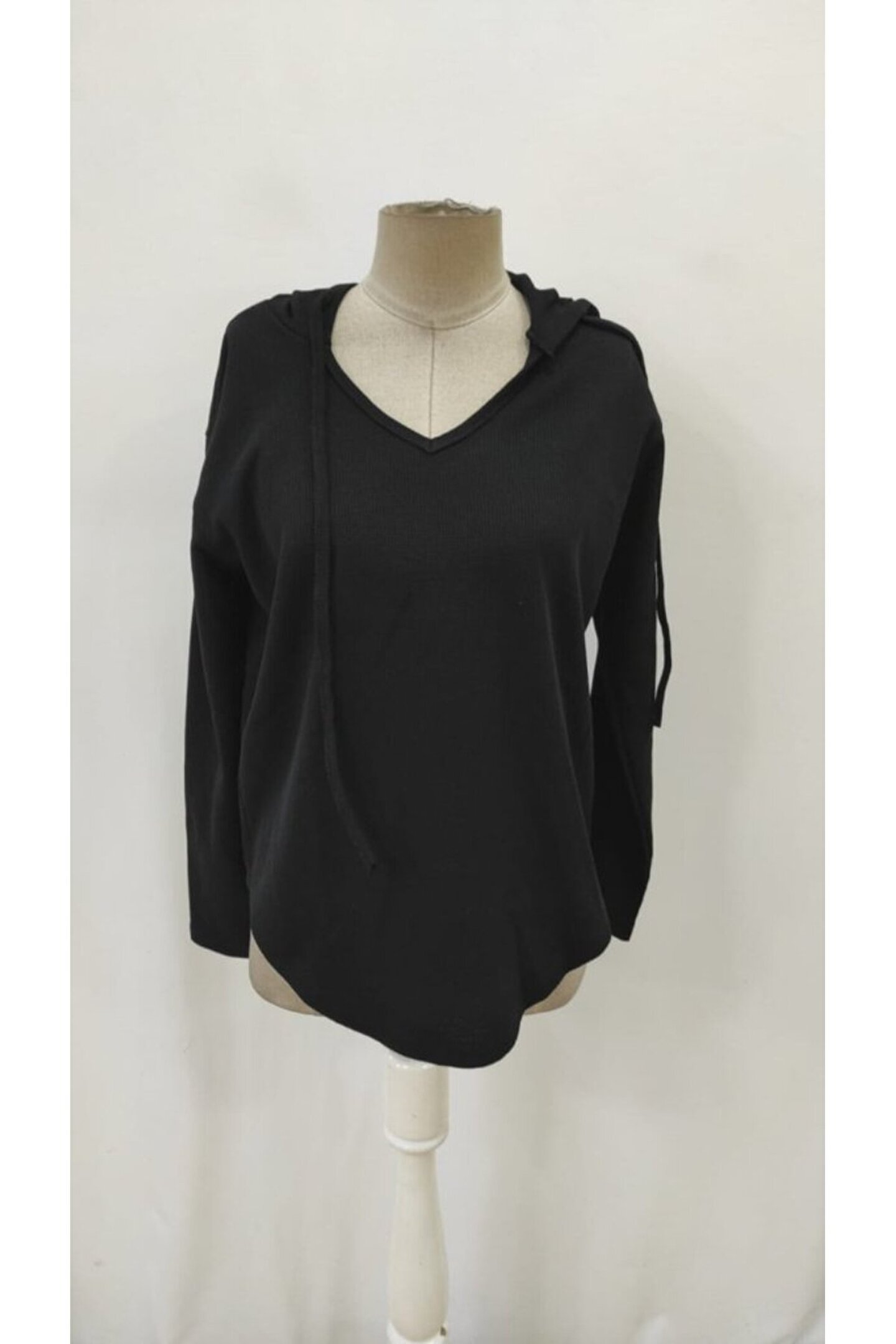 Kadın Uzun Kollu V Yakalı Kapşonlu Waffle Bluz
