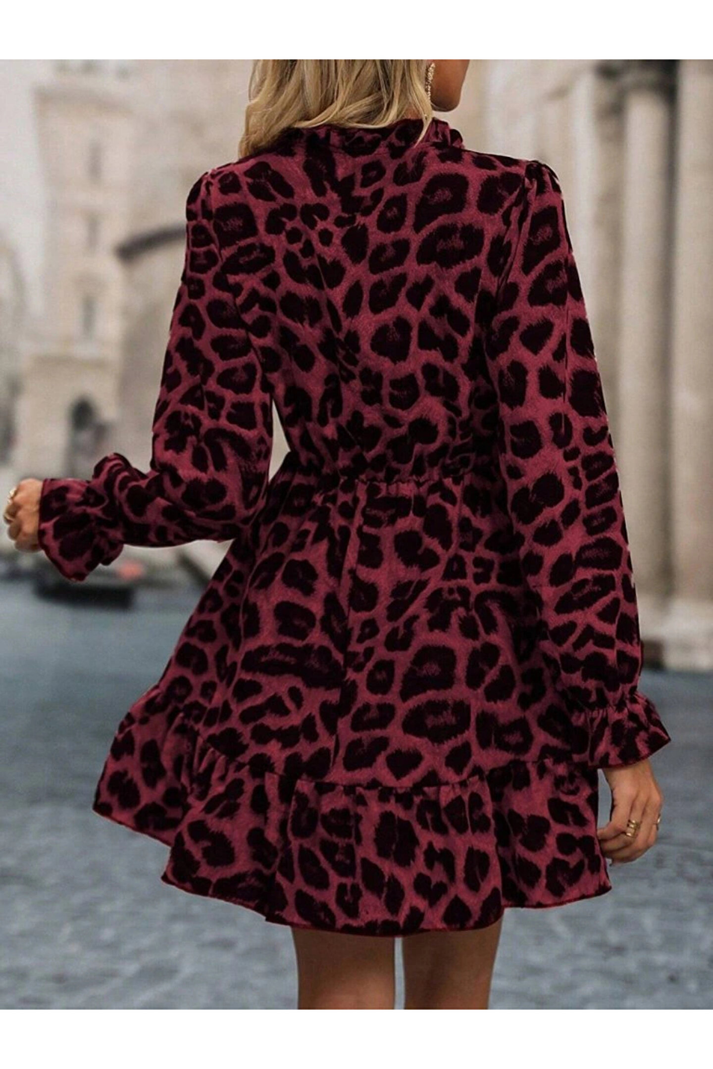 Kadın Uzun Kollu Yakadan Bağcıklı Modal Leopar Desenli Mini Elbise Stok Kodu: 174317