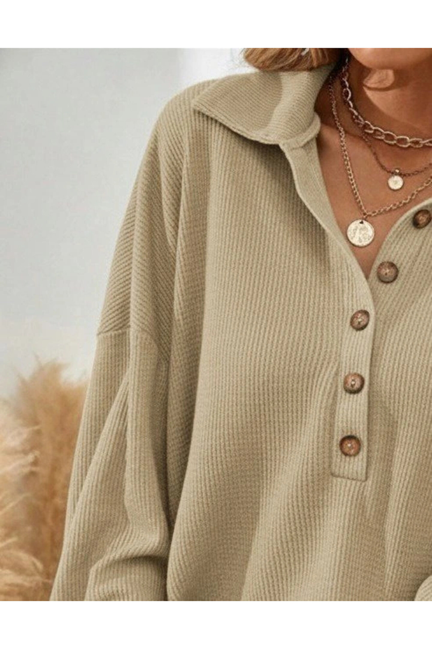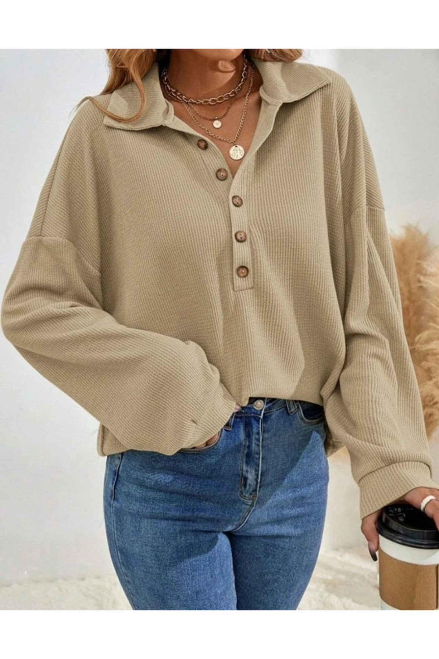 Kadın Uzun Kollu Yakalı Düğmeli Salaş Waffle Bluz