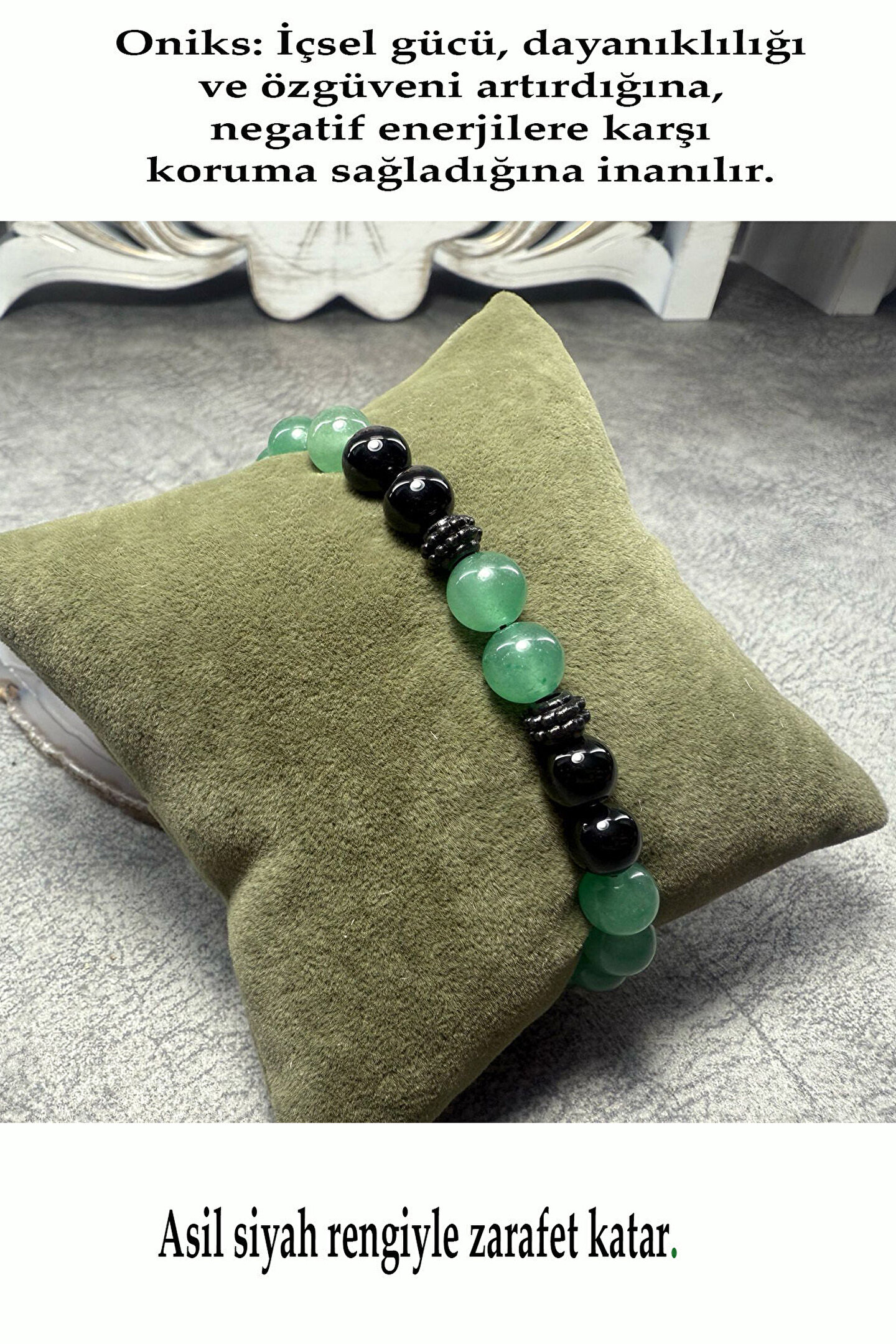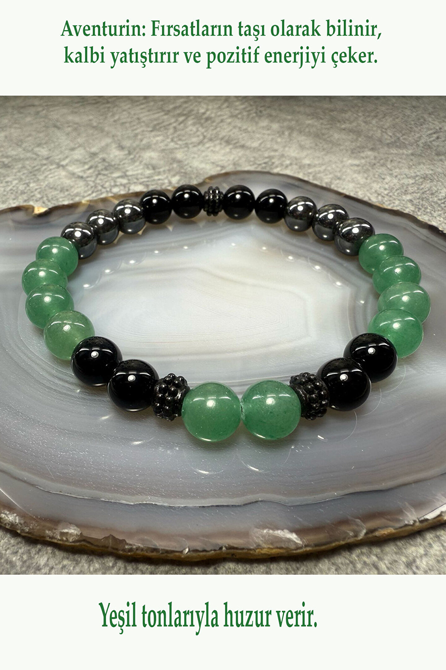 STRES BİLEKLİĞİ-%100 DOĞATAŞ BİLEKLİK-(ONİKS-AVENTURİN-HEMATİT BİLEKLİK) ; "Eşsiz bir enerji için Hematit, Aventurin ve Oniks doğal taş bilekliği.; Stresi azaltır, şansı çeker ve negatif enerjiden korur.; Ücretsiz kargo!" Hayatınıza denge, şans ve koruma katmak için özenle tasarladık! Hematit'in topraklayan gücü, Aventurin'in getirdiği şans ve bolluk, Oniks'in ise negatif enerjilere karşı kalkan oluşturan koruyucu etkisi bu eşsiz bileklikte bir araya geliyor.; Hematit: Zihinsel netlik, odaklanma ve stres azaltmaya yardımcı olduğuna inanılır.; Metalik parlaklığı ile gücü simgeler.; ; Aventurin: Fırsatların taşı olarak bilinir, kalbi yatıştırır ve pozitif enerjiyi çeker.; Yeşil tonlarıyla huzur verir.; ; Oniks: İçsel gücü, dayanıklılığı ve özgüveni artırdığına, negatif enerjilere karşı koruma sağladığına inanılır.; Asil siyah rengiyle zarafet katar.; ; Bu özel tasarım bileklik, hem günlük şıklığınızı tamamlayacak hem de size pozitif enerji, denge ve koruma sunacaktır.; Kendiniz için anlamlı bir hediye ya da sevdiklerinize enerjisi yüksek bir armağan arıyorsanız, bu bileklik tam size göre! Doğanın gücünü ve zarafetini bileğinizde taşıyın.; " Doğal taş bileklik-Enerji bilekliği- El yapımı bileklik-Kadın bileklik -Erkek bileklik-Unisex bileklik-Hediye bileklik-Özel tasarım bileklik ; Şans bilekliği Koruyucu bileklik Stres azaltan bileklik Pozitif enerji bilekliği Denge bilekliği Topraklama bilekliği Negatif enerji kalkanı bilekli