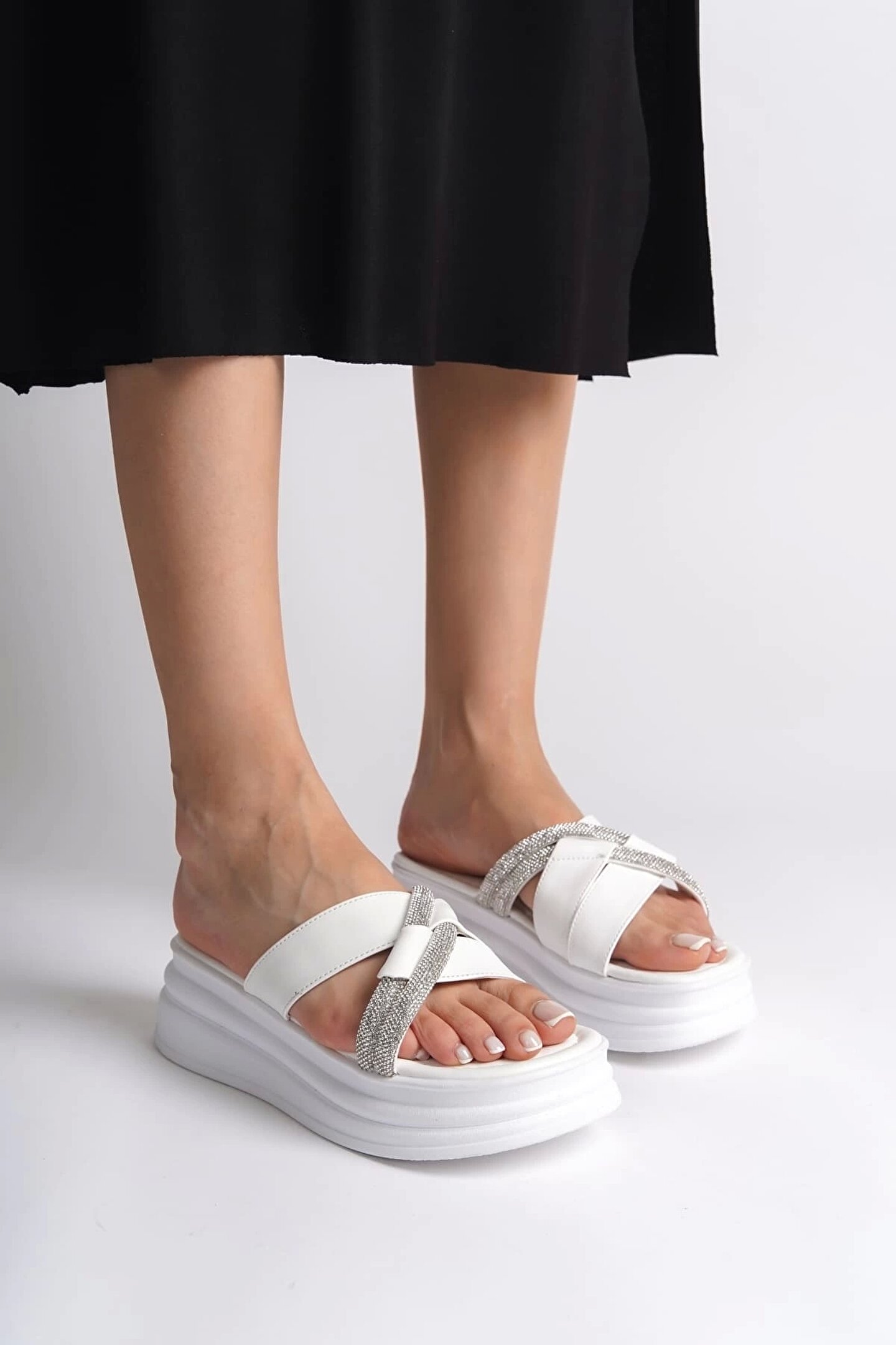 Joy Ayakkabı RUBY Düz Topuklu Taşlı Çapraz Şeritli Kalın ve Ortopedik Taban Kadın Terlik CBT - Beyaz