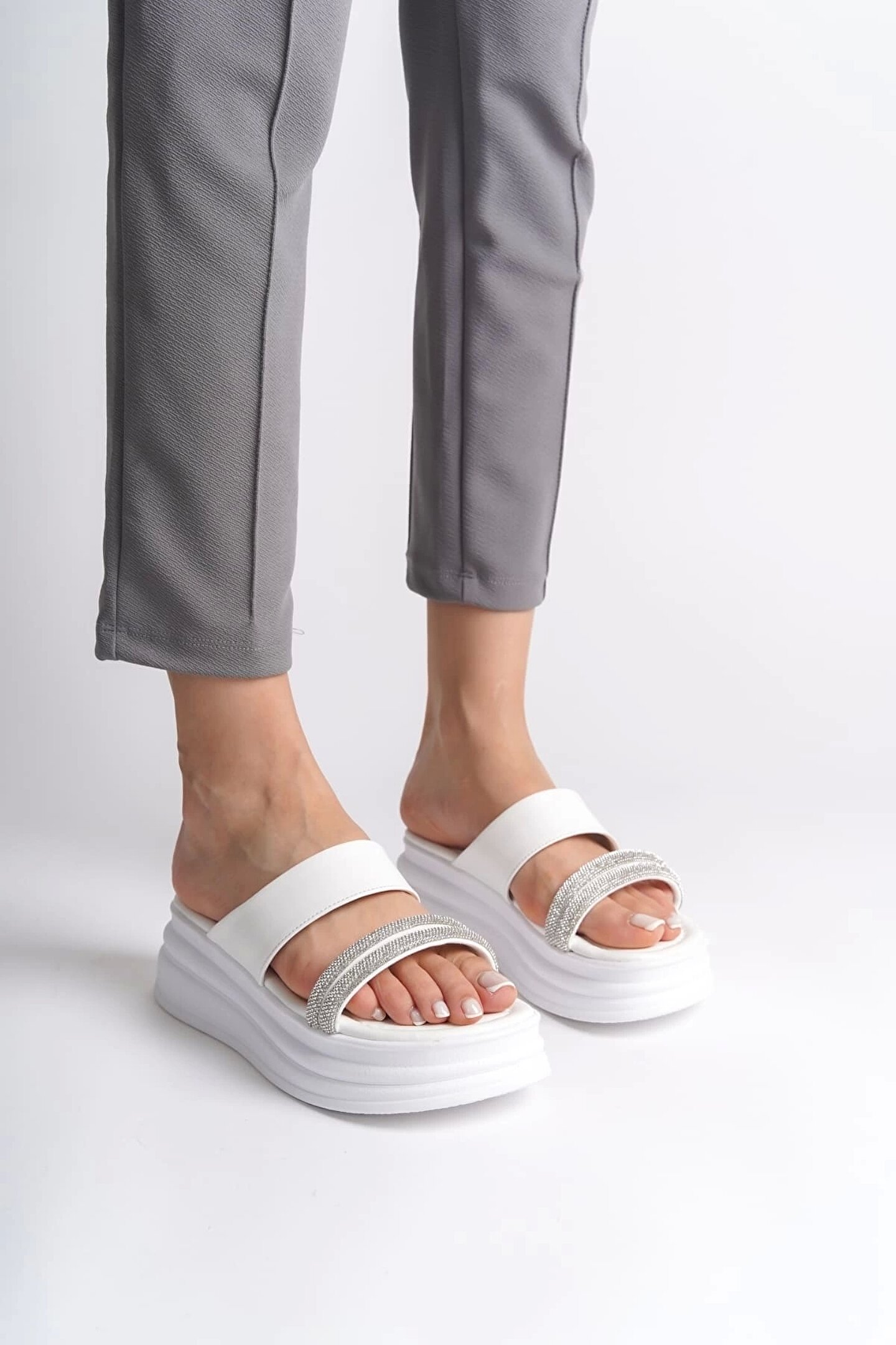 Joy Ayakkabı SARAH Düz Topuklu Taşlı Şeritli Kalın ve Ortopedik Taban Kadın Terlik CBT - Beyaz