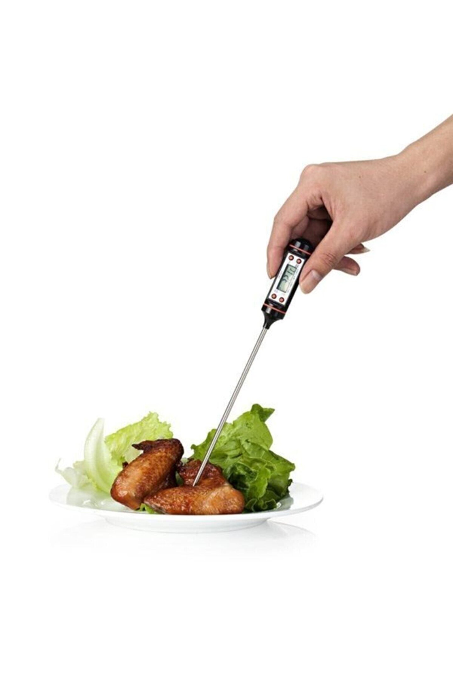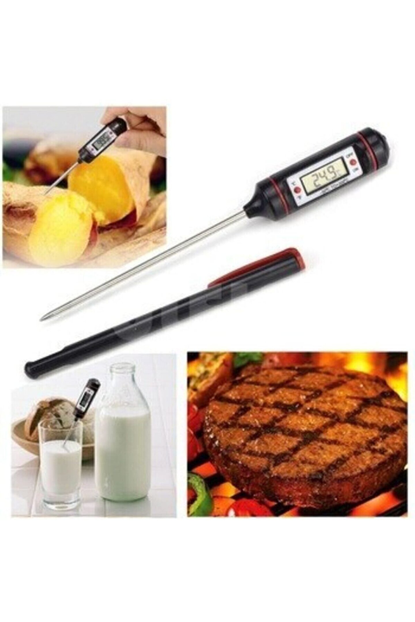 Yemeklerinizin, fırında belli bir ısıda pişmesi gereken yiyeceklerinizin istenen ısıda olup olmadığının kontrol edilmesinde, evde yoğurt yapıyorsanız ideal mayalanma ısısı olan 42 derecenin tutturulmasında, barbeküde pişen etin yanmadan istenen ısıda pişmesinin sağlanmasında, bebek mamalarının istenen sıcaklığa düşmesinin kontrolunda, ısıtılan suyun belli bir dereceye gelmesinin kontrol edilmesinde, dondurulmuş gıdaların ısısının kontrolünde, içeceklerin belli bir ısıda saklanıp saklanmadığının kontrolunda ve bunların haricinde sıcak, soğuk, sıvı veya katı bütün cisimlerin ısılarının kontrolünde sadece bir dokundurma veya daldırma ile kontrolünde en büyük yardımcınız olacaktır; ÖZELLİKLER: Geniş uygulama alanı Uzun paslanmaz çelikten sensör Geniş Isı Ölçüm Aralığı; 50 °C and 300 °C (58 °F to 572 °F) °C santigrad ve °F Fahrenhayt olarak ölçme imkanı 15 dakika kullanılmaması halinde Otomatik kapanma Düşük Pil seviyesi gösterimi Sensor hata gösterimi Önceki ölçüm hafızası Maksimum ve Minimum ölçümleri gösterme Saklama ve emniyetli kullanım için Plastik tüp muhafaza Specifications: Isı Ölçüm Aralığı:; 50 °C to 300 °C (58 °F to 572 °F) Hassasiyet: 0; 1 °C (°F) Doğruluk: (; 20 °C ~ 80 °C) ± 1°C Probe uzunluğu: 11cm (4; 5") Pil: 1; 5 V LR 44 Button Cell Pil (cihaz üzerinde mevcuttur);;