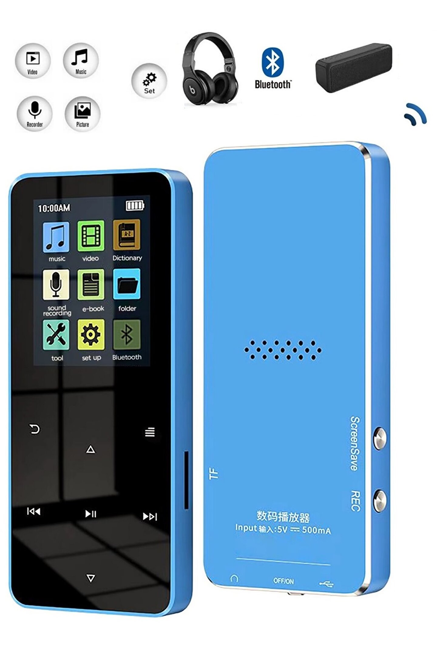 Açıklama: 1; 8 inç renkli ekran Kayıpsız ses kalitesi Bluetooth uyumlu 8 GB DAHİLİ HAFIZA Maksimum destek belleği 128G (dahil değildir) FM radyo E; kitap Özellikler: Sözlük Dahili hoparlör Çalar saat Çoklu dil desteği Video oynatma: AW/AVI (dönüştürülen video) BLUETOOTH KULAKLIK VEYA HOPARLÖR E BAĞLANILABİLİR BLUETOOTH İLE TELEFONA BAĞLANMAZ Paket içeriği: 1; MP3 müzik çalar 1; USB kablosu 1; kullanım kılavuzu 1; kablolu kulaklık;