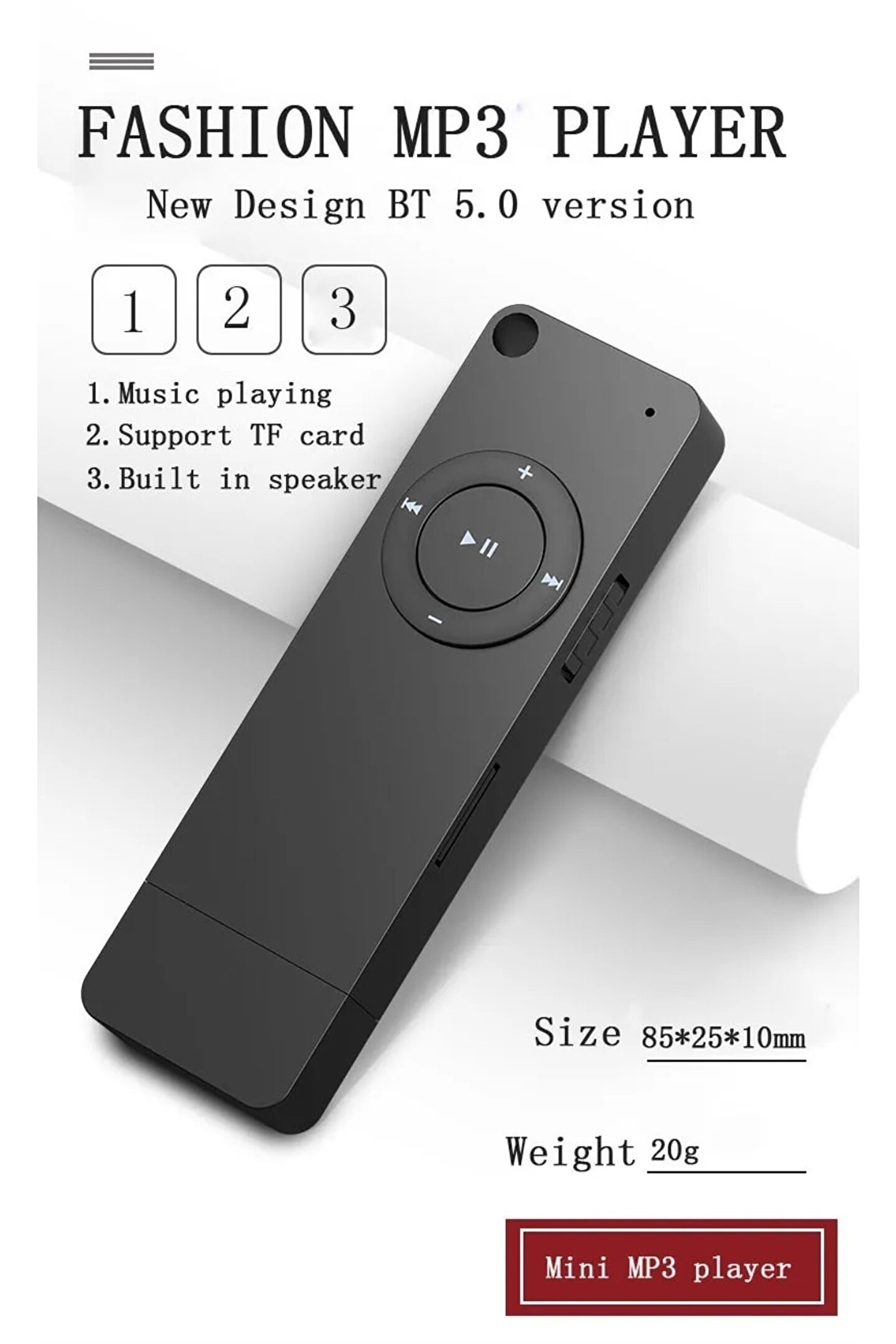 Not: yerleşik bellek yoktur. ; Bu yüzden ekstra bir TF kartı almanız gerekiyor. ; Özellik: 1. ; Dahili şarj edilebilir lityum pil, çeşitli şarj yöntemleri. ; 2. ; Harici bellek: 32GB TF kartına kadar destekler ve mikro SD / TF kart okuyucu (belleksiz) olarak da kullanılabilir. ; 3. ; Ses formatı: MP3 formatı. ; 4. ; Ayrıca MP3 ve çıkarılabilir depolama diski işlevi vardır. ; Özellikler: Arayüz: USB 2.0 Kulaklık jakı: 3.5mm Çalma süresi (saat): yaklaşık 7 saat Bekleme süresi (saat): 48 saatten fazla Çalışma modu: tuş Pil tipi: dahili lityum pil (dahili) Boyut: 8.5x2.5x0.9cm Paket İçeriği: 1 MP3 çalar (hafıza kartı olmadan) modeliMP302 btürün türüBT 5.0 ile mp3 çalarHafıza4GB,8GB,16GB, diğerleri (belleksiz)fonksiyon 1BT 5.0, dahili hoparlörişlev 2tek döngü, tek döngü, rastgele döngü, klasör değiştirmeRenkbeyaz, siyah, mavi, pembe, yeşildoğum yeriçin shenzhenÖlçü birimiParçaürün boyutu85*25*10mmDestek Ses formatıMp3Ağırlık20gtf sd kart desteği128MB-16GB-32GBpil150mAhÇalışma zamanı<10 saatAksesuarlarAmbalaj kutusu + Manuel + kulaklık;