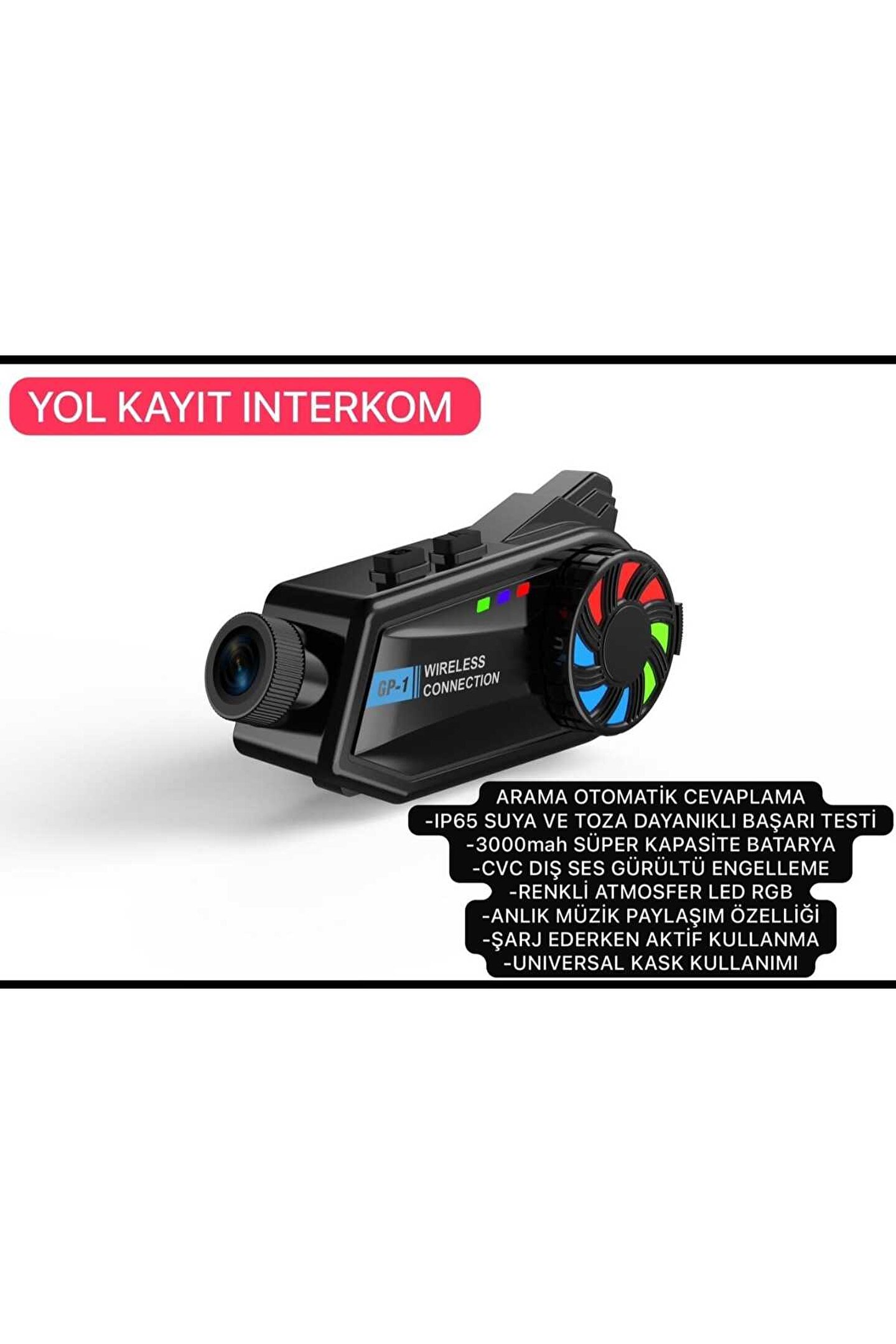 DİKKAT : CİHAZ KURULUMU; ŞARJ ETTİKTEN SONRA AÇMA TUŞUNA UZUN BASILI TUTUN KIRMIZI MAVİ IŞIK YANIP SÖNMEYE BAŞLAYINCA BLUETOOTH İLE TELEFONA BAĞLANABİLİRSİNİZ.; GOLOOK UYGULAMASINI TELEFONUNUZA İNDİRİN KAMERA TUŞUNA BASTIGINIZDA WİFİ AÇILIR TELEFONUNUZUN WİFİ AYAR KISMINDAN HİDVR_.; YAZAN BAĞLANTIYA BAĞLANIN ŞİFRE 12345678 DİR.; HAFIZA KARTI TAKIP KULLANILABİLİR.; TELEFON UYGULAMASI ÜZERİNDEN İZLENEBİLİR KAYITLAR TELEFONA İNDİRİLEBİLİR.; CİHAZIN KENDİNDE MİKROFON VARDIR SES VE GÖRÜNTÜ KAYDI YAPAR AYNI ANDA KAMERA TUŞUNA ÇİFT TIKLADIGINIZDA IŞIK MODLARI DEĞİŞİR.; BT68 Kameralı Motosiklet Bluetooth Kask Kulaklık ses kontrolü Dash kamera 1080P Video kayıt interkom Açıklama: Ürün adı: kask Bluetooth kulaklık Model: BT68 Bluetooth sürümü: 5.3 Pil kapasitesi: 1500mAh Bekleme süresi: 300 saat Çağrı süresi: 50 saat (kamera kayıt modu yaklaşık 6.5 saat) AI akıllı ses asistanı: evet Video kaydı: evet Fotoğraflar: evet Çözünürlük: 1960*1080P SD kart oynatma: evet (32-256G genişleme destekler) Gelen çağrıların otomatik cevaplanması için destek: evet Su geçirmez sınıf: IP65 Interkom fonksiyonu: hayır Uyumluluk: Android, iOS cep telefonu Daha fazla özellik: 360 derece rotasyon, 120 derece geniş açı, WIFI bağlantısı, APP, Uygulanabilir kask tipi: yarım kask, modüler, motokros, açık yüz, tam yüz, kask yukarı çevirmek, evrensel Özel fonksiyon: ses kontrolü, evrensel eşleştirme fonksiyonu, su geçirmez, gürültü azaltma Güç kaynağı modu: dahili pil Bağlantı modu: bluetooth