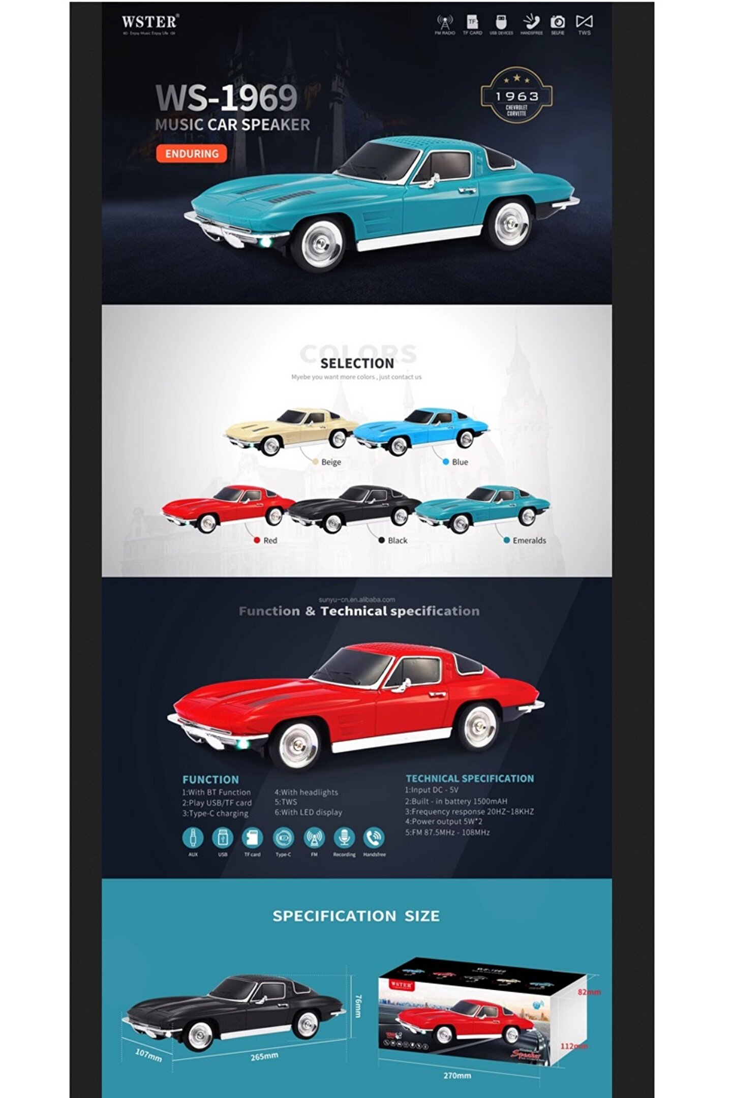 • Estetik ve İşlevsellik Bir Arada: WS-1969'un şık tasarımı, 1969'un klasik araba modellerine özgü detayları içerir. İnce detaylarla bezenmiş kaplaması, metalik dokunuşları ve dikkat çekici renkleriyle her ortamda göz kamaştırır. Bu hoparlör, sadece dışarıdan değil aynı zamanda içeriden de güçlü bir performans sunar.