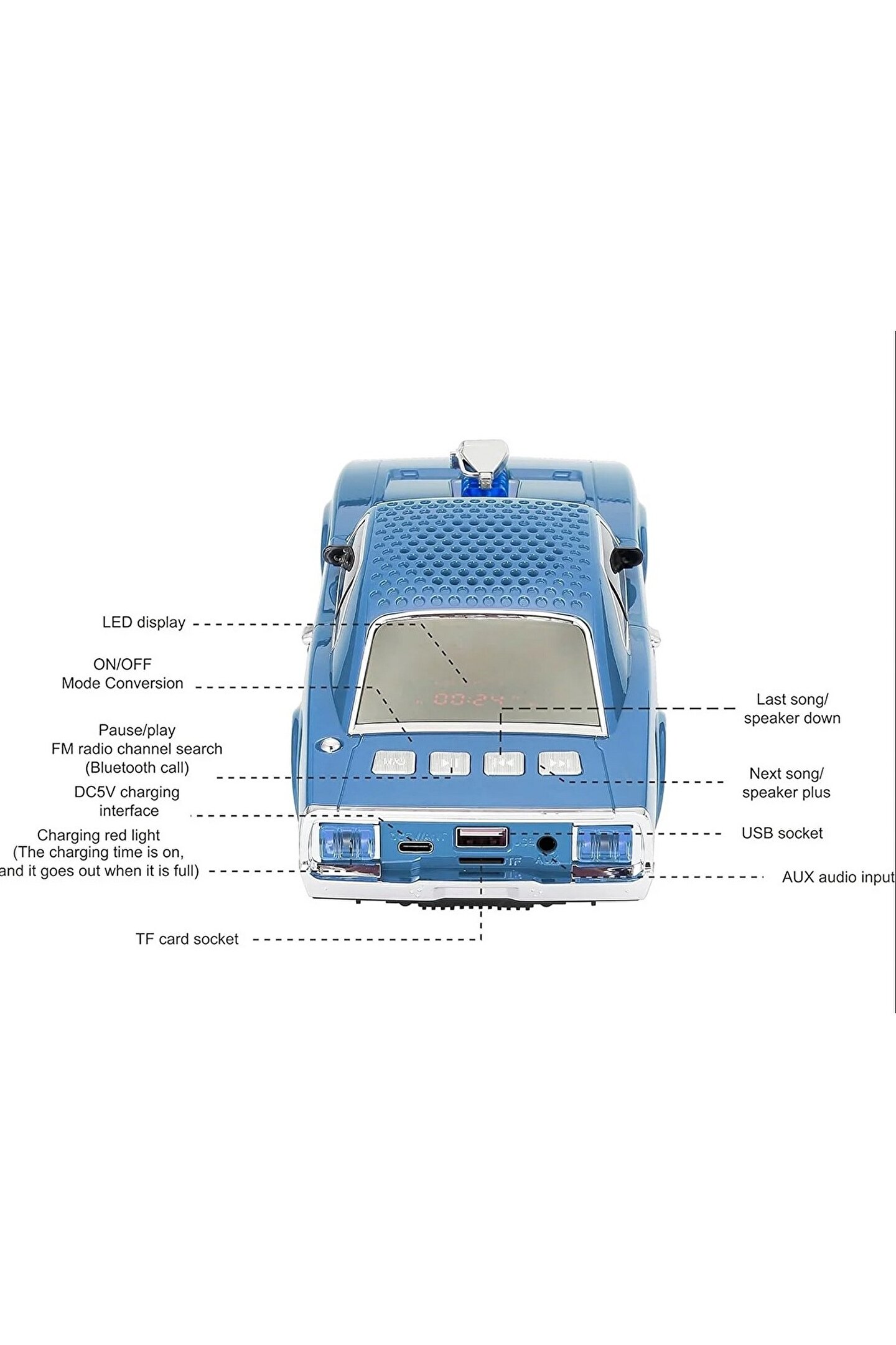 WS-1968 Dodge Challenger araba şekilli kablosuz Bluetooth hoparlör TF USB FM Handsfree ile TWS LED ekran LED ışık Bir spor araba görünümü ile bir bluetooth hoparlör, neredeyse her şey var. Örneğin, sıradan küçük hoparlörlerden çok daha iyi bir hoparlör olarak iyi bir ses kalitesine sahiptir; Örneğin, bir ev dekorasyonu olarak, güzel bir şekli ve küçük bir boyutu vardır; örneğin, bir oyuncak olarak, lastikleri yuvarlanabilir ve zeminde çalışabilir. Bu bizim çok fonksiyonlu ürünümüz, kablosuz hoparlör, şimdi deneyin! Ürün detayları * Dahili pil kapasitesi: 1500mah * Güç kaynağı voltajı: 5 volt * Çıkış gücü: 2*5 W * Boynuz: 2*52MM 4Omega 10W harici manyetizma * Frekans yanıtı: 100-18Khz * Bluetooth çözümü: bölüm 5.0 Destek Bluetooth 5.0 + müzik çalma ve telefon + zamanlayıcı Hacim anahtarlar tarafından kontrol edilebilir. Şarj talimatları, 90-120 dakika oynanabilir hoparlörler Destek TF kartı, U disk Derin bas LED LLight TWS Ses bağlantı teli ve USB güç kablosu bir arada FM radyo: 88-108 Renk: siyah, beyaz, kırmızı, mavi, açık mavi Birim ağırlığı: 584g Birim boyutu: 271*102*75mm
