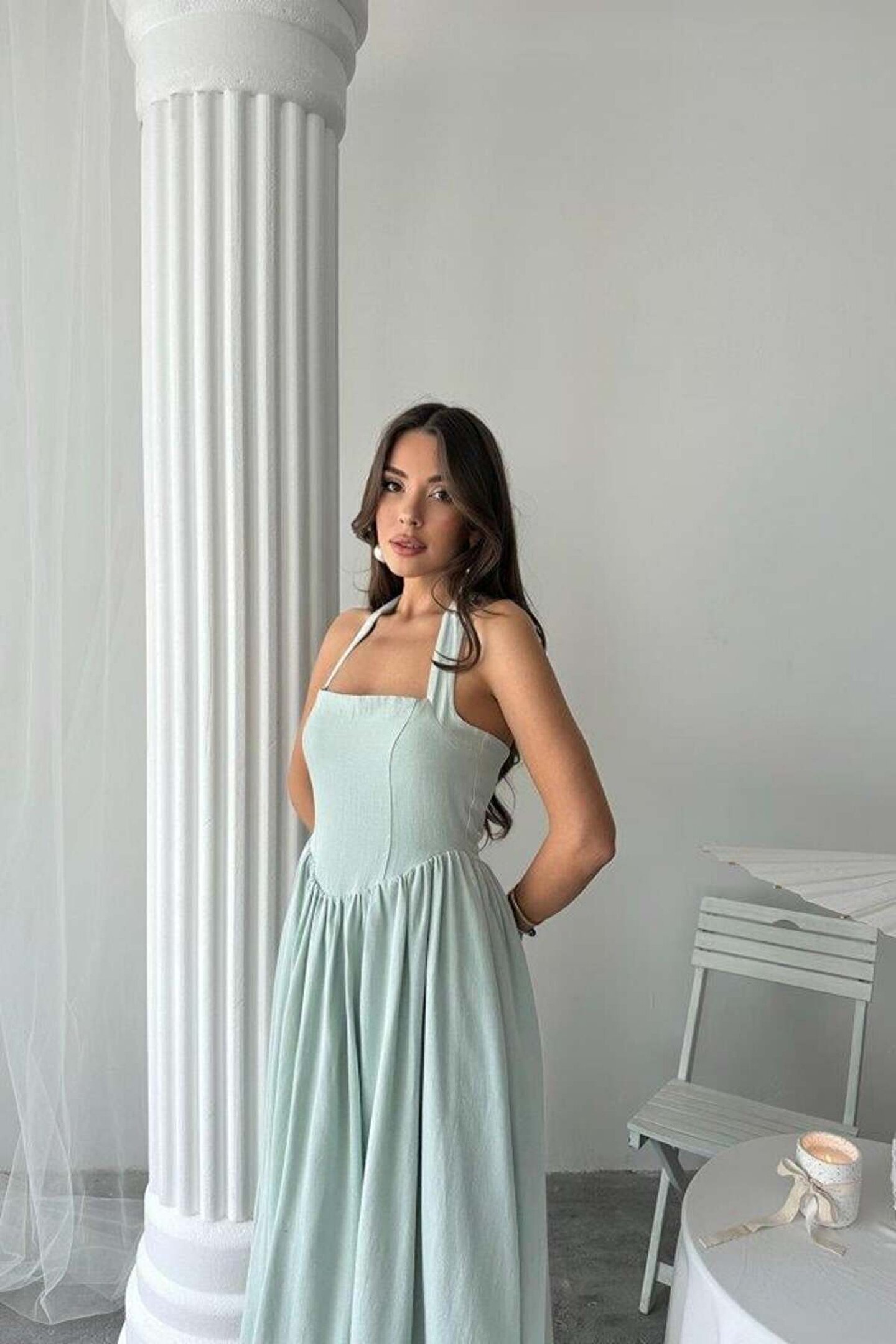 Mint Boyundan Bağlamalı Keten Elbise