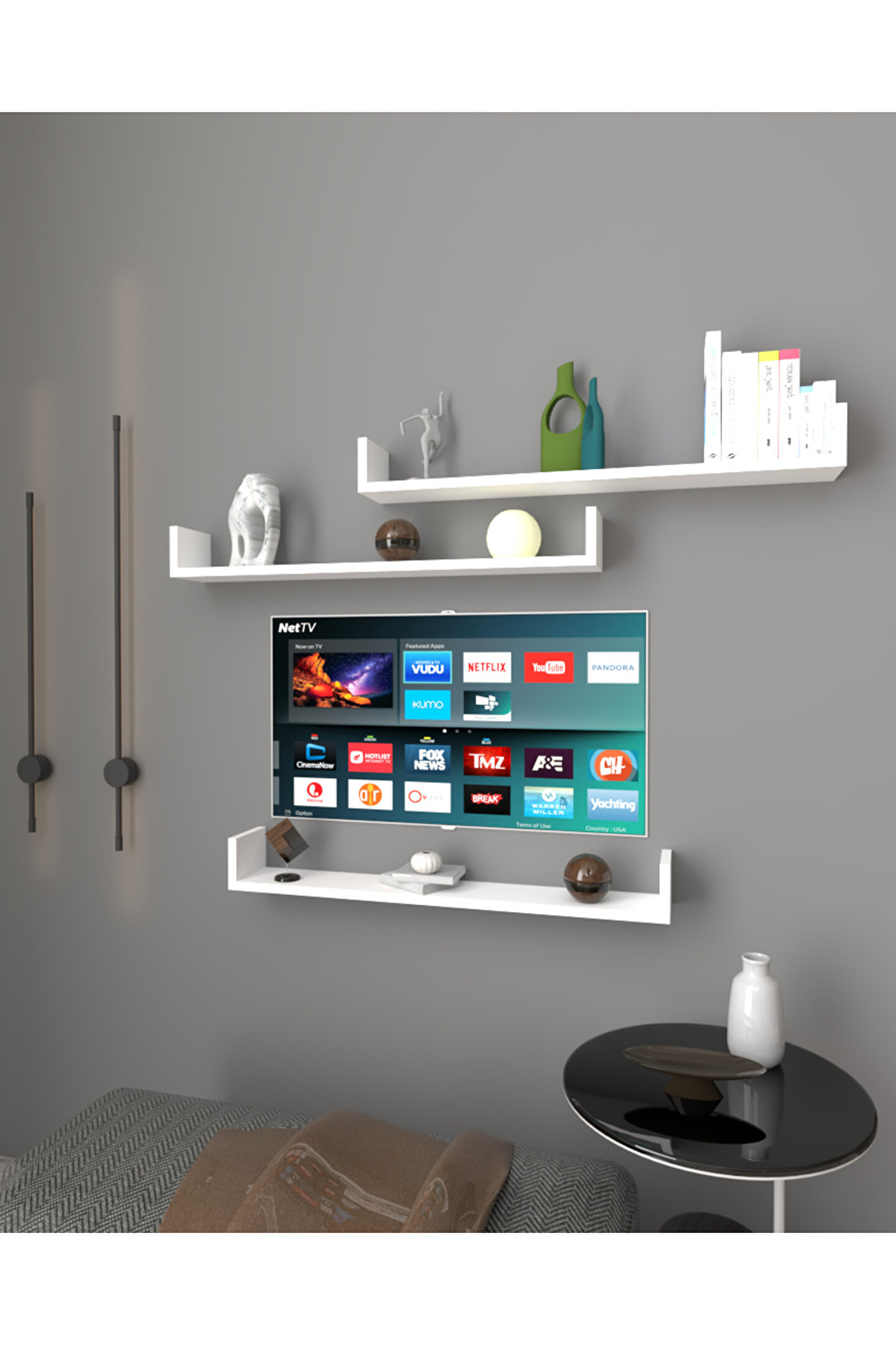 Üçlü Uçan Raf - Tv Rafı - Duvar Rafı - Kitaplık Rafı - Beyaz