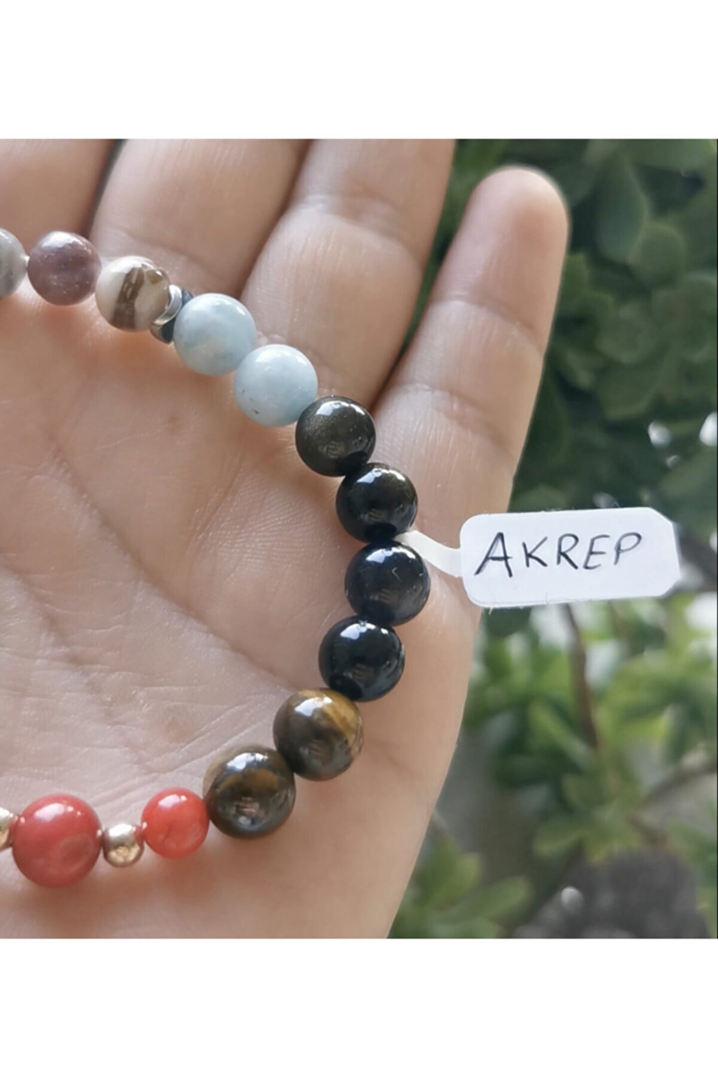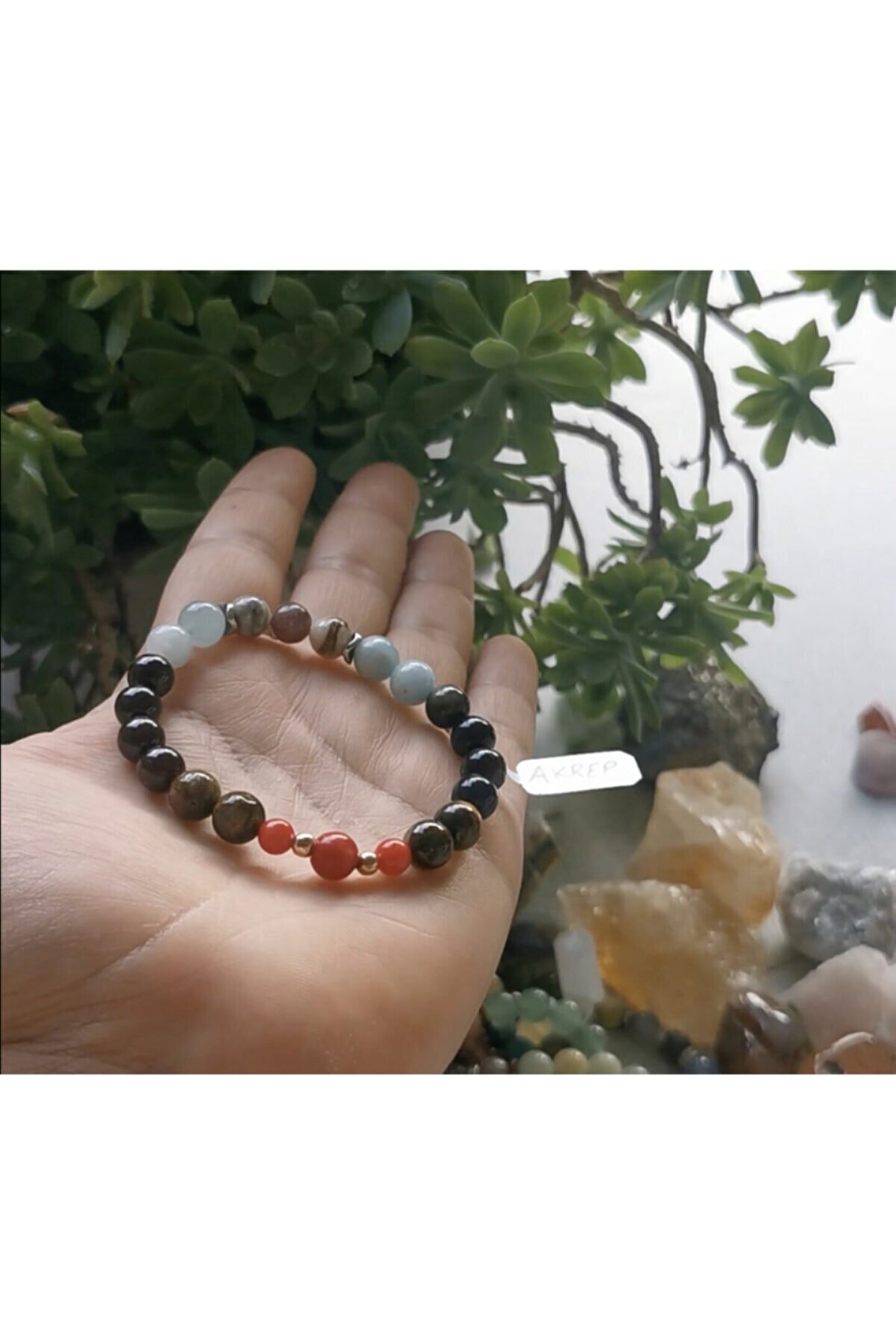 KAM Doğal Taş Takı AKREP Burcu %100 Doğal Taş Bileklik AKREP Burcu Bilekliği, AKREP burcunun özellikleri dikkate alınarak AKREP burcuna özel olarak seçilmiş taşlar ile oluşturulmuştur %100 doğal taşlar ve doğal malzemeler kullanılarak özel olarak üretilmiştir. AKREP Burcu Taşları; Akuamarin 4, Opal 2, Garnet 4, Kaplan Gözü 4, Obsidyen 4, Yakut 1, Mercan 3 adet. Ürünlerimizin tamamı %100 doğal taşlar ve doğal malzemeler kullanılarak üretilmiştir. (Plastik, tahta, silikon boncuklar kesinlikle kullanılmamıştır.) Ürünler sizlere gönderilmeden önce sirkeli suda bekletilmekte ve temizlenmektedir. Özenle paketlenerek paket içerisinde ihtiyacınız olabilecek malzemeler ile hazırlanmaktadır.