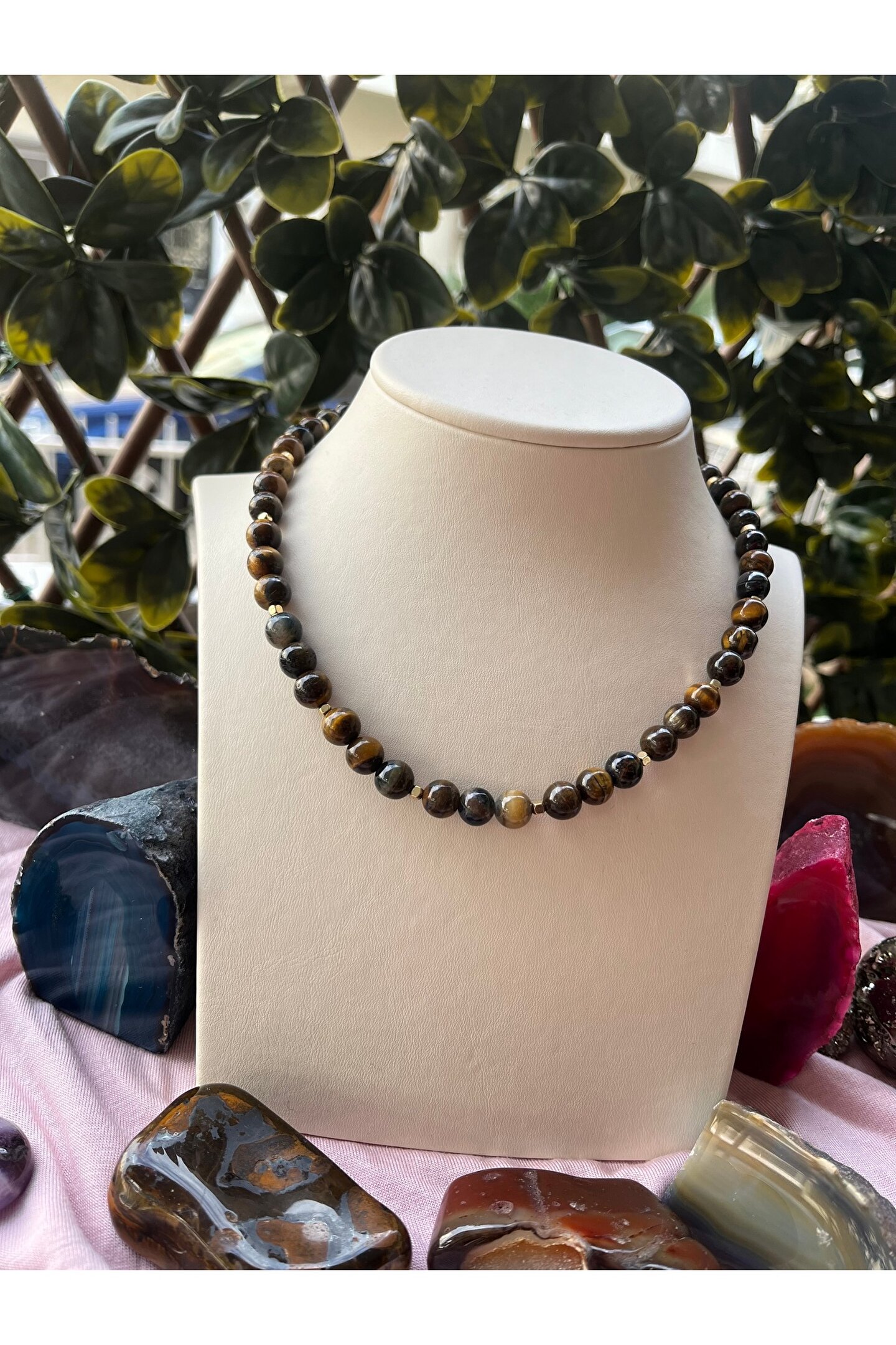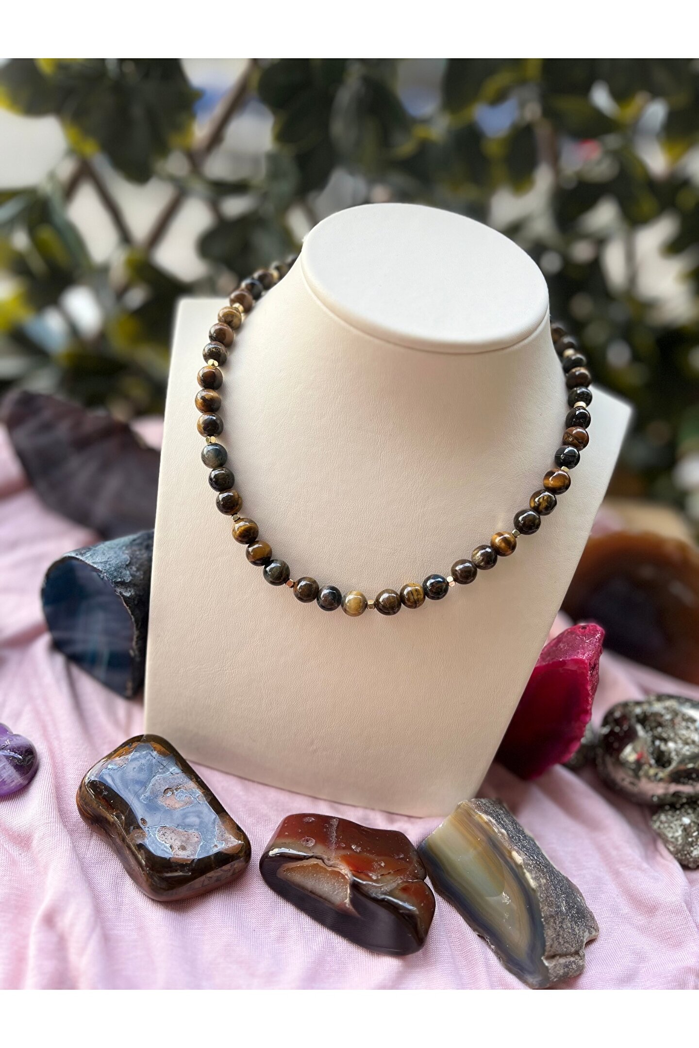 Kaplan Gözü Taşı Doğal Taş Kolye 40 cm Kaplan Gözü Doğal taşlar arasında olan kaplan gözü taşı, kalsedon grubunda yer alan bir taştır. ; Mavi, kırmızı, pembe ve benzeri farklı renkleri bulunur. ; En sık olarak sarı ve kahverengi tonlarının karışımından oluşan kaplan gözü taşı ile karşılaşılır. ; Parlak, hafif yağlı bir görüntüye sahiptir. ; Üzerinde koyu renkli şeritler vardır. ; Bunlar, demir minerallerinin etkisiyle meydana gelir. ; Genellikle cesaret, güç ve güven ile ilişkilendirilir, bu da onu kişisel güçlerini artırmak ve engellerin üstesinden gelmek isteyenler arasında popüler bir seçim haline getirir. ; Kaplan Gözü Taşı'nın zihinsel berraklığı ve odaklanmayı teşvik ettiği, bireylerin akıllıca kararlar almalarına ve hedeflerine odaklanmalarına yardımcı olduğu da bilinmektedir. ; Genel olarak, bu taş kişinin hayatına denge ve uyum getirme kabiliyetiyle büyük saygı görür ve bu da onu kristal şifa dünyasında değerli bir değerli taş haline getirir. ; Kaplan Gözü Taşı Özellikleri : Kaplan gözü kişiye azim, denge, cesaret ve sezgisel yetenekleri arttırmada güç verir. ; Motivasyon sağlar ve hem iç hem de dış huzuru ortaya çıkarmada destek olur. ; Korku, kıskançlık gibi duyguları dengelemeyi sağlar. ; Endişe ve stres gibi faktörlerin üstesinden gelmek için faydalıdır. ; Halk arasında göz ve nazardan koruduğuna inanılır. ; Bu yüzden küçük çocukların yastıklarının altına konur. ; Kaplan gözü mantığı ve cesareti yansıtır. ; Bu taş ile çalışmak yaratıcılık önündeki blokajları kaldırmak faydalı olur. ; Duyguları ve zihni dengelerken, zekâ ve sezgileri keskinleştirir. ; Astrolojik olarak savaşçı özellikleriyle bilinen Mars gezegeniyle ilişkilidir. ; Kaplan gözü fiziksel olarak sindirim sistemiyle ilişkilidir. ; Astım hastalığına iyi gelir. ; Görme duyusunu hem fiziksel hem de içsel olarak güçlendirir. ; Olaylara daha net ve dengeli bakmayı sağlar. ; Baş ağrılarına karşı etkilidir. ; Kuvars grubu taşlarından olan kaplan gözü, yine kuvars grubundan sitrin, kristal kuvars gibi taşlarla kullanılabilir. ; Böylece iki taşın da etkisi desteklenerek artacaktır. ; Örneğin kahverengi jasper taşı ile birlikte kullanılan kaplan gözü, jasper taşının bilge ve şifacı özelliklerini pekiştirerek kişiyi şifalandırmak, beslemek ve korumak için muhteşem bir ikili oluşturur. ; Kaplan Gözü Taşının Burcu: Kaplan gözü taşı, ikizler, akrep, oğlak, yengeç burcudur. ; Çakrası alt karın çakrasıdır. ; Kaplan Gözü Taşının Temizliği: Kristallerin kullanılmadan önce ve düzenli aralıklarla temizlenmesi önerilir. ; Böylece taşın enerjisini temizleyebilirsiniz. ; Kaplan gözü taşını temizlemek için dört yöntem vardır: Kristalinizi toprağa gömüp bir gece boyunca bekleterek arındırabilirsiniz. ; Kristalinizi bir tütsü yardımıyla arındırabilirsiniz. ; Bu ürün KAMBA tarafından gönderilecektir.;