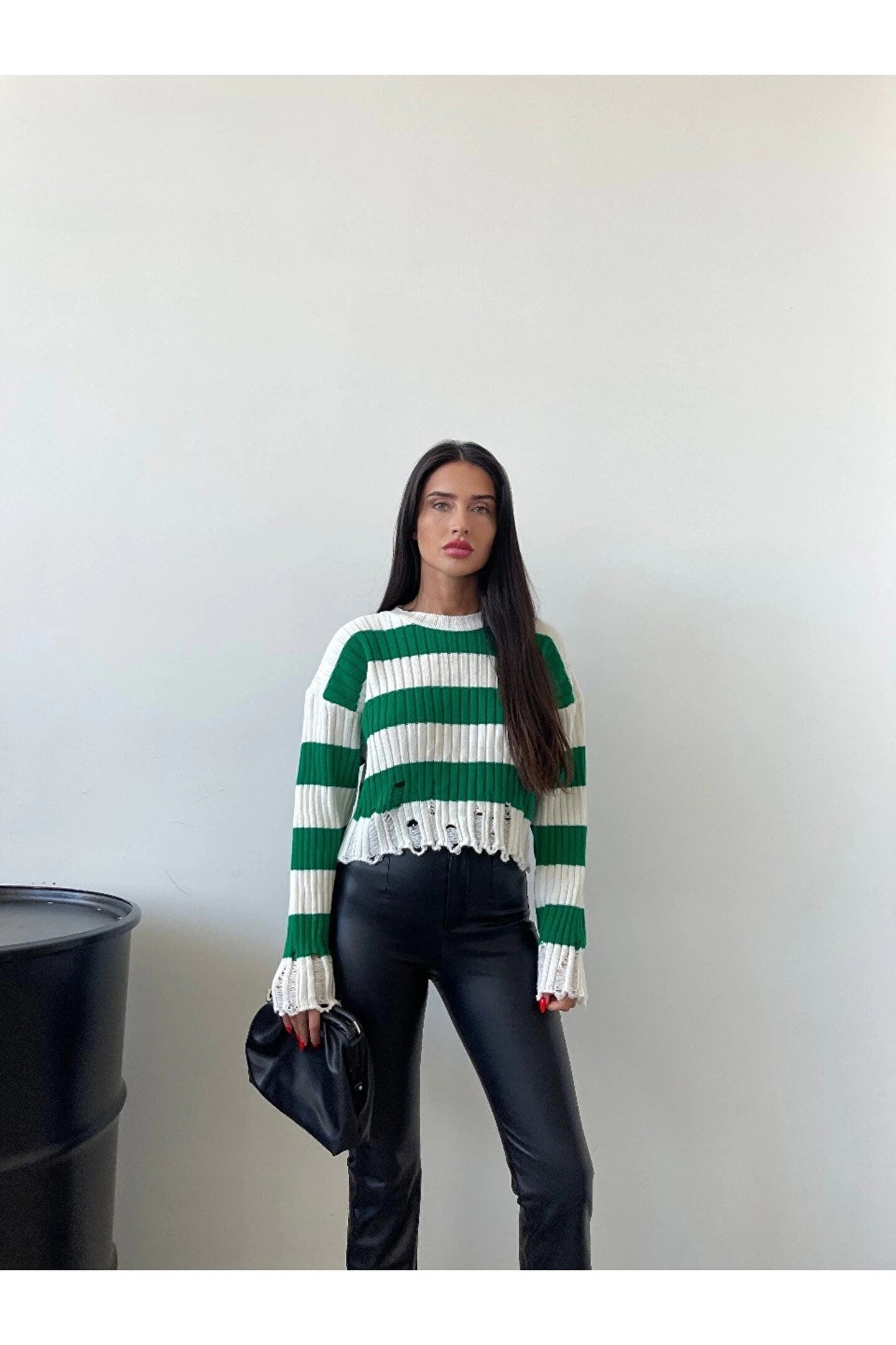 KarşıVitrin Yeşil Çizgili Yırtık Detaylı Triko Kazak
